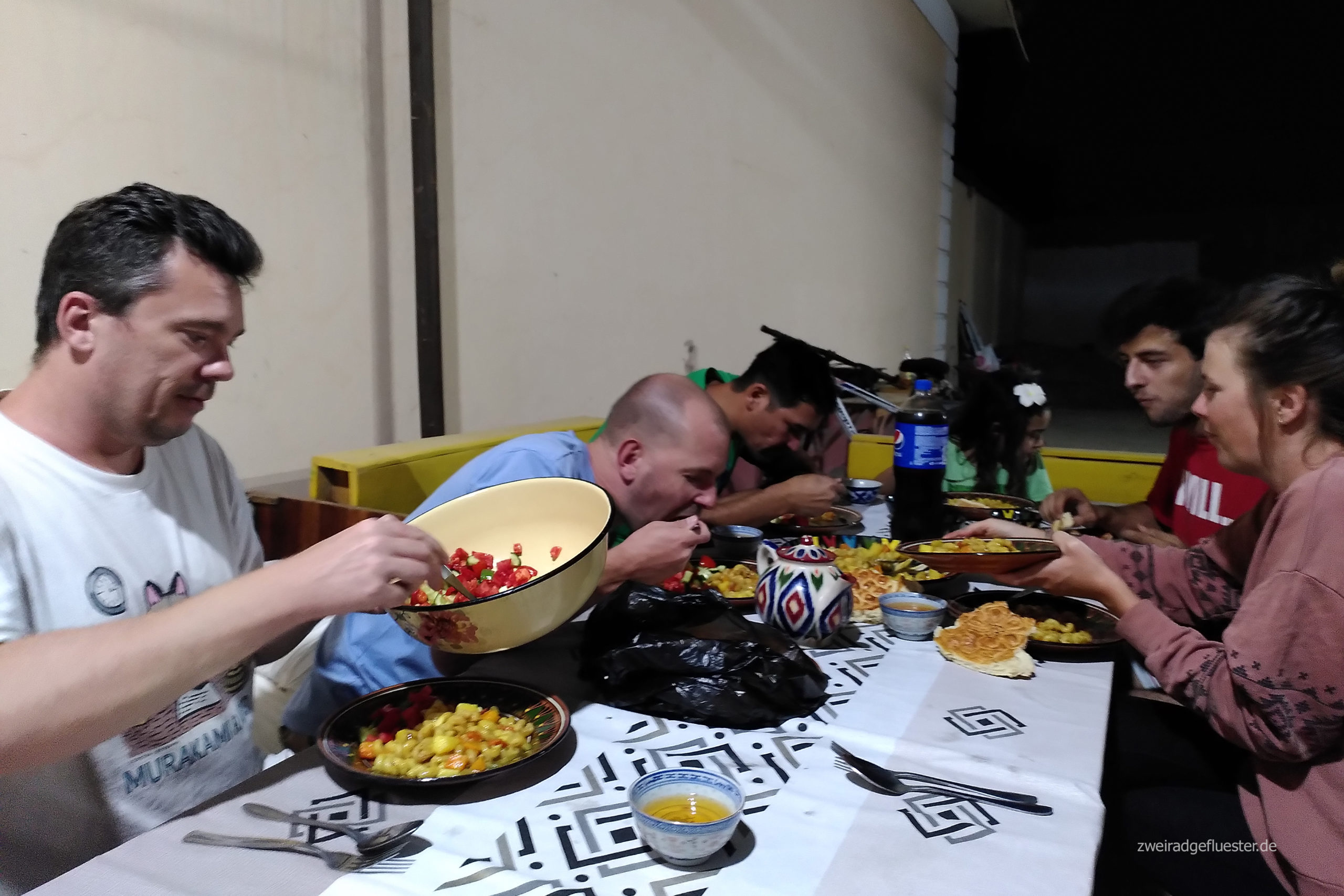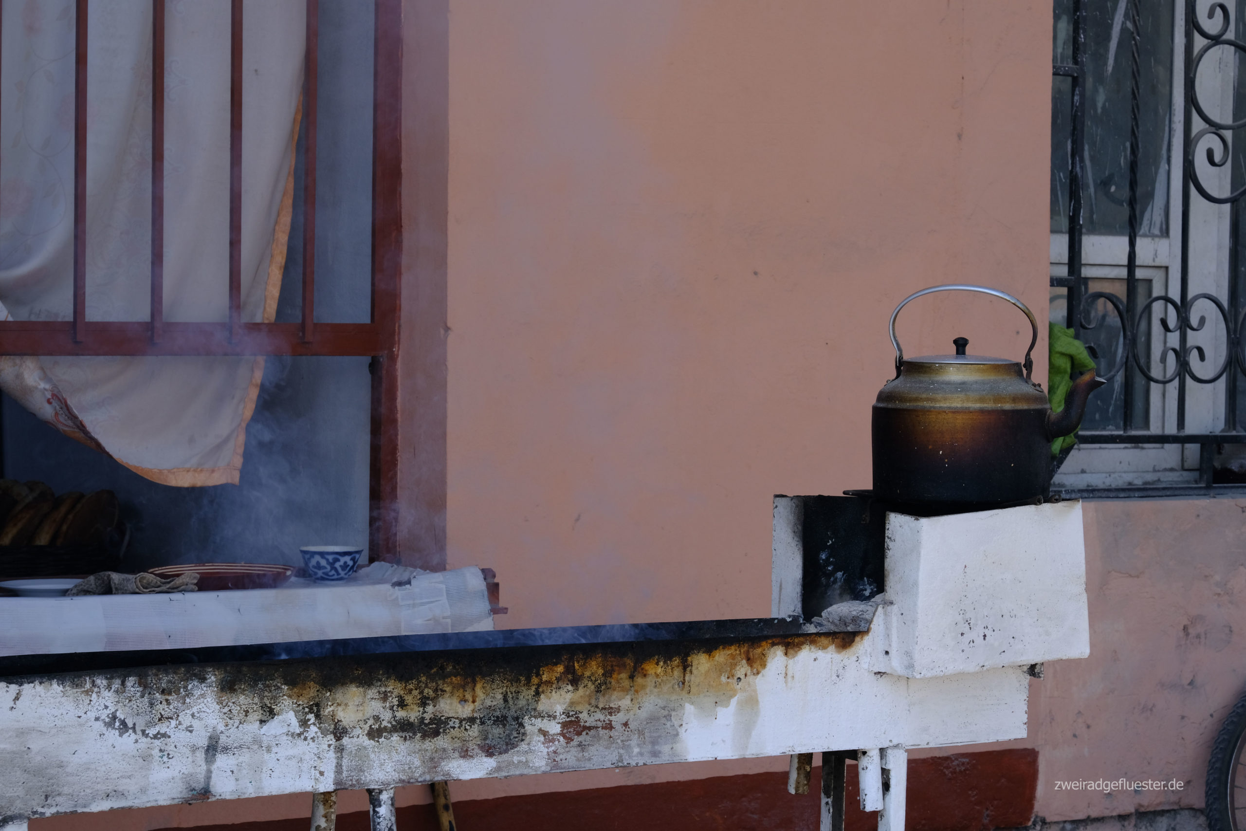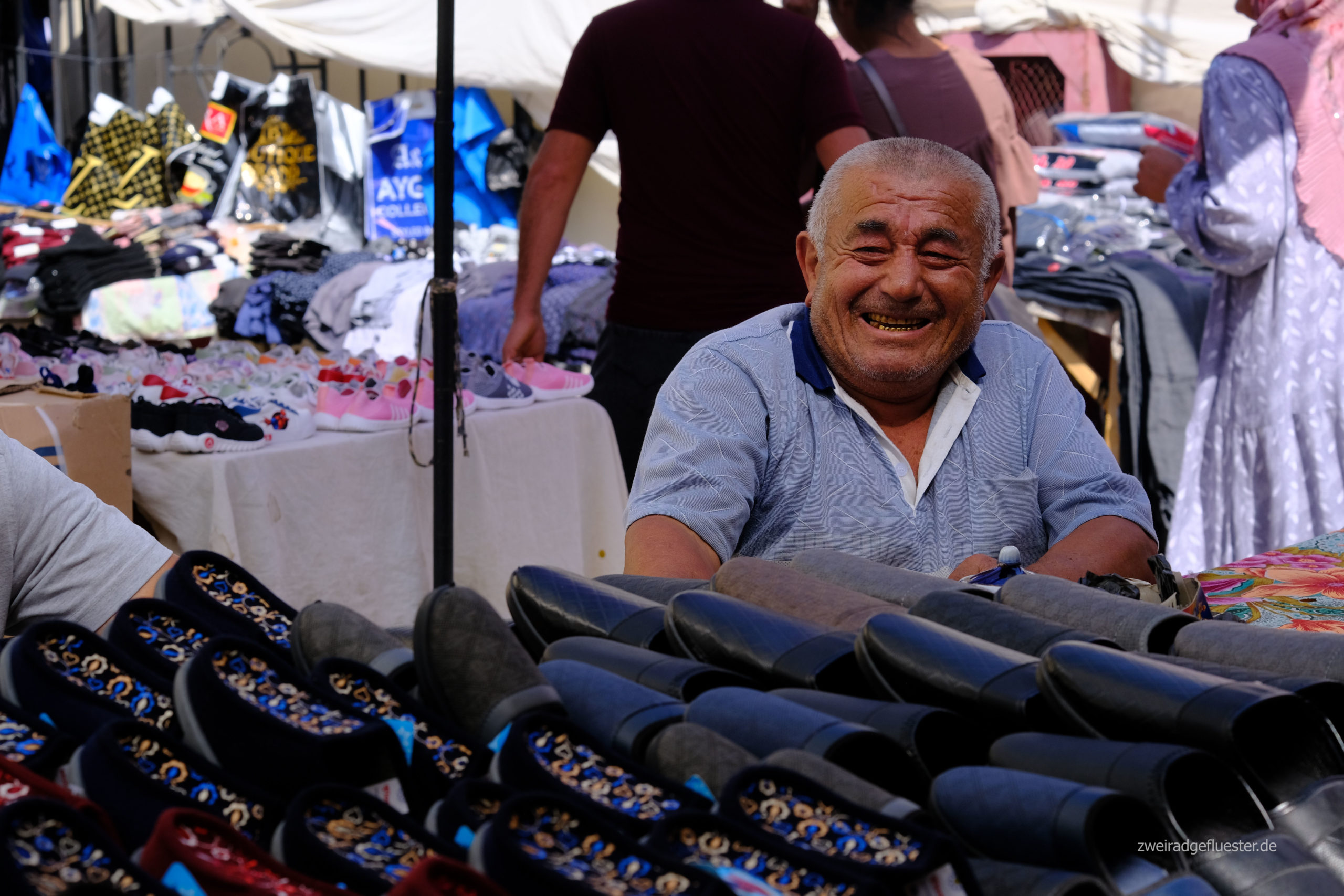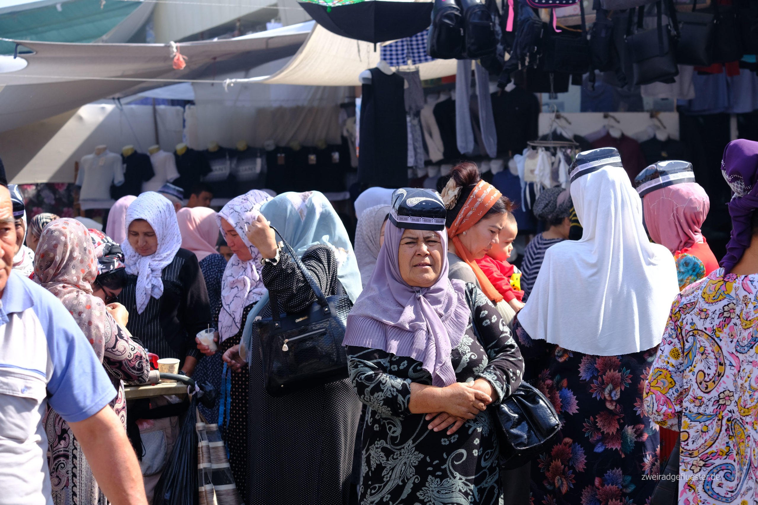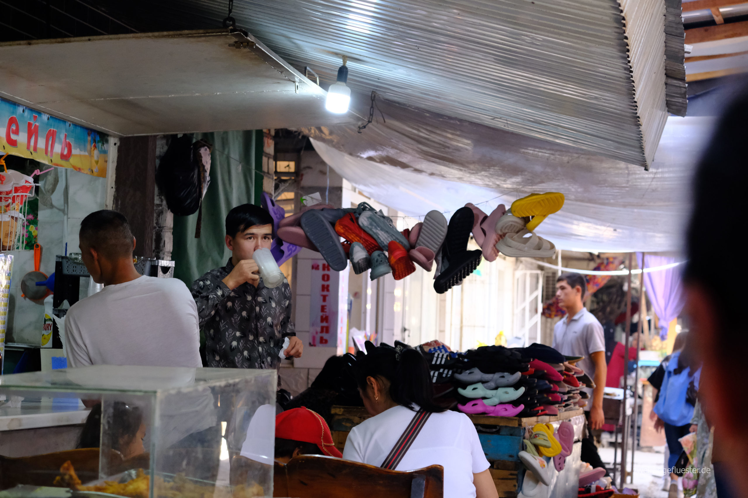 Am Abend erreichen wir so dann doch noch Margilon und können am Sonntag gemeinsam mit Guéno und Antoine den berühmten Kum Tepa Bazar besuchen. Es ist eine wahre Freude durch die mal bunten, mal dampfenden, wuseligen Gassen zu schlendern. Es gibt mal wieder alles was das Herz begehrt. Von bunten Seidenstoffen über Fahrradersatzteile bis hin zu leckerstem Obst und Gemüse. Überall sollen wir probieren und es wird wieder so herzlich gelacht und fleißig gewunken. Wir fühlen uns sehr wohl hier.