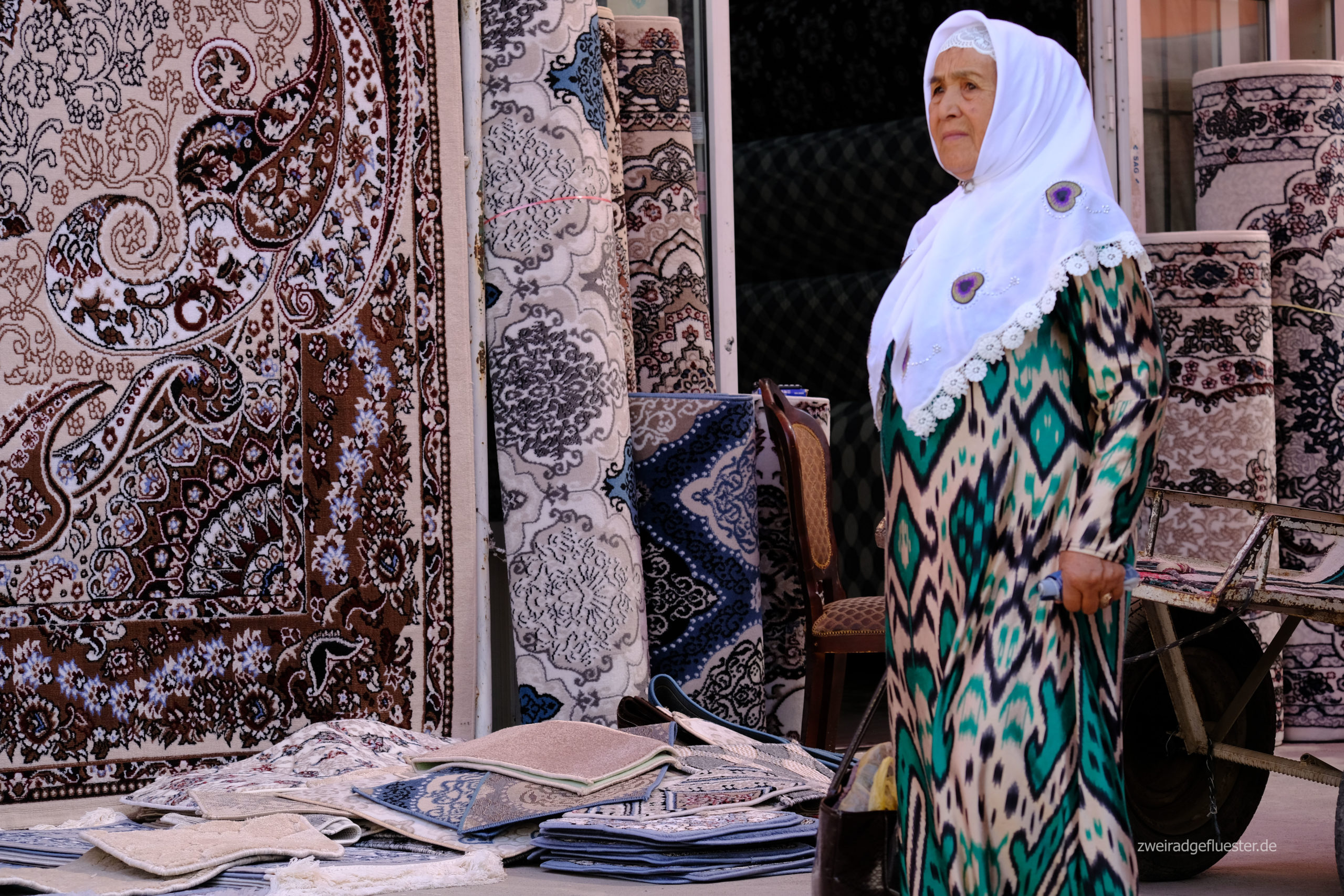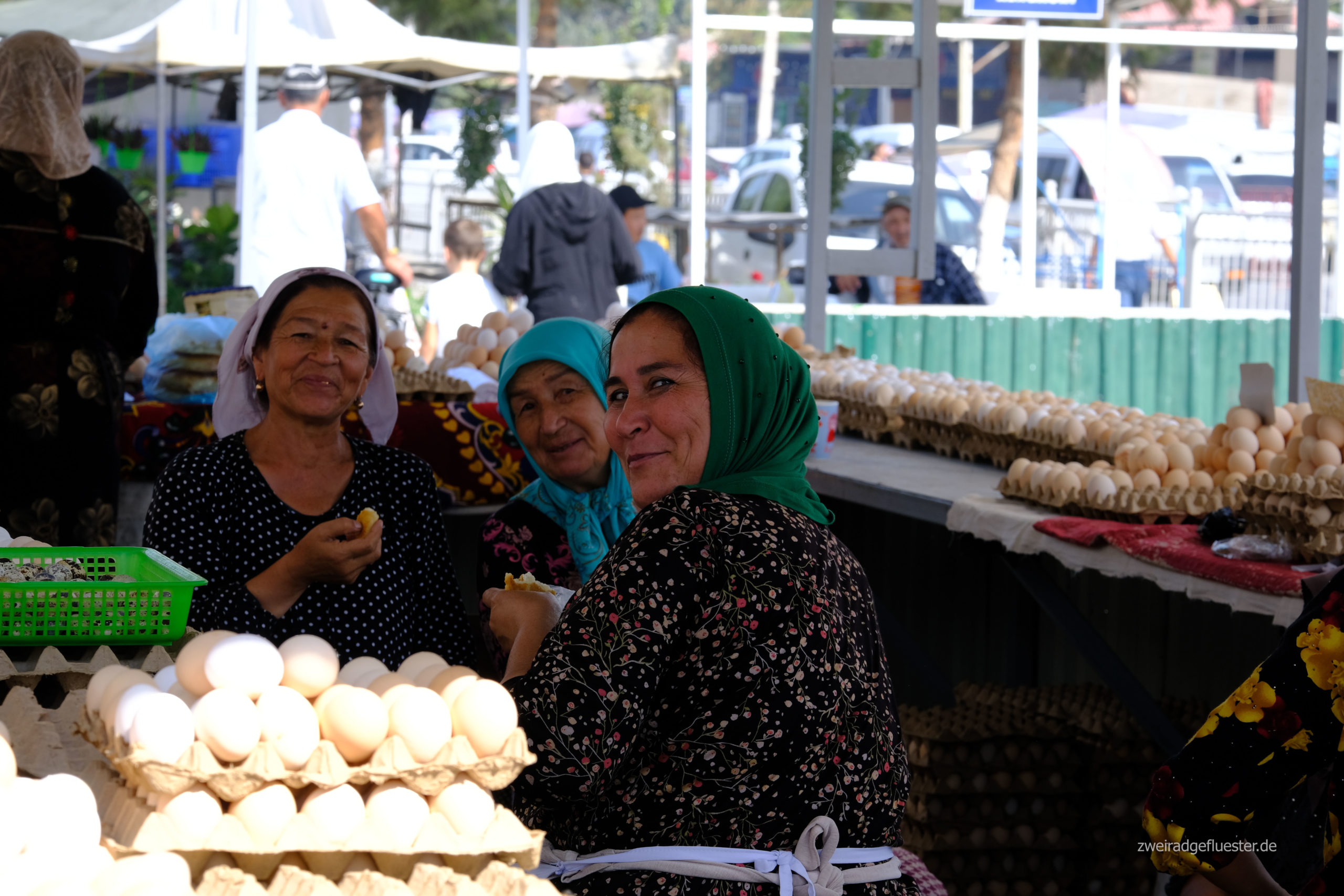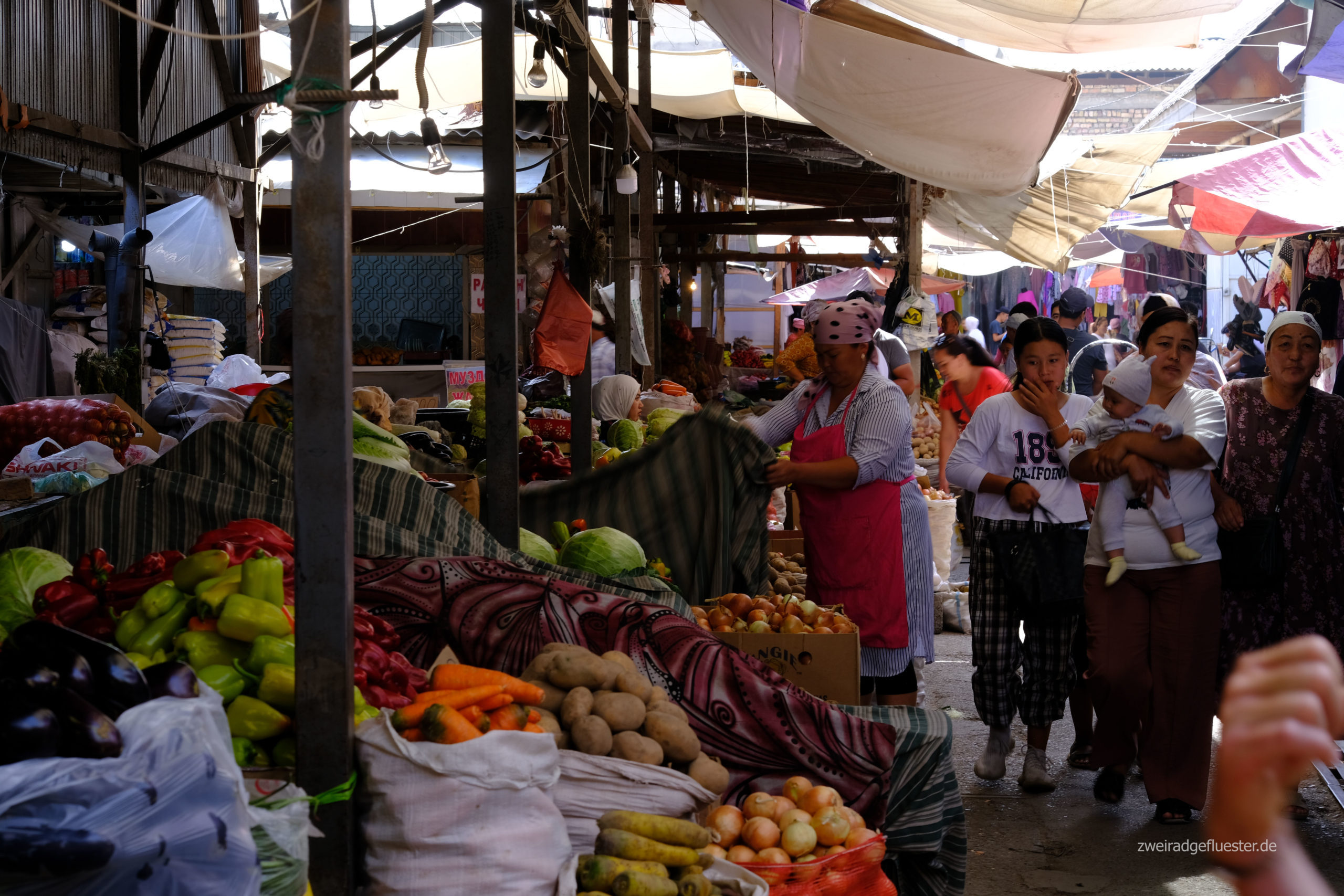 Direkt nach dem Ausgang finden wir uns auf einer Art Bazaar wieder und allerhand freundliche Gesichter mit goldenen Zähnen lächeln uns entgegen und heißen uns in unserem 13. Reiseland Usbekistan willkommen.