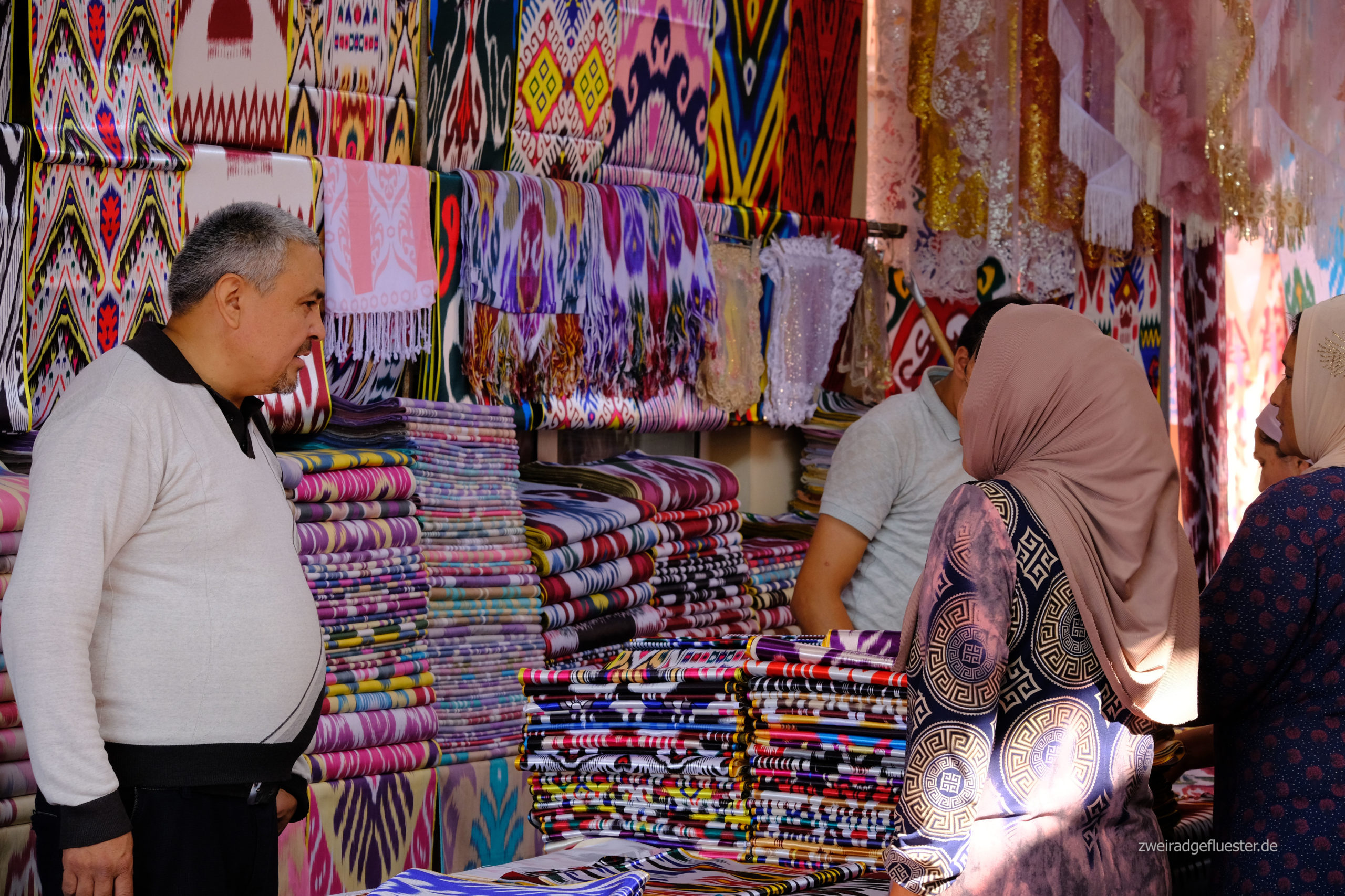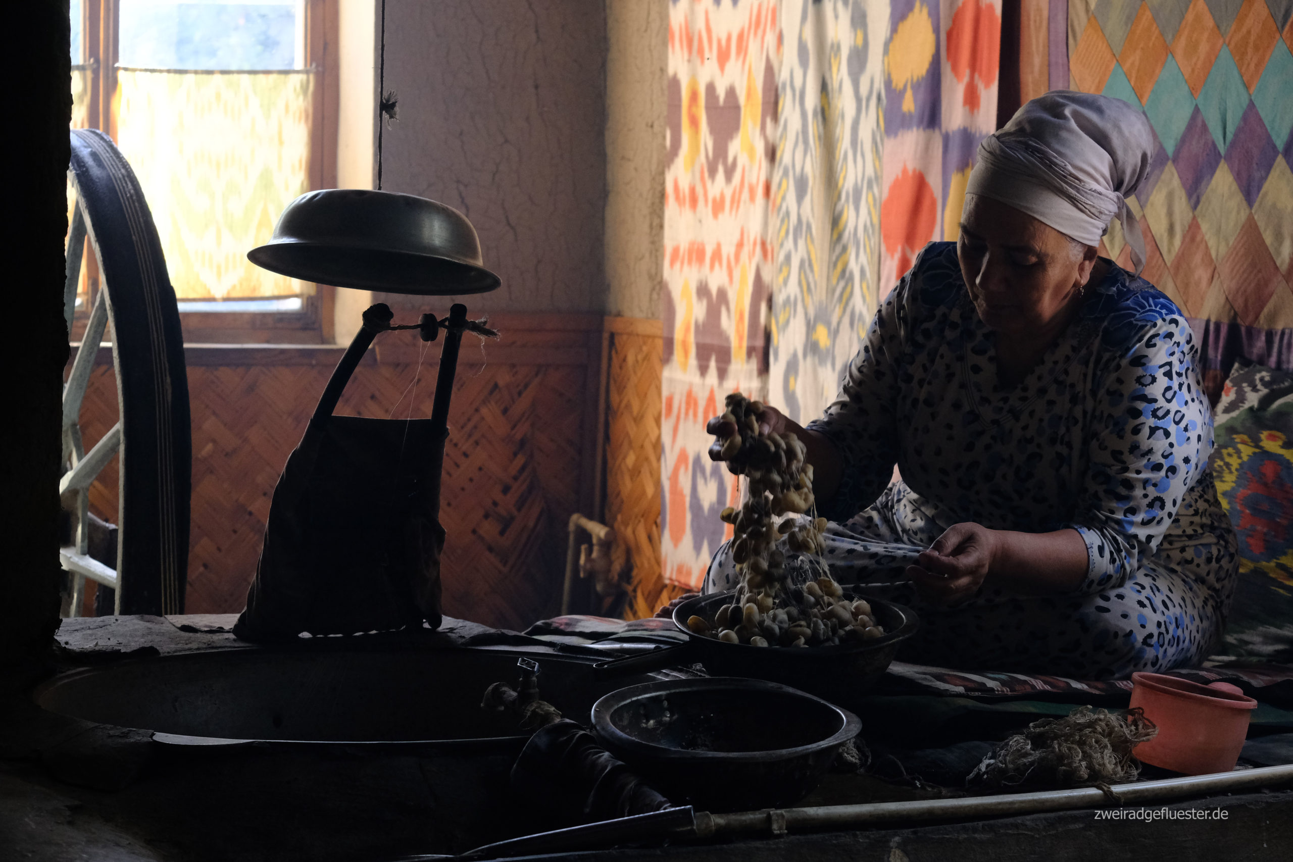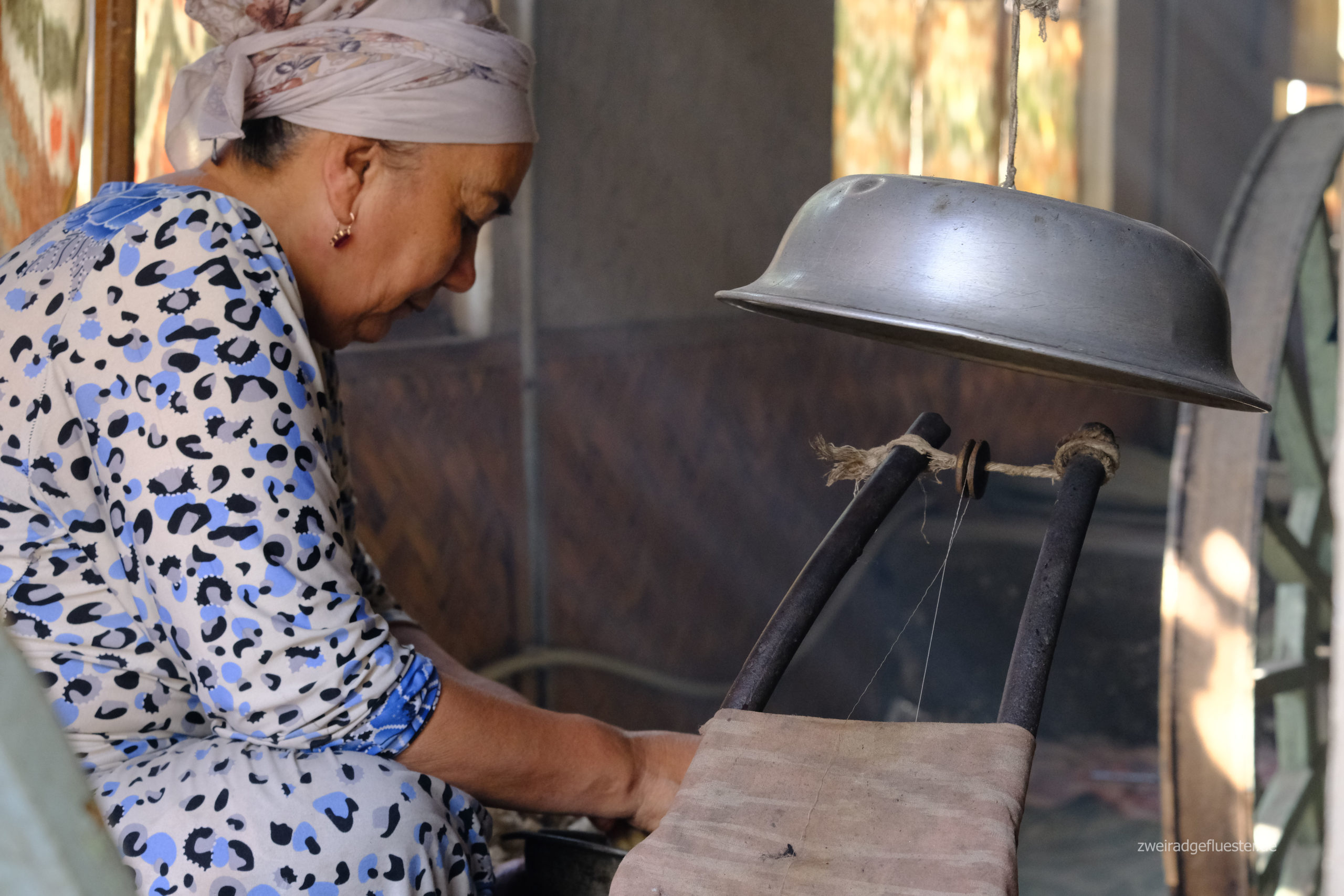 Margilon ist die Seidenhauptstadt Usbekistans und damit sind wir nun im Herzen der Seidenstraße angekommen, jedenfalls, wenn man es mit dem Wort der Seidenstraße ernst nimmt. Produziert wird sowohl reine Seide als auch Seidenbaumwollstoff. In der größten, traditionellen Seidenmanufraktur der Stadt namens Yodgorlik erfahren wir wie die ganzen farbenfrohen Stoffe, die wir auf dem Markt bestaunt haben, eigentlich hergestellt werden.