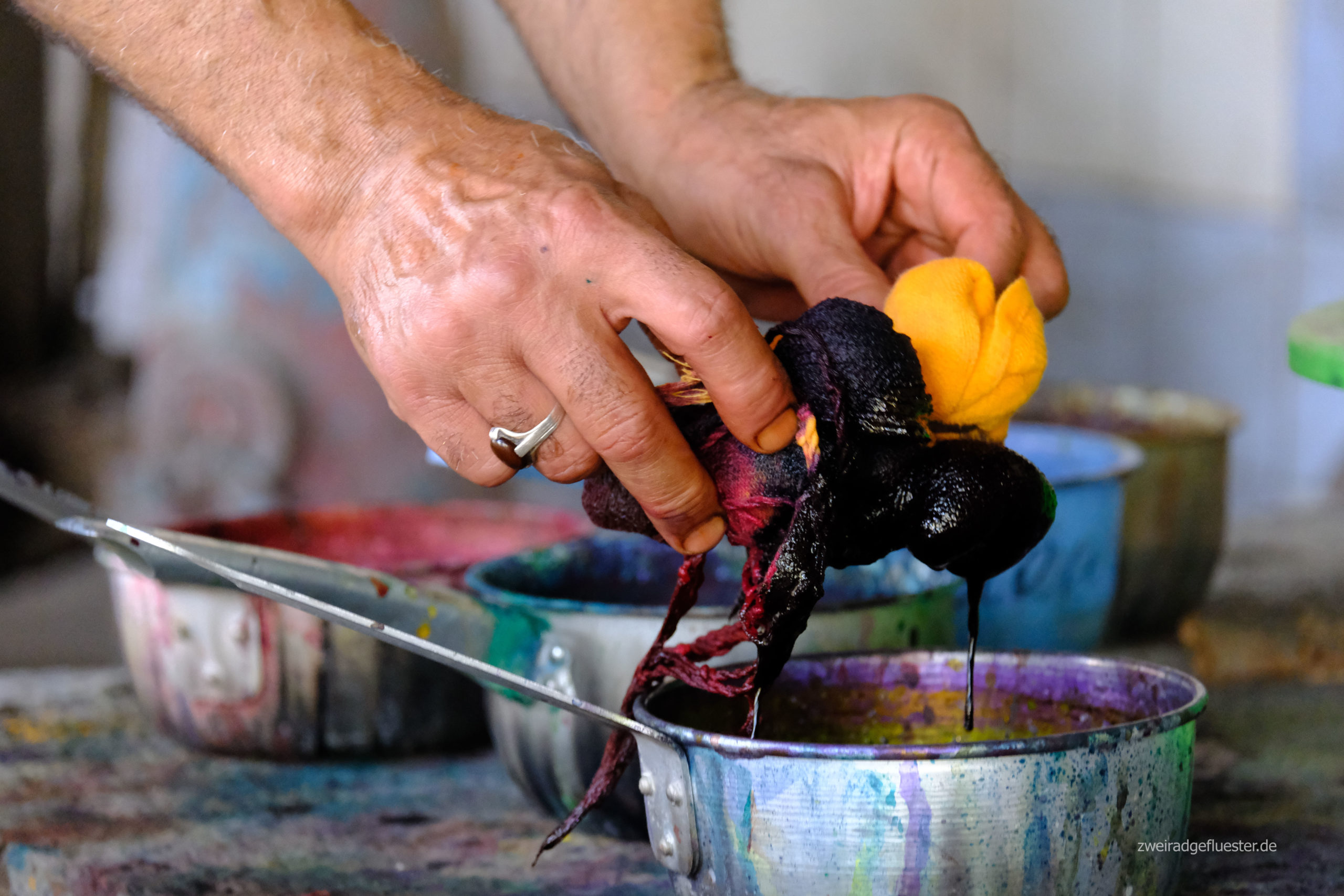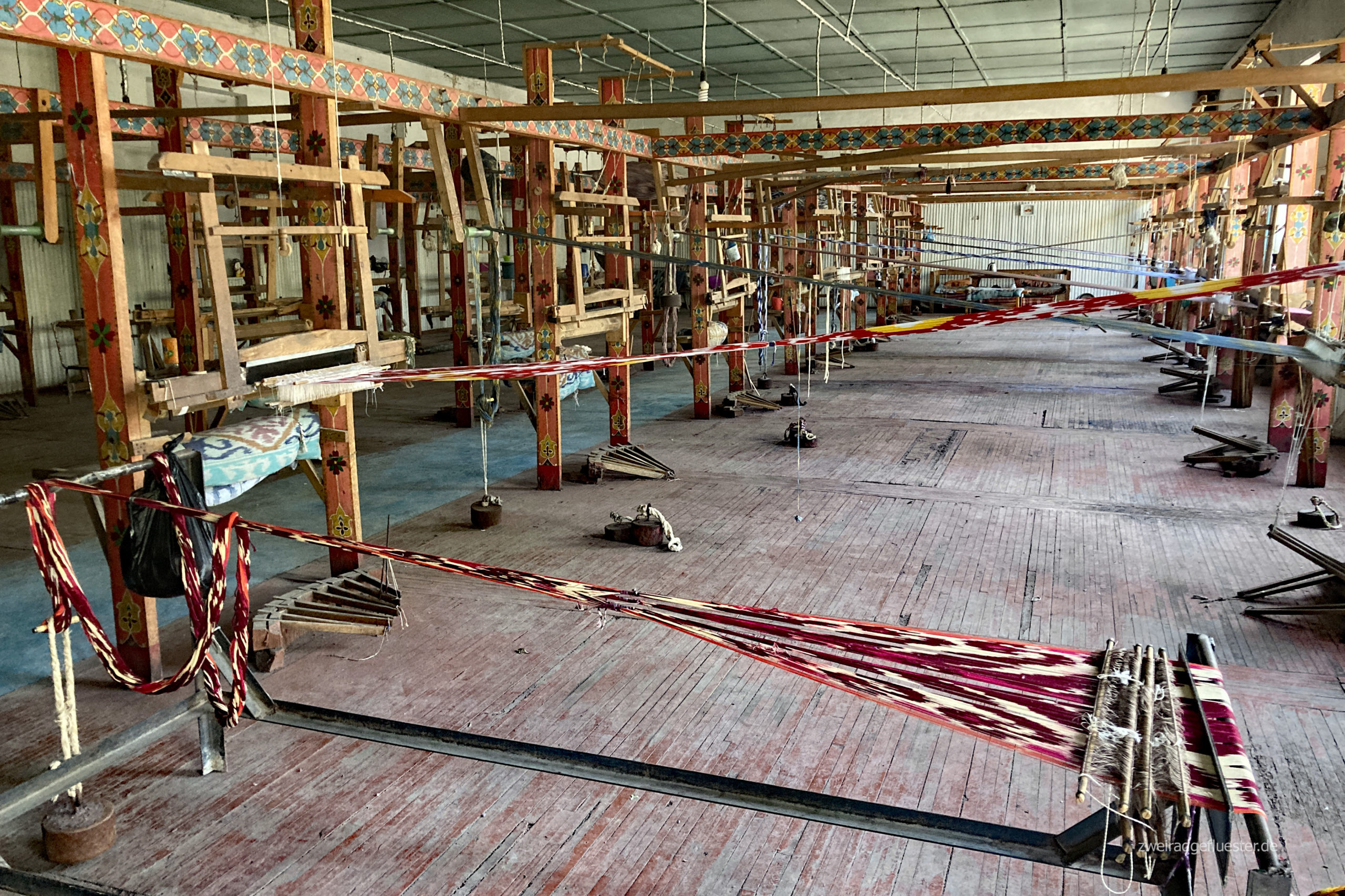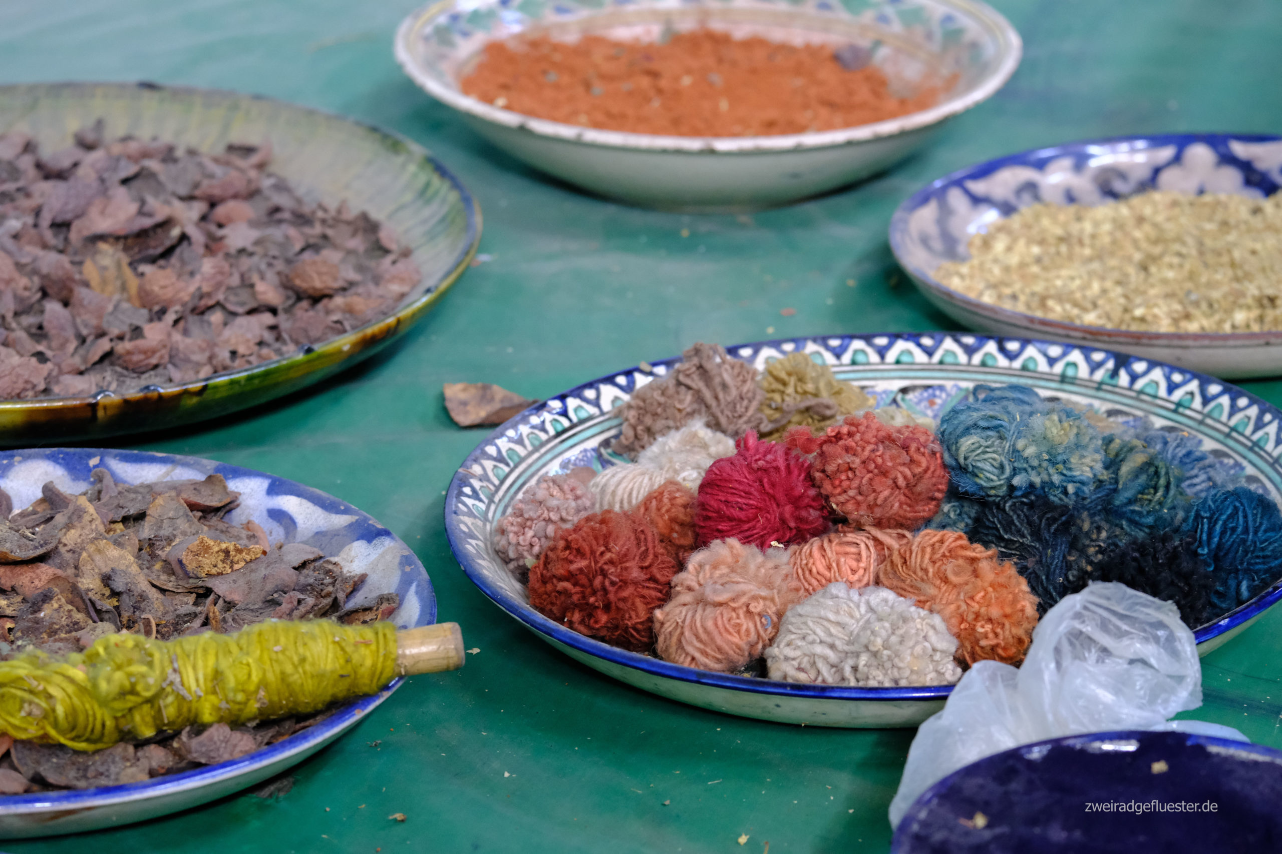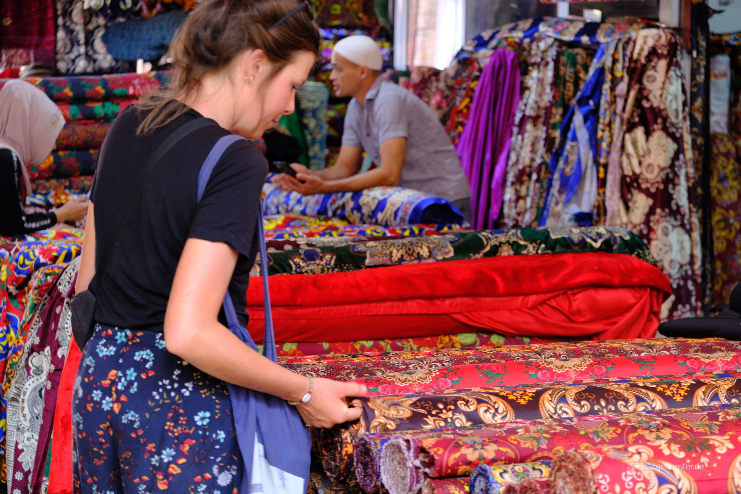 Margilon ist die Seidenhauptstadt Usbekistans und damit sind wir nun im Herzen der Seidenstraße angekommen, jedenfalls, wenn man es mit dem Wort der Seidenstraße ernst nimmt. Produziert wird sowohl reine Seide als auch Seidenbaumwollstoff. In der größten, traditionellen Seidenmanufraktur der Stadt namens Yodgorlik erfahren wir wie die ganzen farbenfrohen Stoffe, die wir auf dem Markt bestaunt haben, eigentlich hergestellt werden.