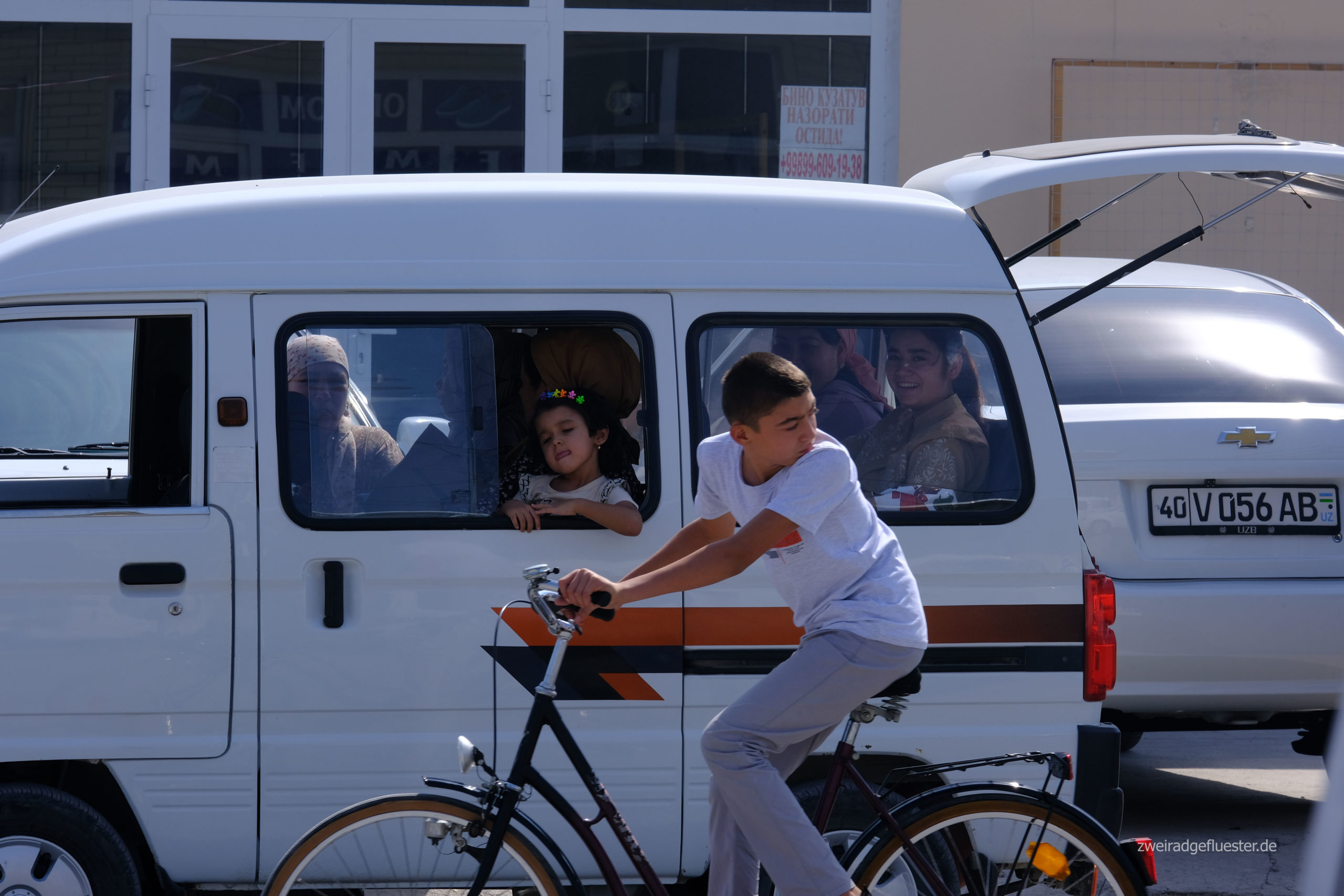 Doch nicht nur wir sind ziemlich flink unterwegs, sondern auch die vielen, weißen Elefantenrollsschuhe, die in Usbekistan die Straßen bevölkern. Die Damas Busse sind hier wohl das Fortbewegungsmittel Nummer Eins und es ist schon ziemlich spannend anzusehen, wer und was so alles in dieses kleine, witzig aussehende Gefährt passt.