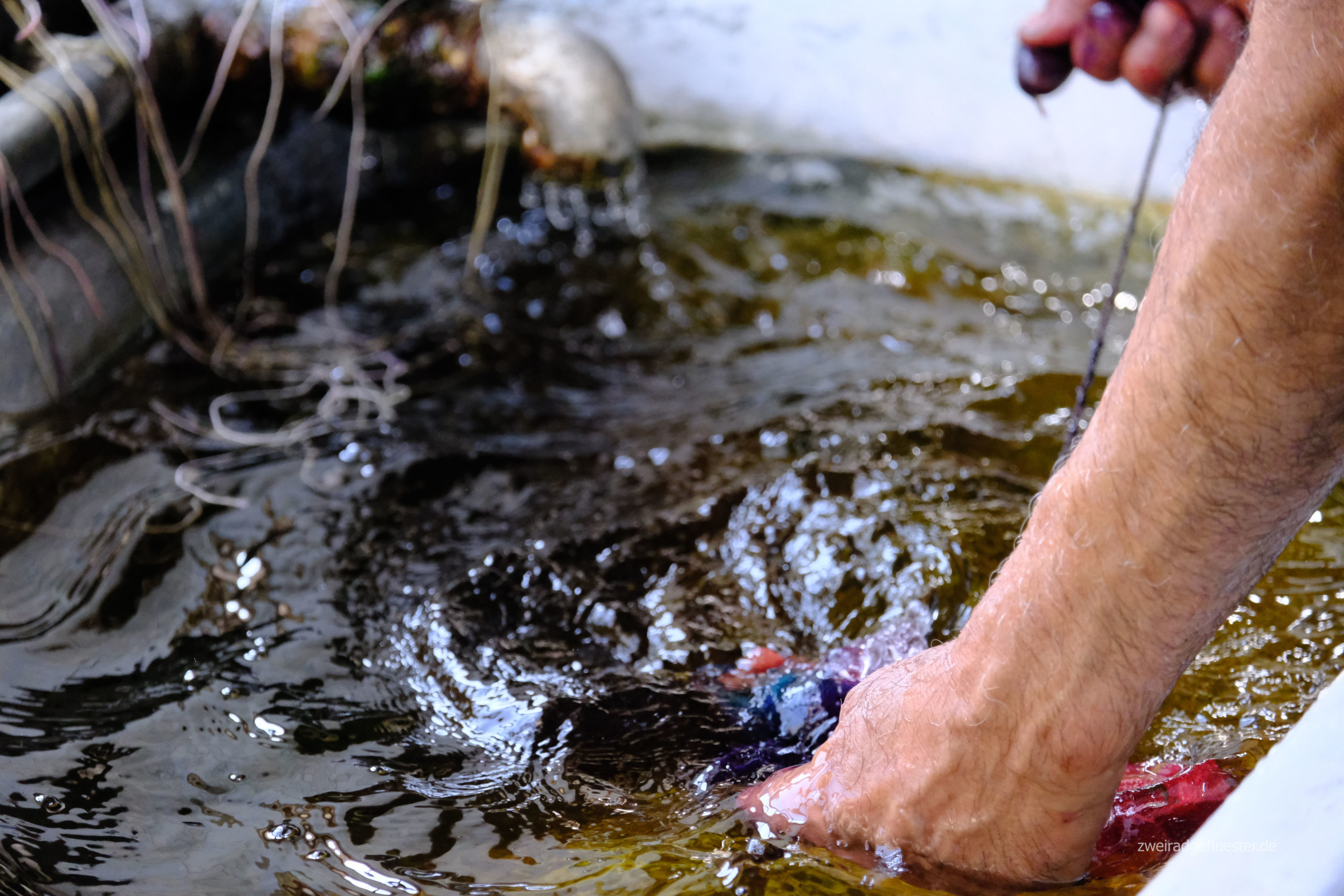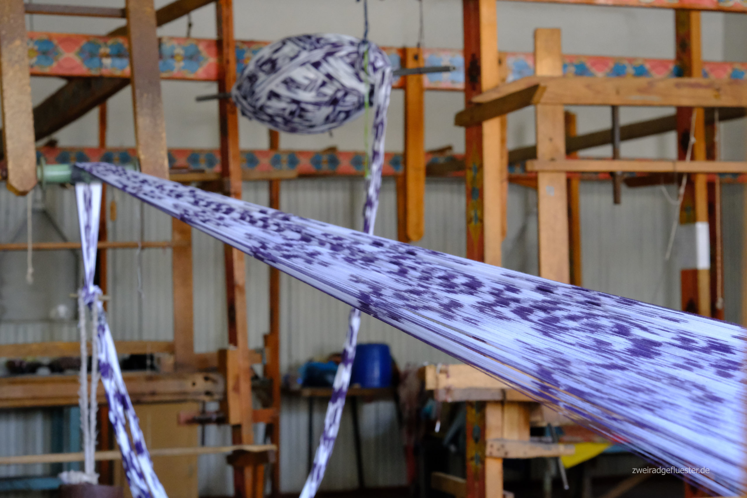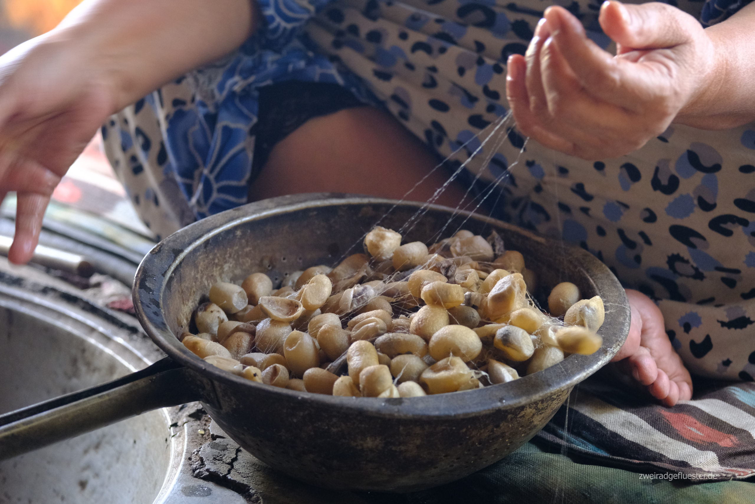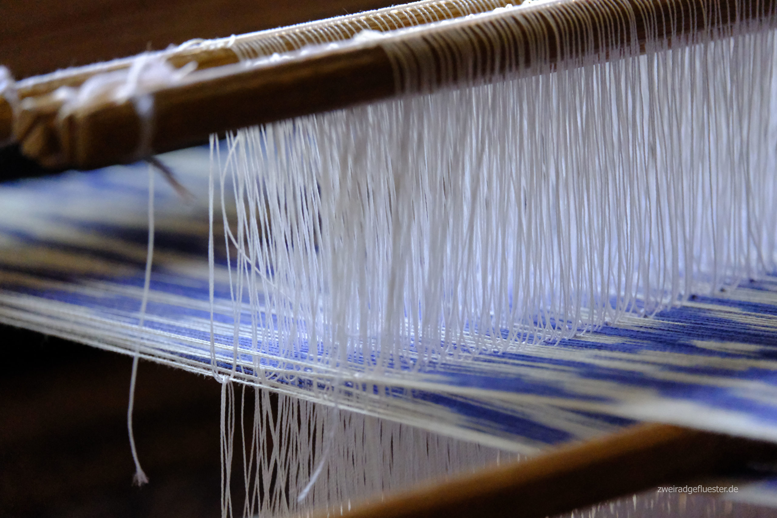 Der Prozess wird von der Aufzucht und dem Sammeln der Seidenraupen, der Herstellung der Fäden über das Färben und Weben der Stoffe auf den traditionellen Webstühlen erklärt und macht uns bewusst, wie uralt, aufwendig und bis ins kleinste Detail durchdacht der Prozess der Herstellung ist. Leider sind an diesem Tag nur wenige Arbeiter:innen vor Ort, denen wir über die Schultern schauen können, aber dennoch hat sich der Besuch gelohnt.