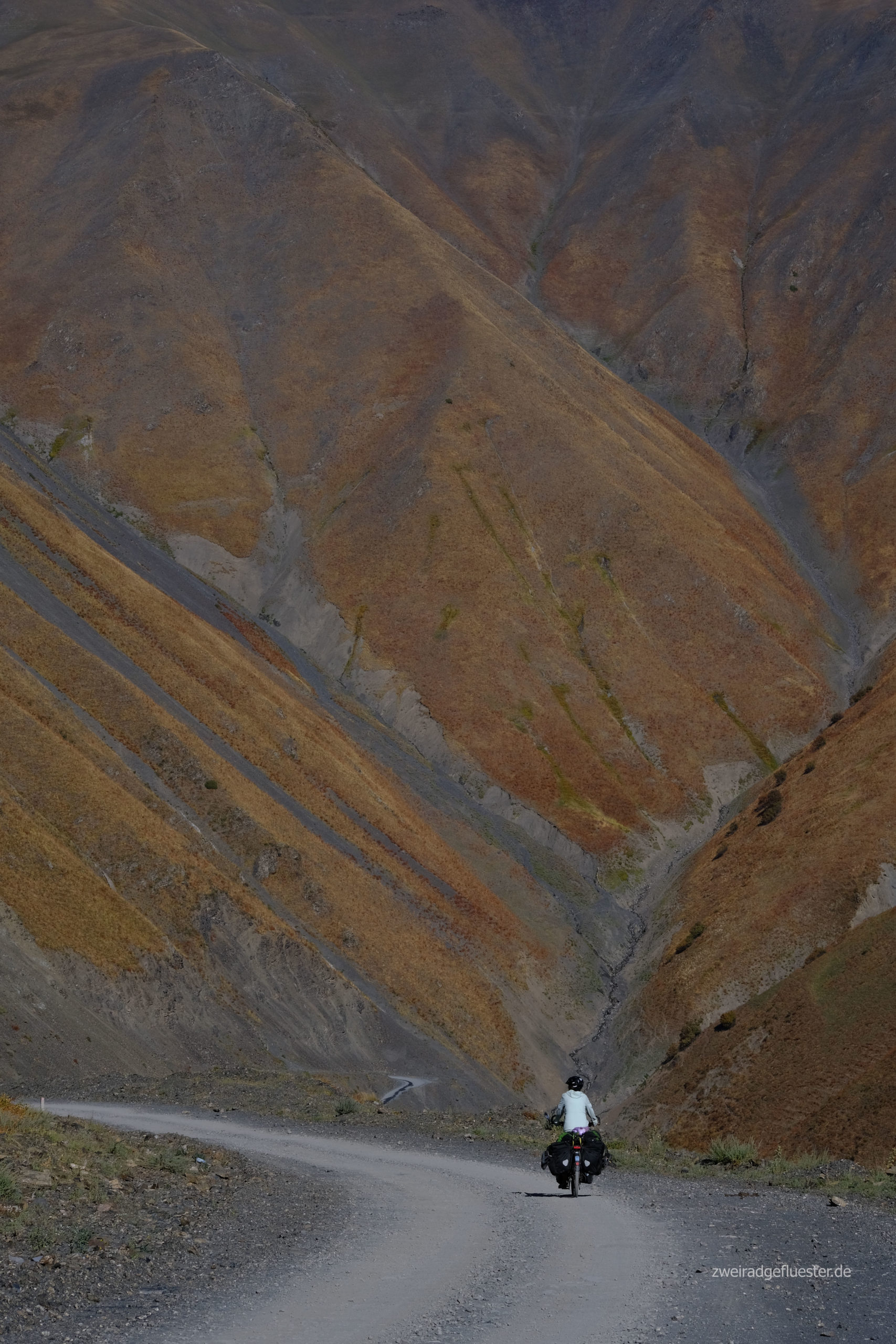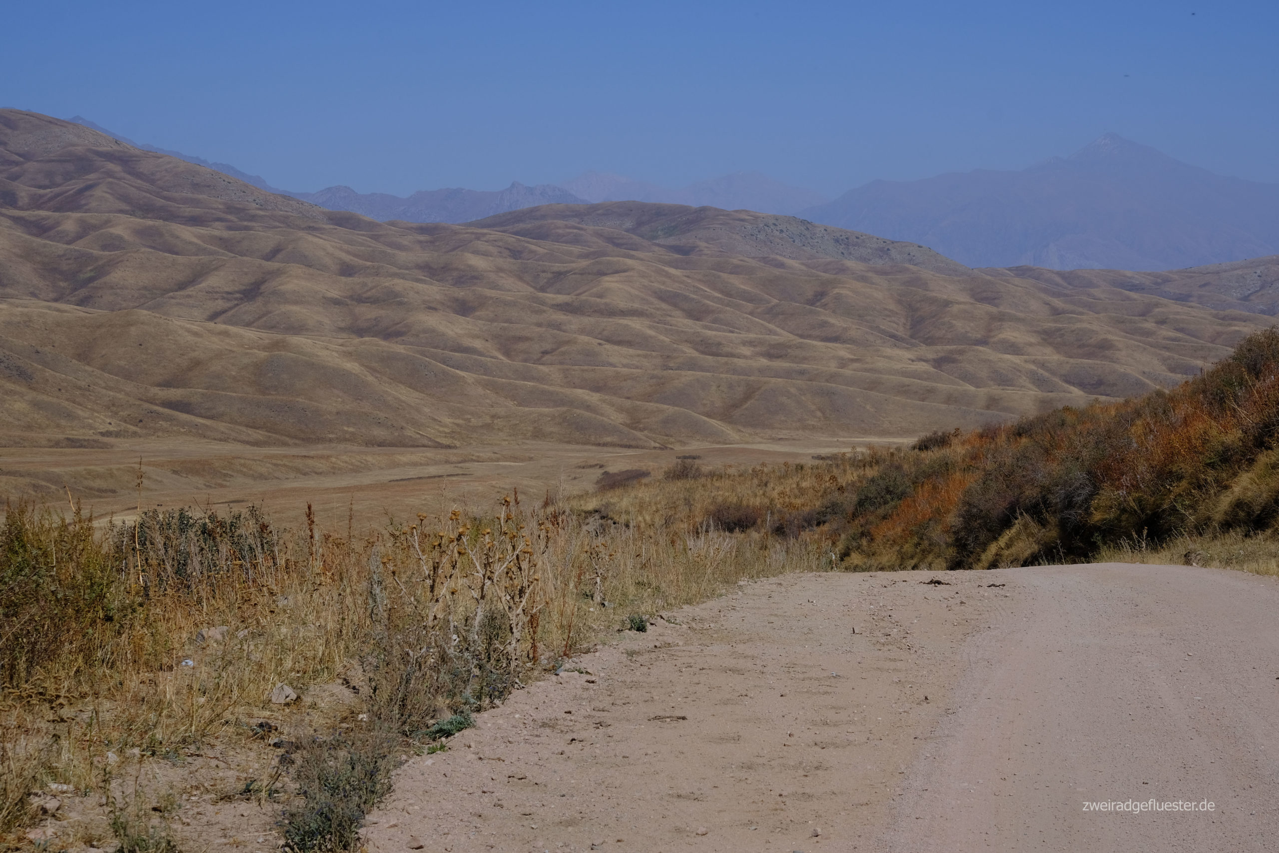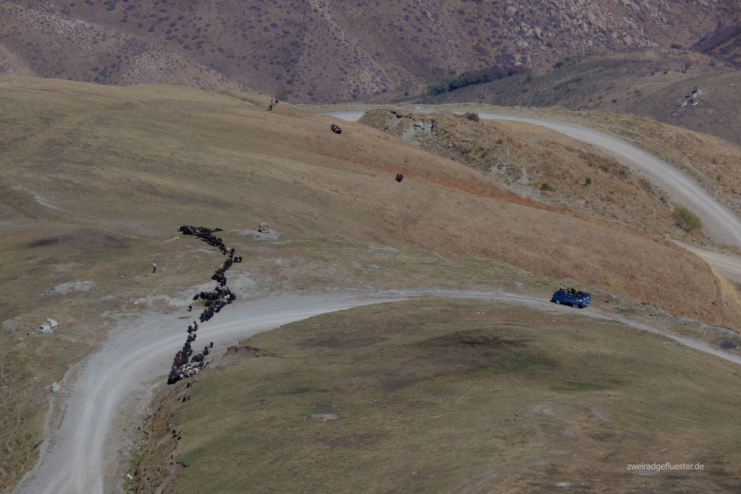 Vor uns liegt unser letzter, kirgisischer Ausflug in die Berge – der Kaldamo Pass. Die alte Bergstraße wurde mittlerweile durch einen neuen, asphaltierten Highway ersetzt, der wohl noch nicht so lange existiert. Zum Glück für uns, denn so haben wir die alte Piste so gut wie für uns allein. Nur ab und zu kommen wir in den Kontakt mit dem ein oder anderen rücksichtslosen Autofahrer oder werden von einer Kolonne Viehtransporter überholt. Der Sommer neigt sich dem Ende, die ohnehin sehr abgegrasten Weiden haben wohl nicht mehr viel zu bieten und wir sehen, wie die Tiere Stück für Stück nach unten in die Täler gebracht werden.