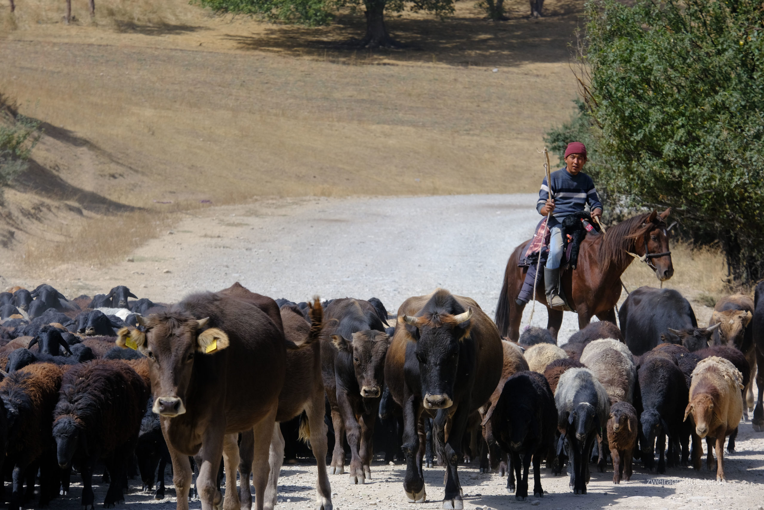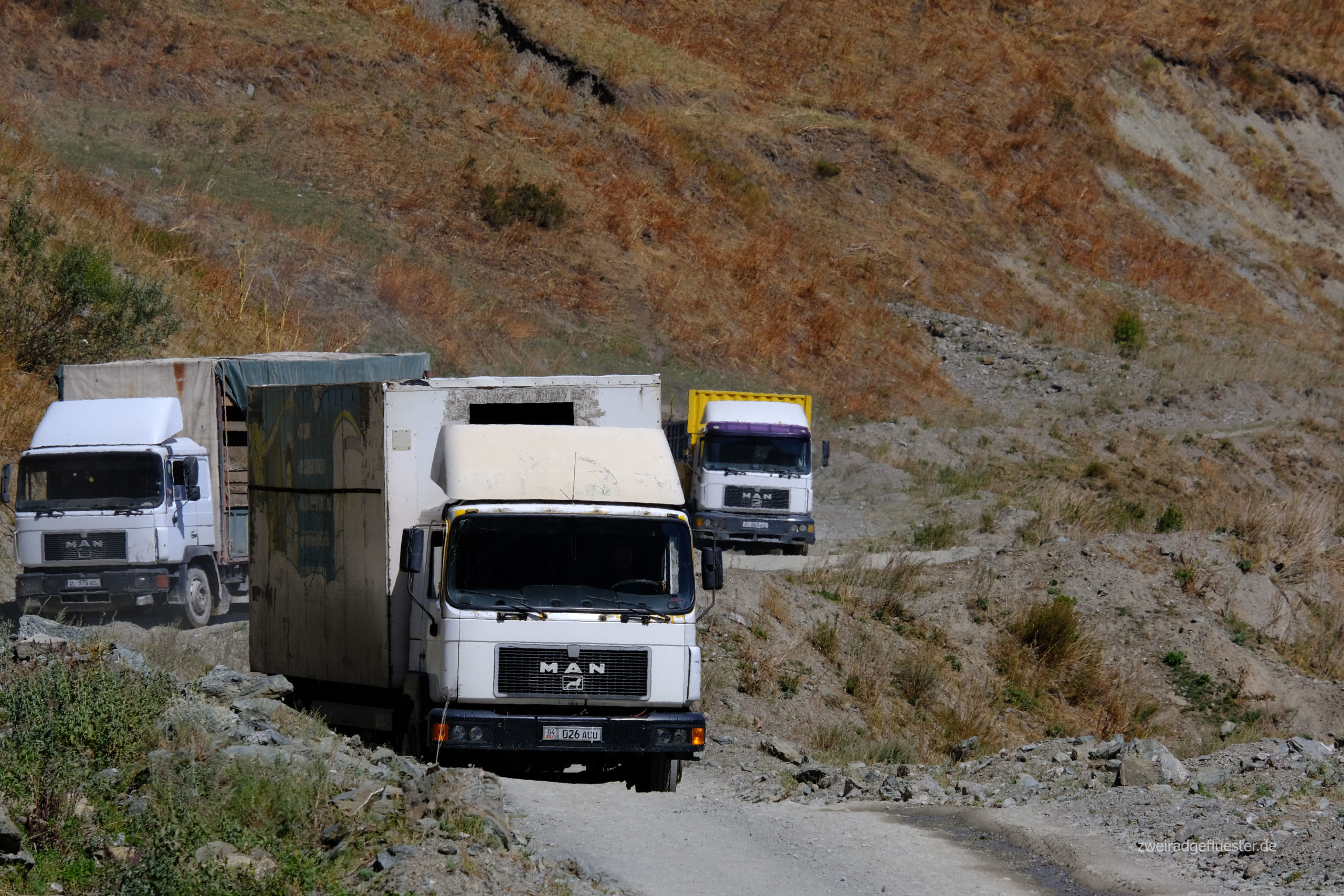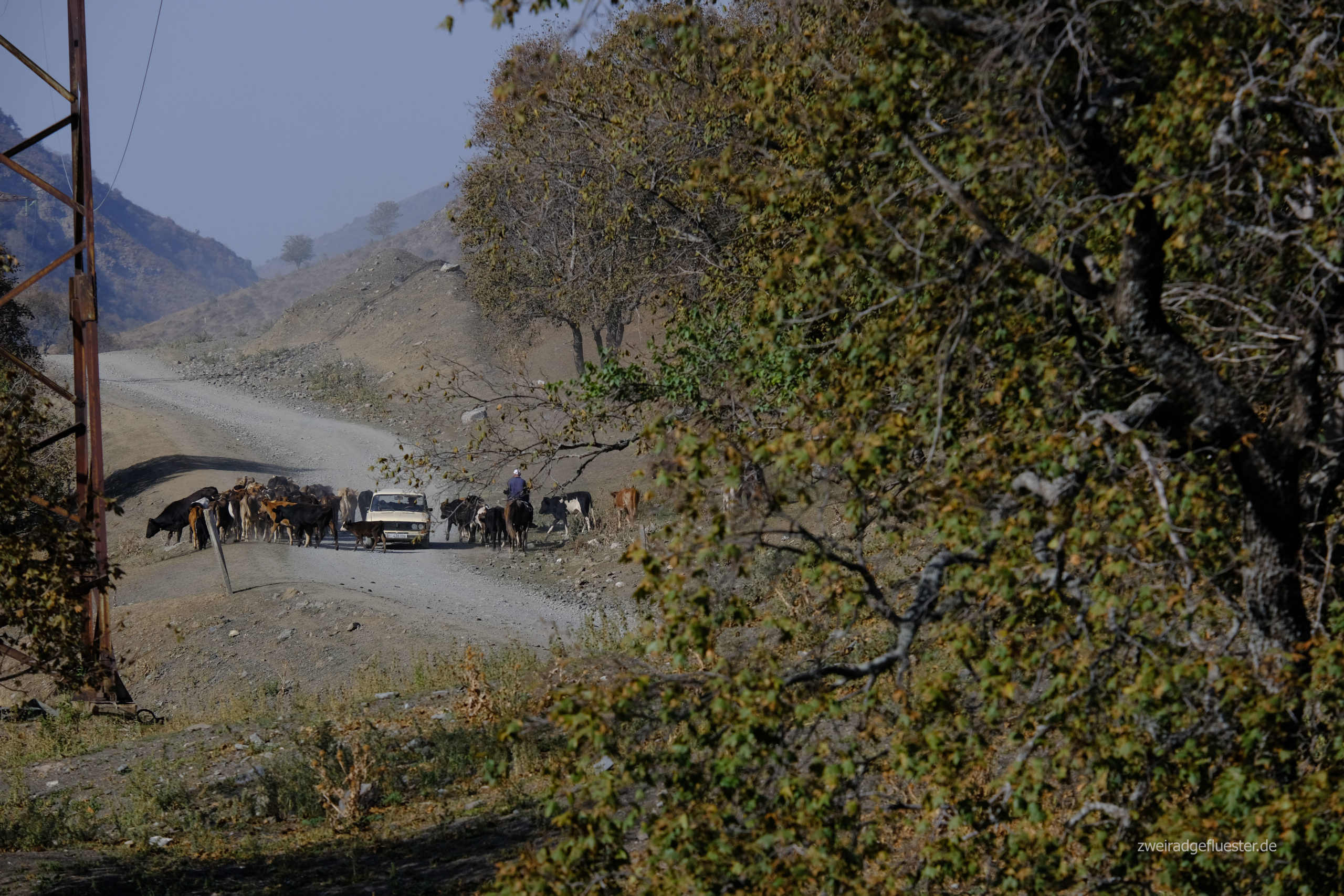 Vor uns liegt unser letzter, kirgisischer Ausflug in die Berge – der Kaldamo Pass. Die alte Bergstraße wurde mittlerweile durch einen neuen, asphaltierten Highway ersetzt, der wohl noch nicht so lange existiert. Zum Glück für uns, denn so haben wir die alte Piste so gut wie für uns allein. Nur ab und zu kommen wir in den Kontakt mit dem ein oder anderen rücksichtslosen Autofahrer oder werden von einer Kolonne Viehtransporter überholt. Der Sommer neigt sich dem Ende, die ohnehin sehr abgegrasten Weiden haben wohl nicht mehr viel zu bieten und wir sehen, wie die Tiere Stück für Stück nach unten in die Täler gebracht werden.