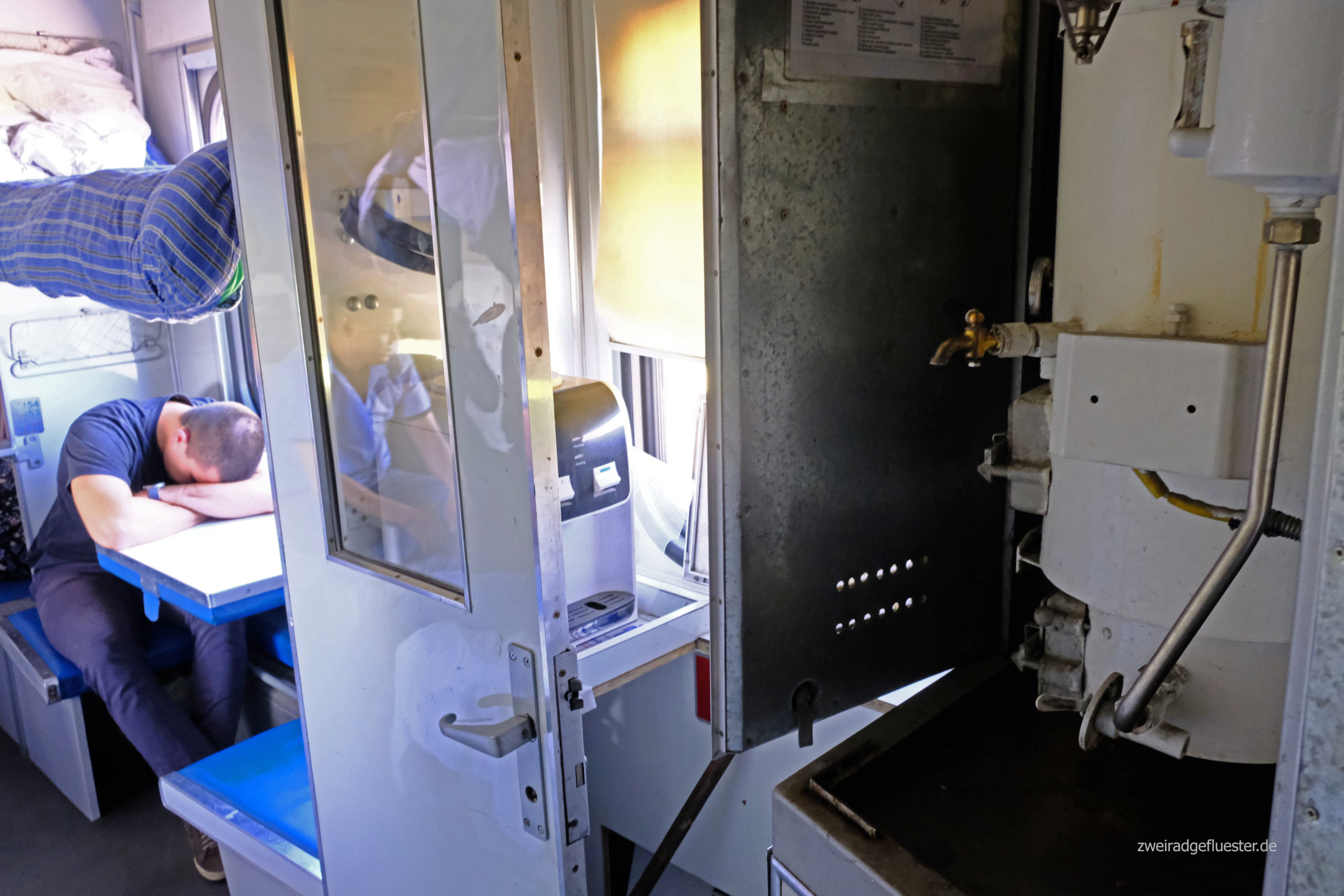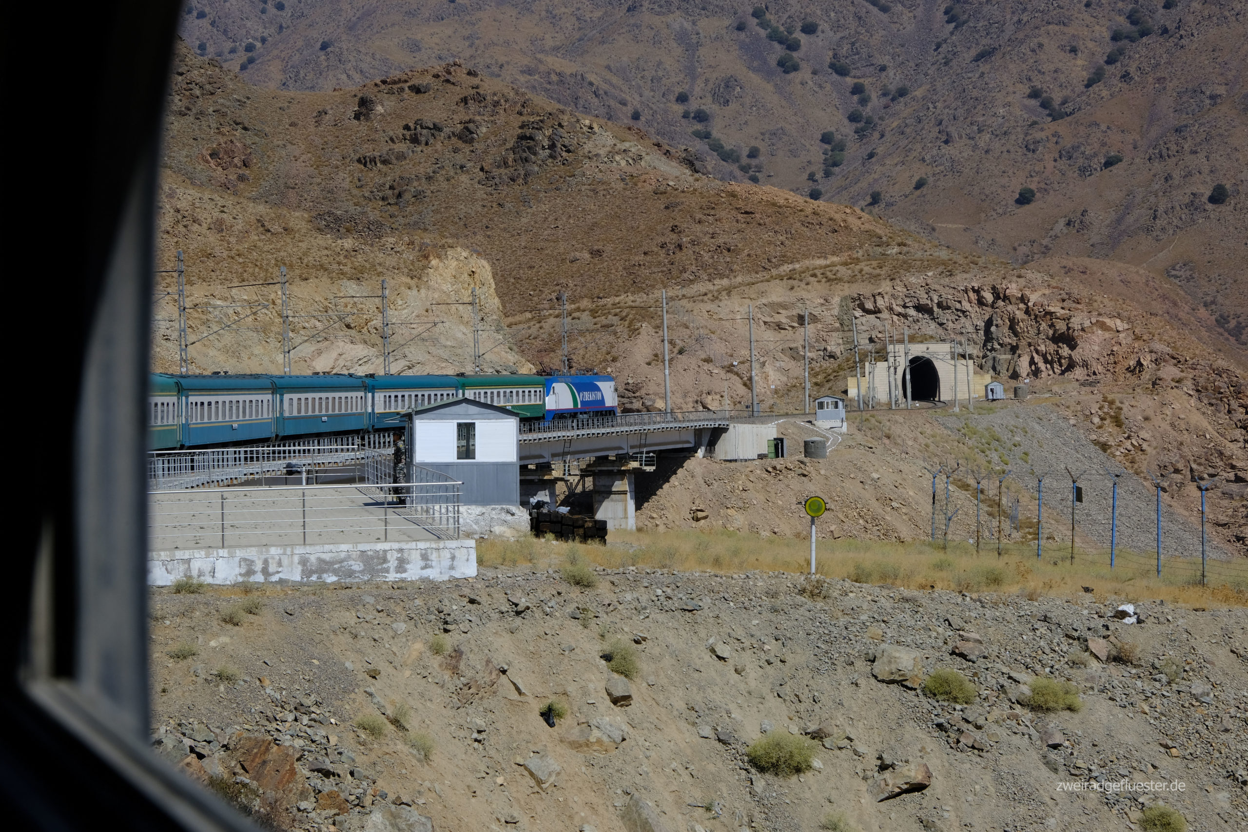 Für uns geht es mal wieder zum Bahnhof. Diesmal nach Samarkand! Die Abfahrt ist am Abend und diesmal werden wir die Betten wohl ernster nutzen als beim letzten Mal. Doch zuvor müssen wir noch ein nerviges Gespräch mit dem Schaffner führen. Schon bevor wir einsteigen möchte er Geld für die Räder haben. Wir wissen zwar, dass dies nur in seine Tasche fließt, aber wir sind einfach zu müde zum Diskutieren. Er will uns aber auch keinen Preis nennen und wartet lieber darauf, dass wir im etwas rüberschieben. Doch irgendwann wird es uns zu blöd. Wir sagen ihm, dass wir jetzt zur „policia“ gehen, die gleich um die Ecke steht, drehen uns um und schieben die Räder Richtung Bahnhofsgebäude. Keine drei Sekunden später ruft er uns kleinlaut zurück und sagt: „Alles kein Problem mit den Rädern. Rein damit!“