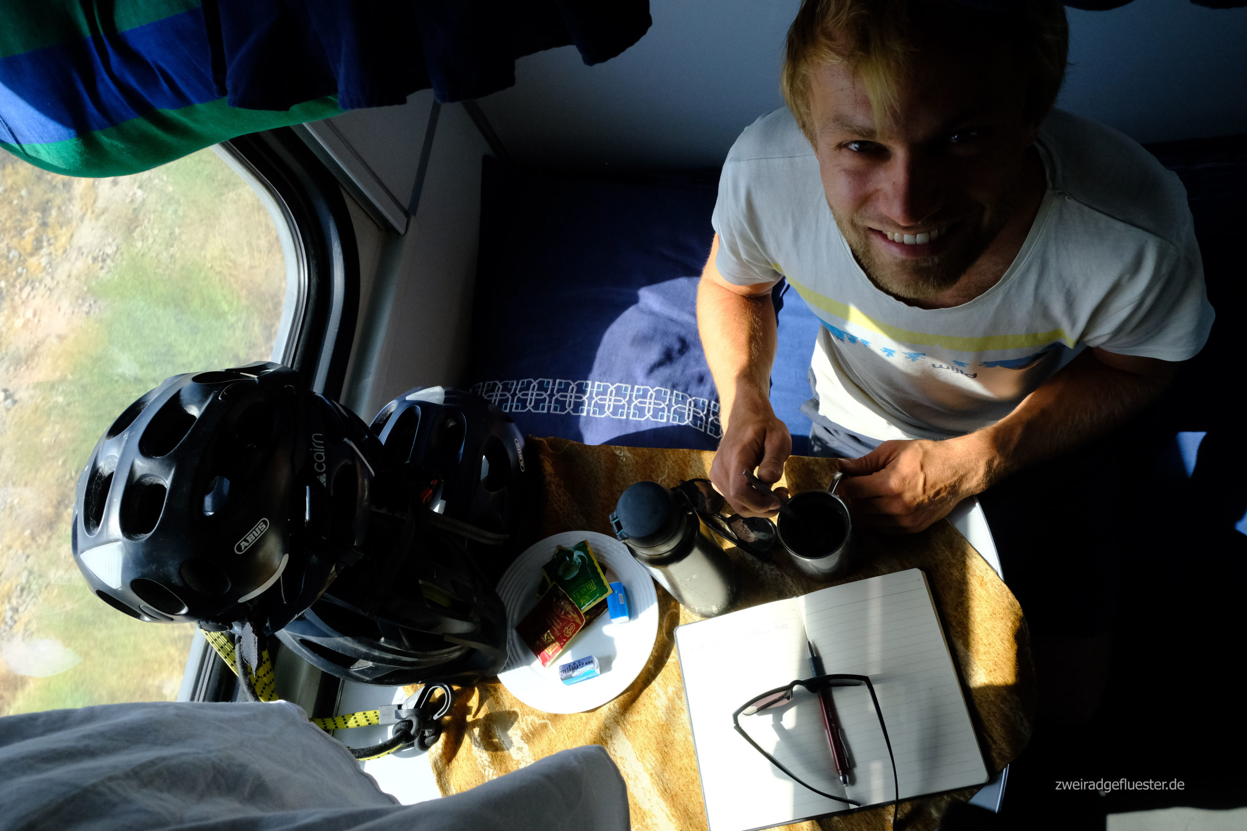 Nachdem am Bahnhof keiner verdutzt geschaut hat, als wir all unsere Taschen durch den Scanner schieben und uns sehr freundlich unser Eingang für den Zug gezeigt wurde, werden wir im Zug eher mürrisch vom Schaffner begrüßt. Der Hintereingang passt ihm nicht und wir müssen die Räder in ein anderes Abteil bringen. Der Zug ist längst losgefahren und wir schieben die sperrigen Räder durch den vollen Zug. Naja irgendwie finden alle und alles einen Platz. Irgendwie geht es eben immer, auch wenn es mit einer kleinen Portion Stress verbunden ist, vor allem wenn man es bevorzugt, dass die Räder am Ende auch noch heil sind.