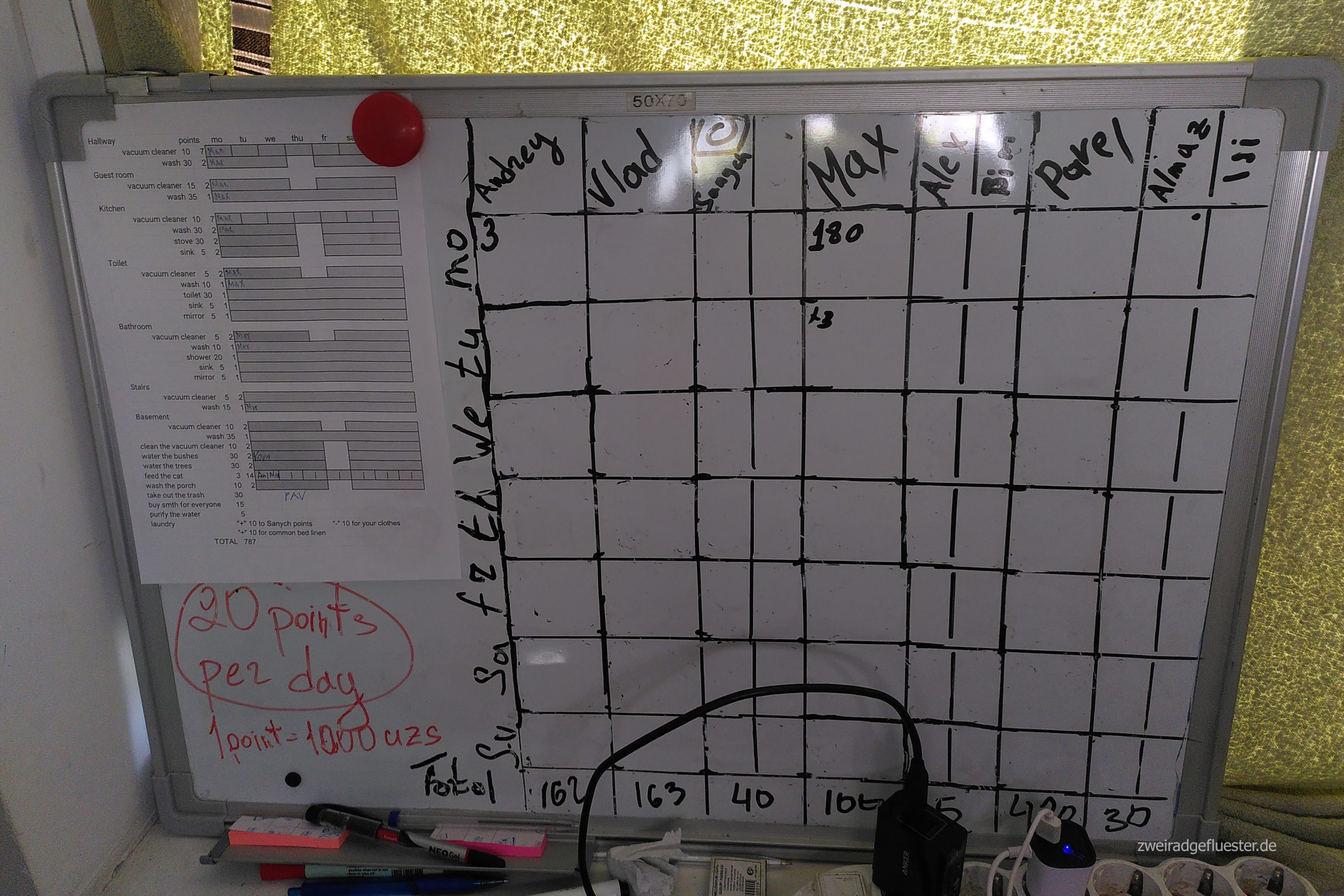 Am nächsten Tag kommen noch mehr Menschen, es sind mindestens 15 Personen im Haus, wir haben keinen Überblick mehr. Wir teilen uns ein Zimmer im Keller, welches noch im Bau ist, mit zwei anderen. Jeden Morgen sehen wir neue Gesichter. Es ist verrückt und beklemmend, da wir wissen, nur die wenigsten machen dies freiwillig und doch herrscht eine recht angenehme Stimmung. Andre kümmert sich um das Haus, denn Aybek kann aufgrund von Familie und Job natürlich nicht jeden Tag vor Ort sein. Wer länger als eine Nacht im Couchsurferhaus bleibt, ist mit dafür zuständig, dass Haus sauber zu halten. Dafür hat Andre sich einen genialen Putzplan mit Punktesystem überlegt und es kommt direkt etwas WG Feeling bei uns auf.