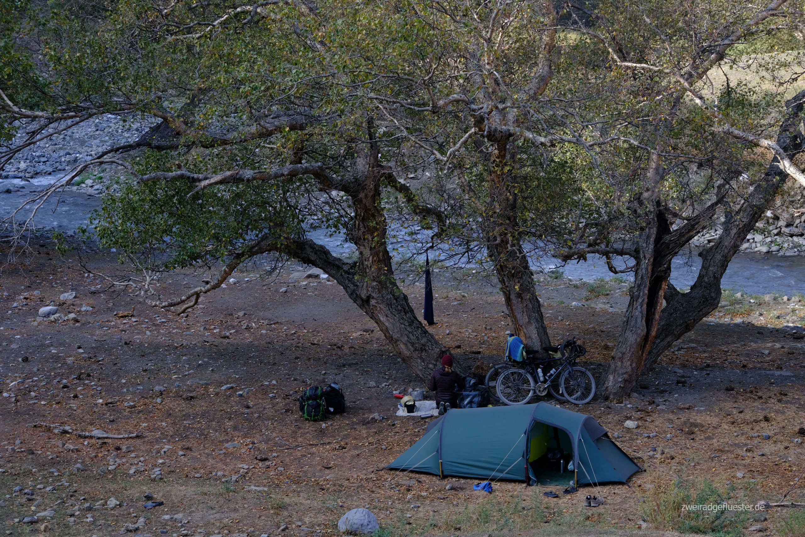 Wir winden uns immer weiter nach oben über die trockene und karge Nordseite der Ferganakette. Die Südseite wirkt grüner, auch wenn uns die blendende Sonne jegliche Farben aus dem Panorama entzieht. Noch weiter unten radeln wir zum ersten Mal seit einer geraumen Ewigkeit wieder durch einen Laubwald, der zu unserer Freude auch noch zum größten Teil aus Walnussbäumen besteht.
