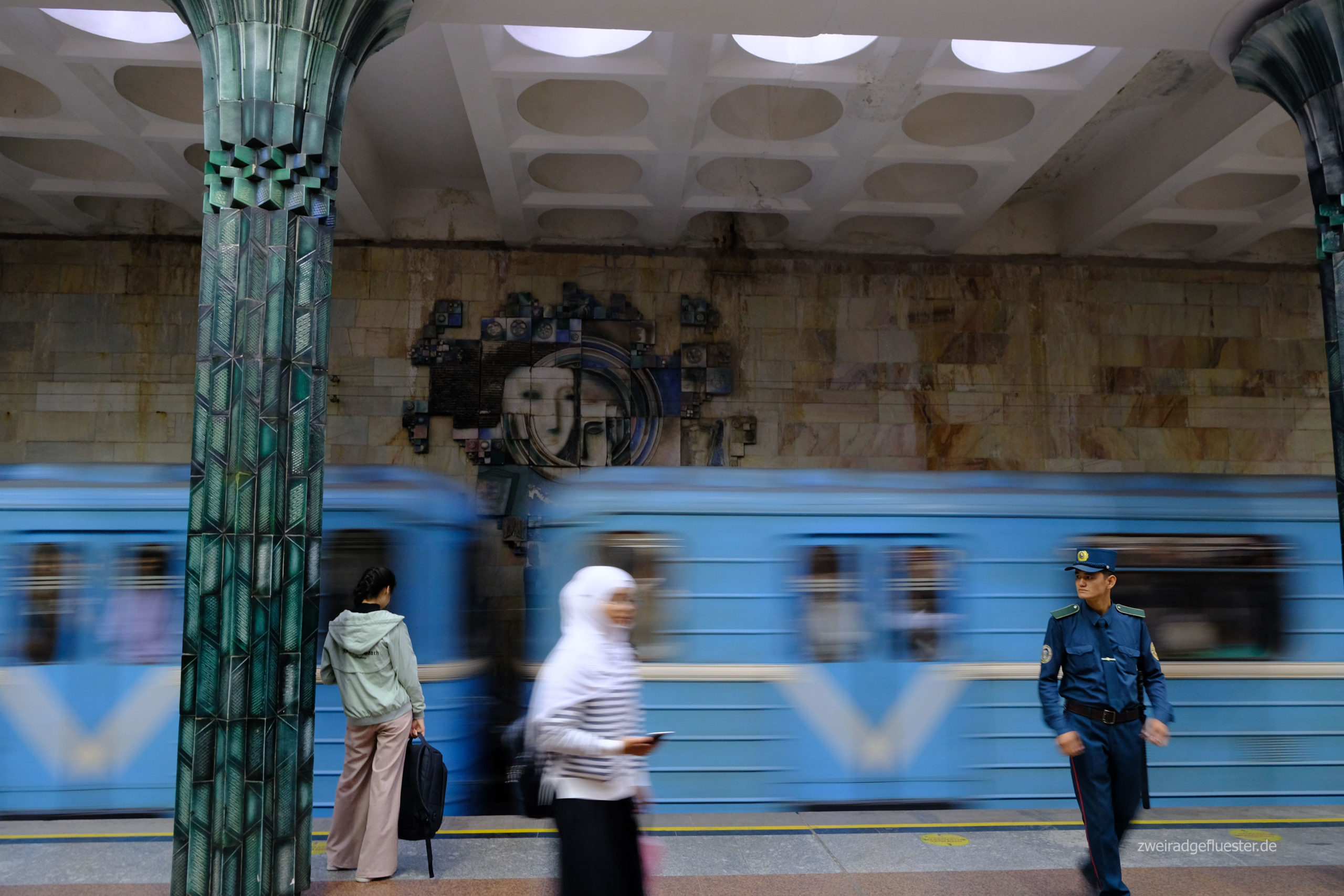 Wir haben eine schöne Zeit zusammen in Taschkent, welches für seine Mischung aus moderner und sowjetischer Architektur und seine mit unterschiedlichen Motiven gestalteten Metrostationen bekannt ist.