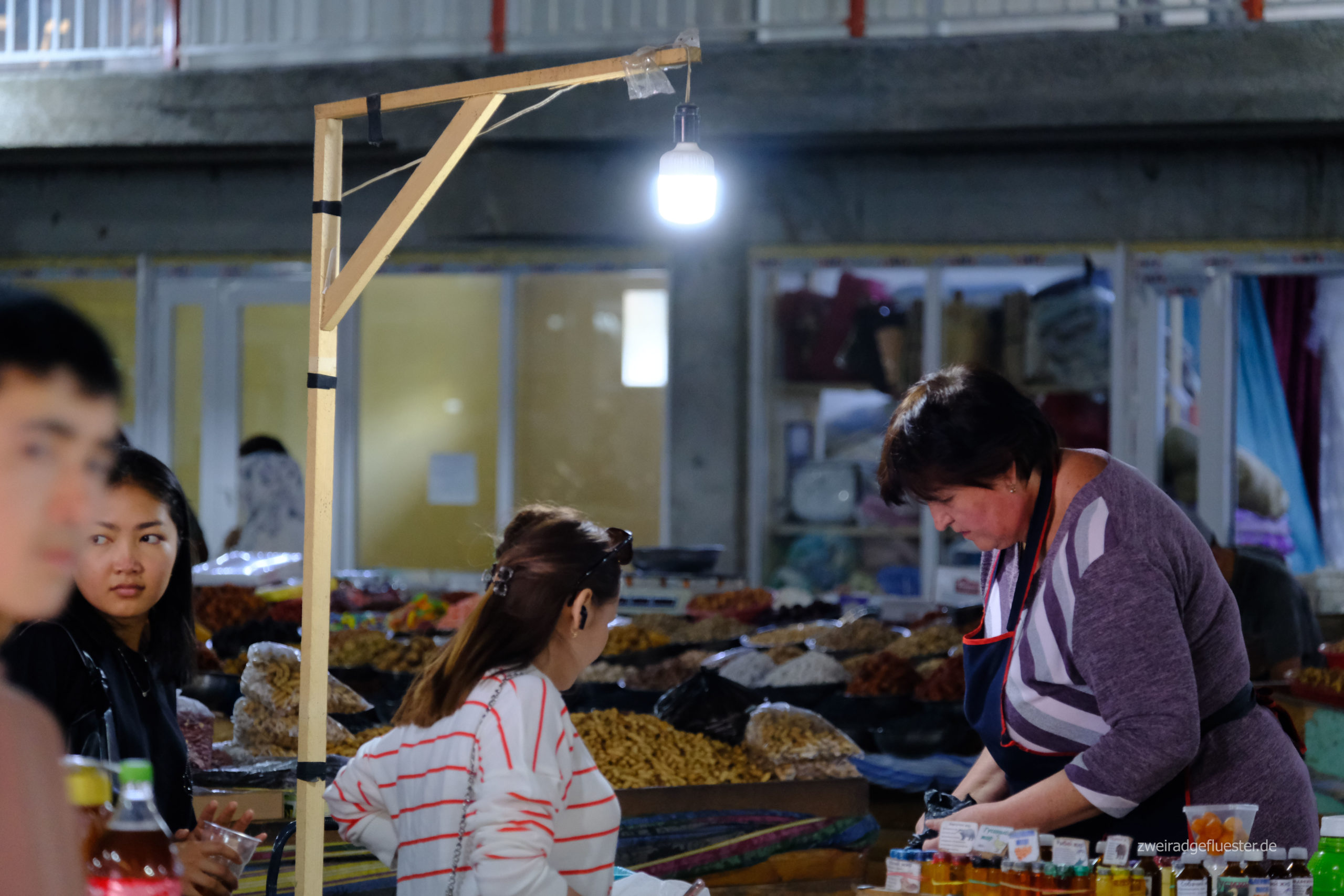 Unsere Lungen müssen förmlich aufblühen als wir die Stadt Jalal Abad erreichen. Zum ersten Mal in Kirgistan sind wir unter 1.000 Meter und auch sonst blühen unsere Herzen auf, als wir über den üppigen Bazaar der Stadt laufen. Wir wissen gar nicht wo wir zuerst hinschauen und zugreifen sollen.