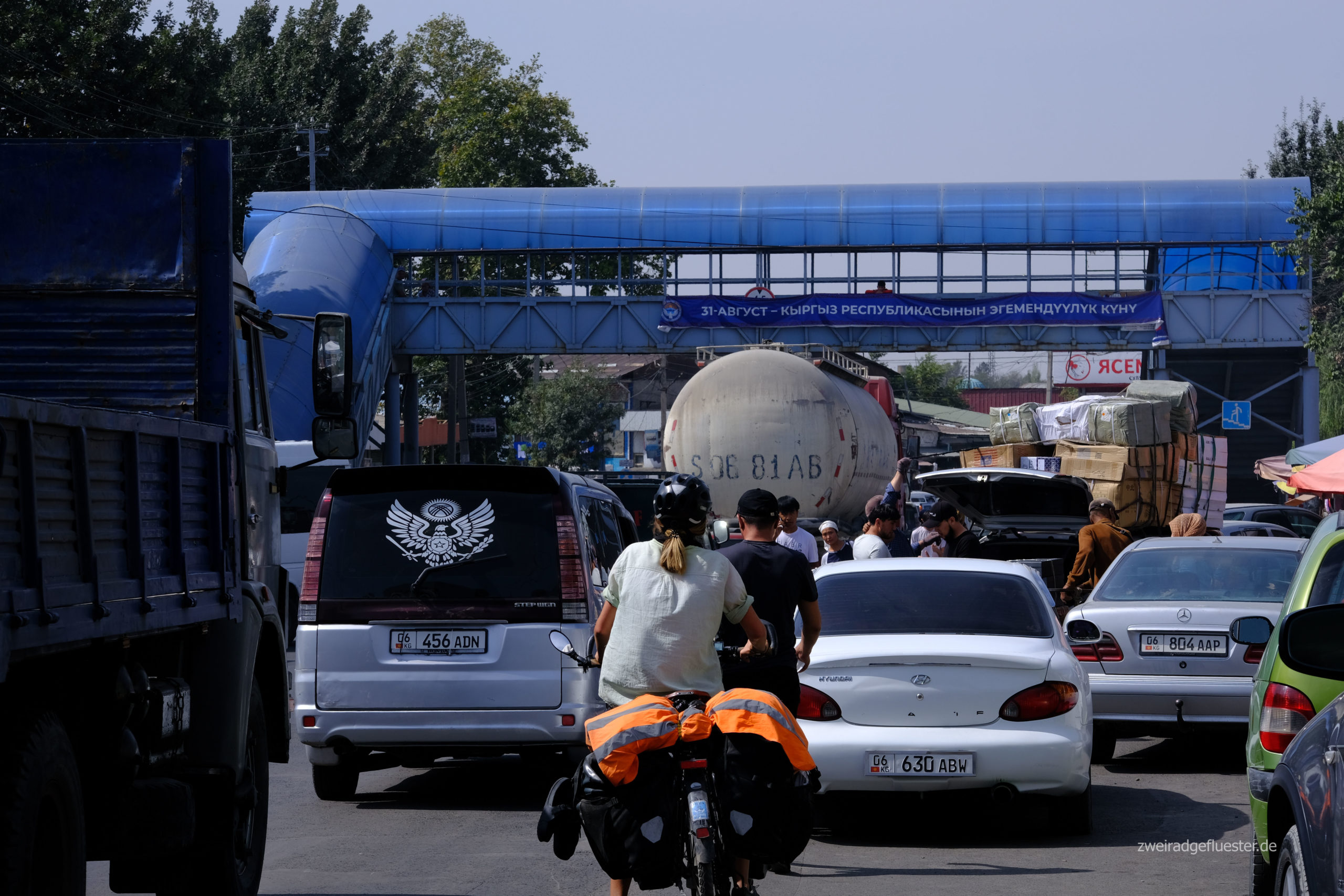 Direkt hinter Osh steht unser nächster Grenzübertritt bevor. Es herrscht reges Treiben vor den Zäunen. Manche Leute haben ähnlich viel Gepäck dabei wie wir, vom Flachbildfernseher bis hin zum Tandor. Wenn man nicht aufpasst, steht man hier ewig an, denn schon seit dem Iran stellen sich die Menschen nicht mehr so gern in den Schlangen an, wie wir es aus unserer Heimat gewohnt sind und es wird lieber fleißig vorgedrängelt.