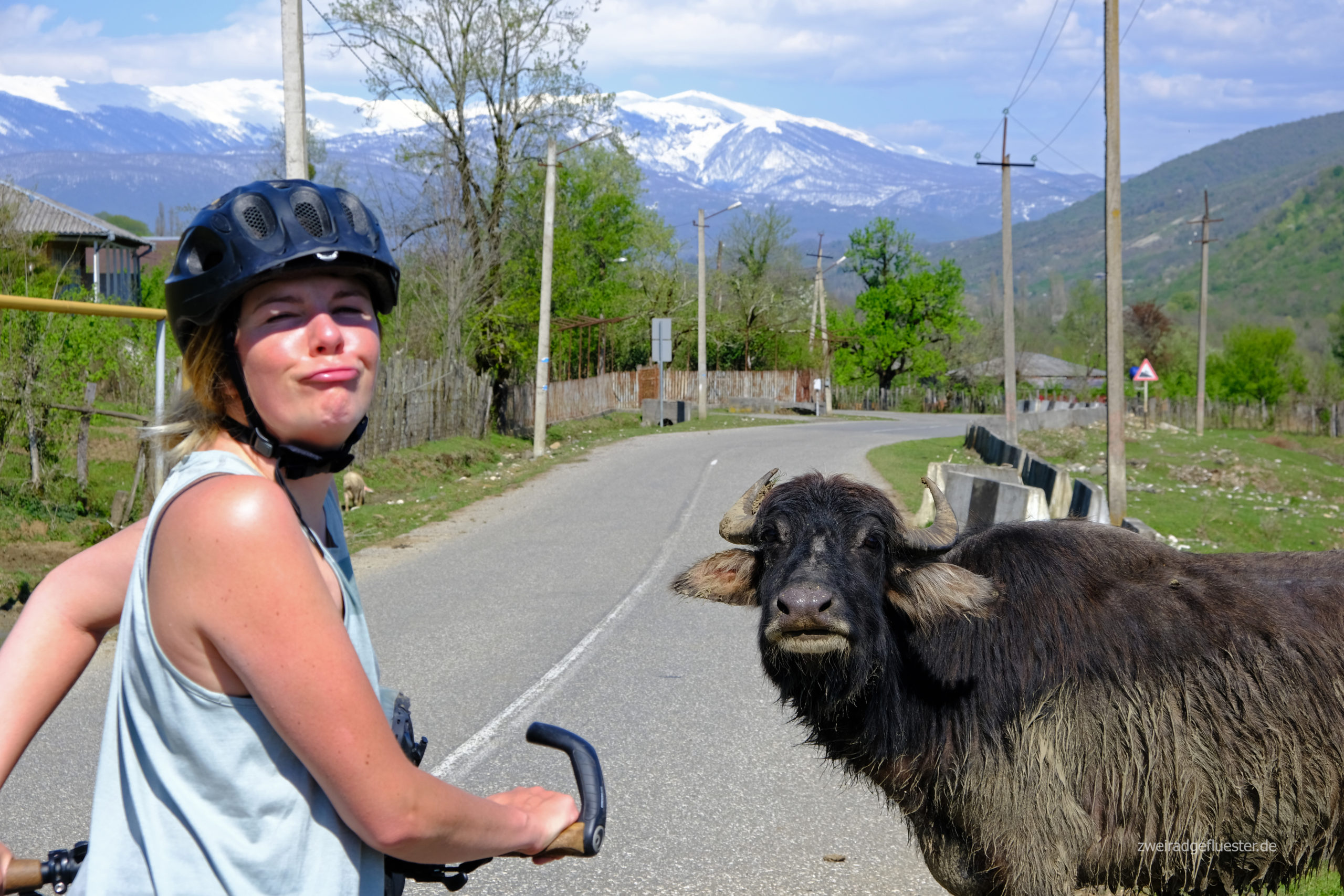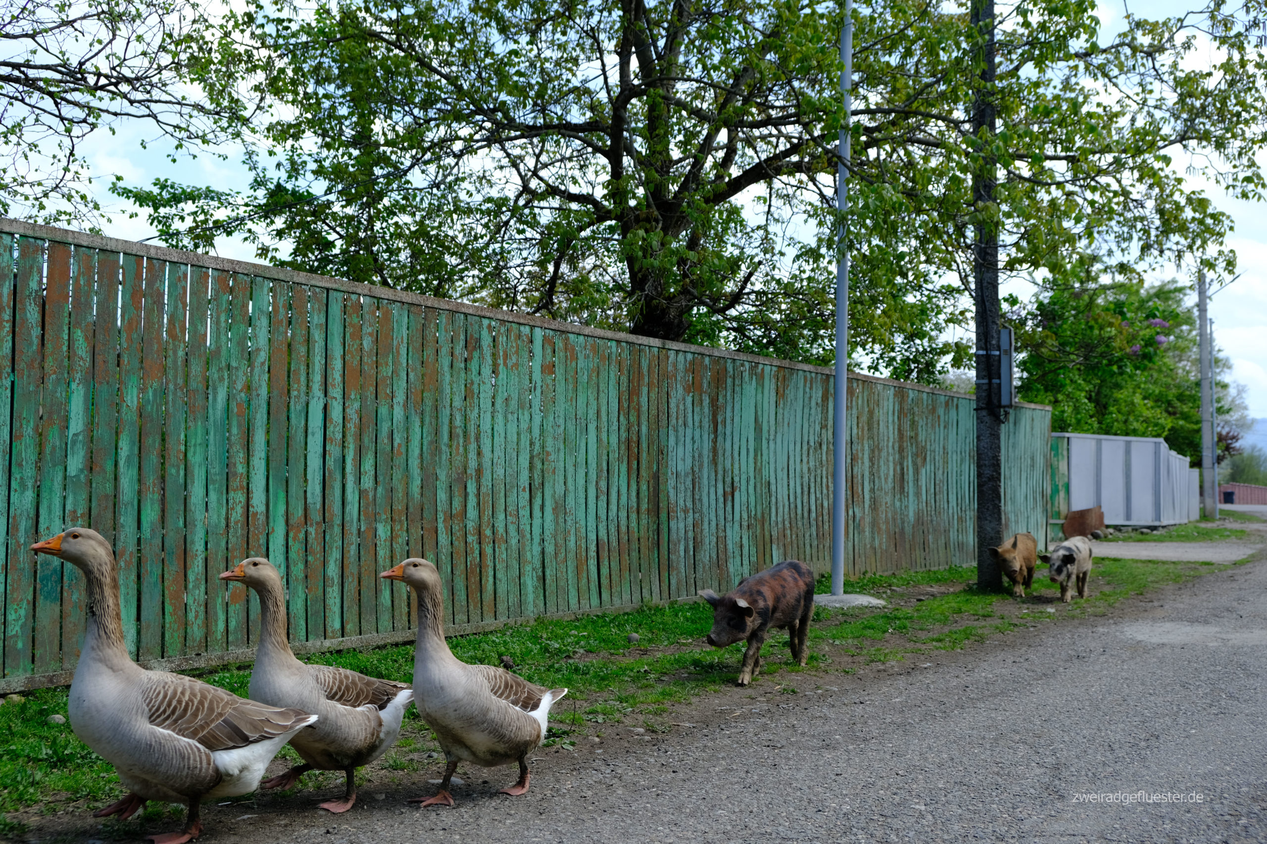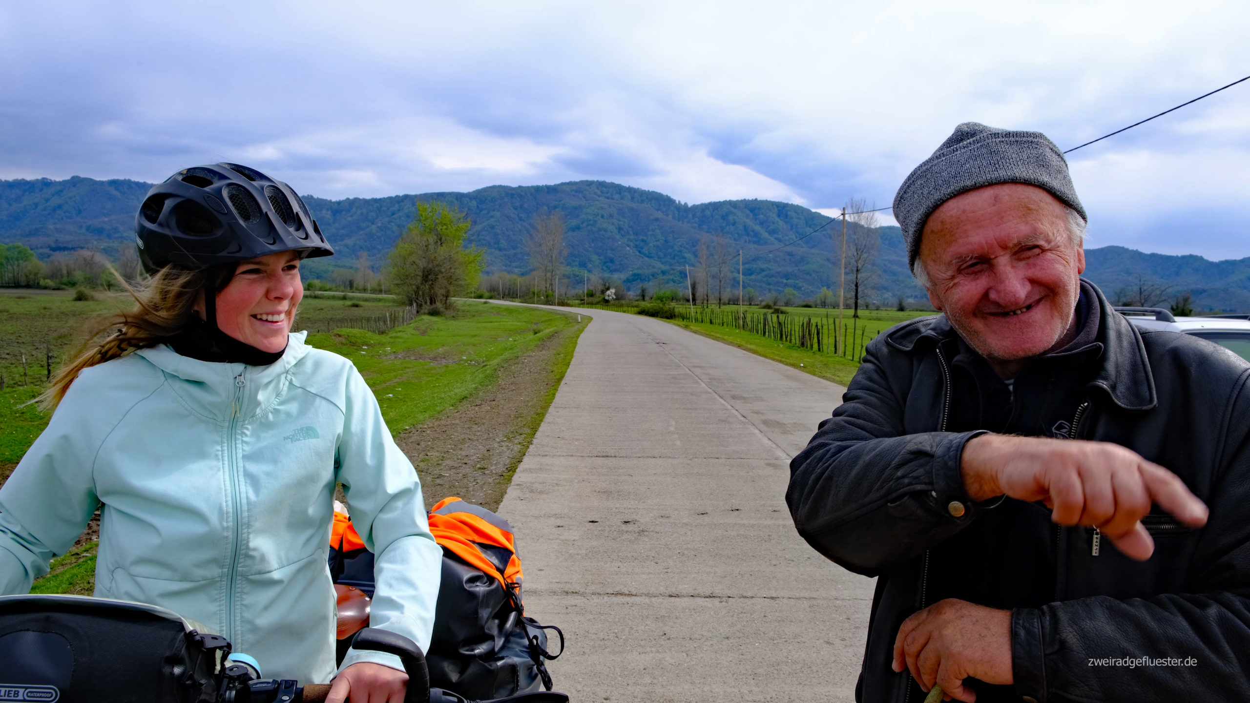 Wir radeln über kleine Straßen durch kleine Dörfer oder Siedlungen. Die Georgier:innen begegnen uns stets mit einer freudig grüßenden, herzlich lächelnden Offenheit. Sollten wir mal kurz stehen bleiben und nach dem Weg schauen, kommen direkt ein, zwei Leute herbei und wollen uns weiterhelfen. Doch das wir uns für kleine Wege und nicht für die stark befahrene Bundesstraße interessieren, stößt bei den Meisten auf Unverständnis. Nach anfänglichen Erklärversuchen sind wir schließlich dazu übergegangen, bei der Frage wohin wir wollen, einfach das nächste Dorf zu nennen, was man nur über die kleinen Straßen erreichen kann. Sollten wir uns doch mal bei der Ortschaft vertan haben und diese über die Bundesstraße besser zu erreichen sein, wird uns heftig kopfschüttelnd, die Arme verkreuzend von dem Weg abgeraten. Wir atmen dann kurz durch, trinken einen Schluck, warten bis das Auto um die Ecke gefahren ist und radeln weiter.