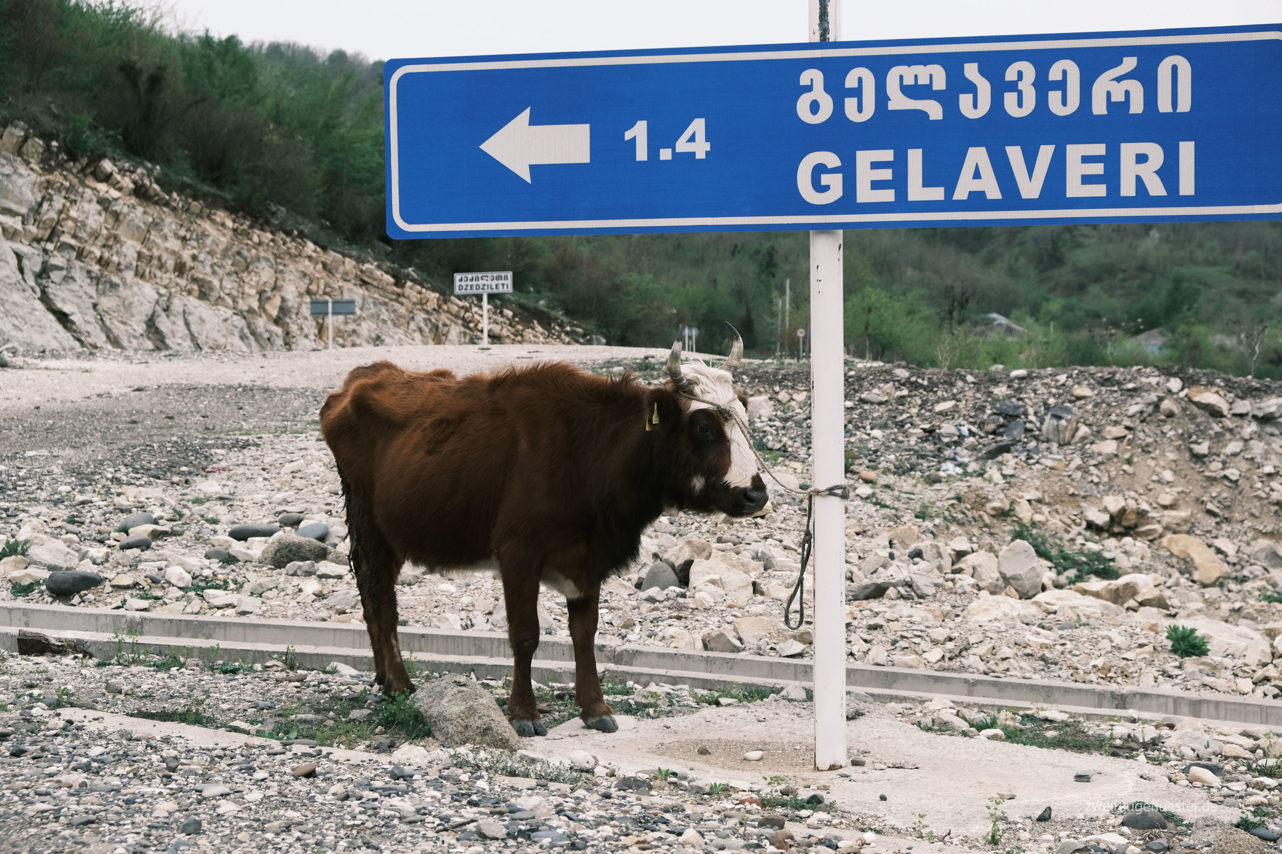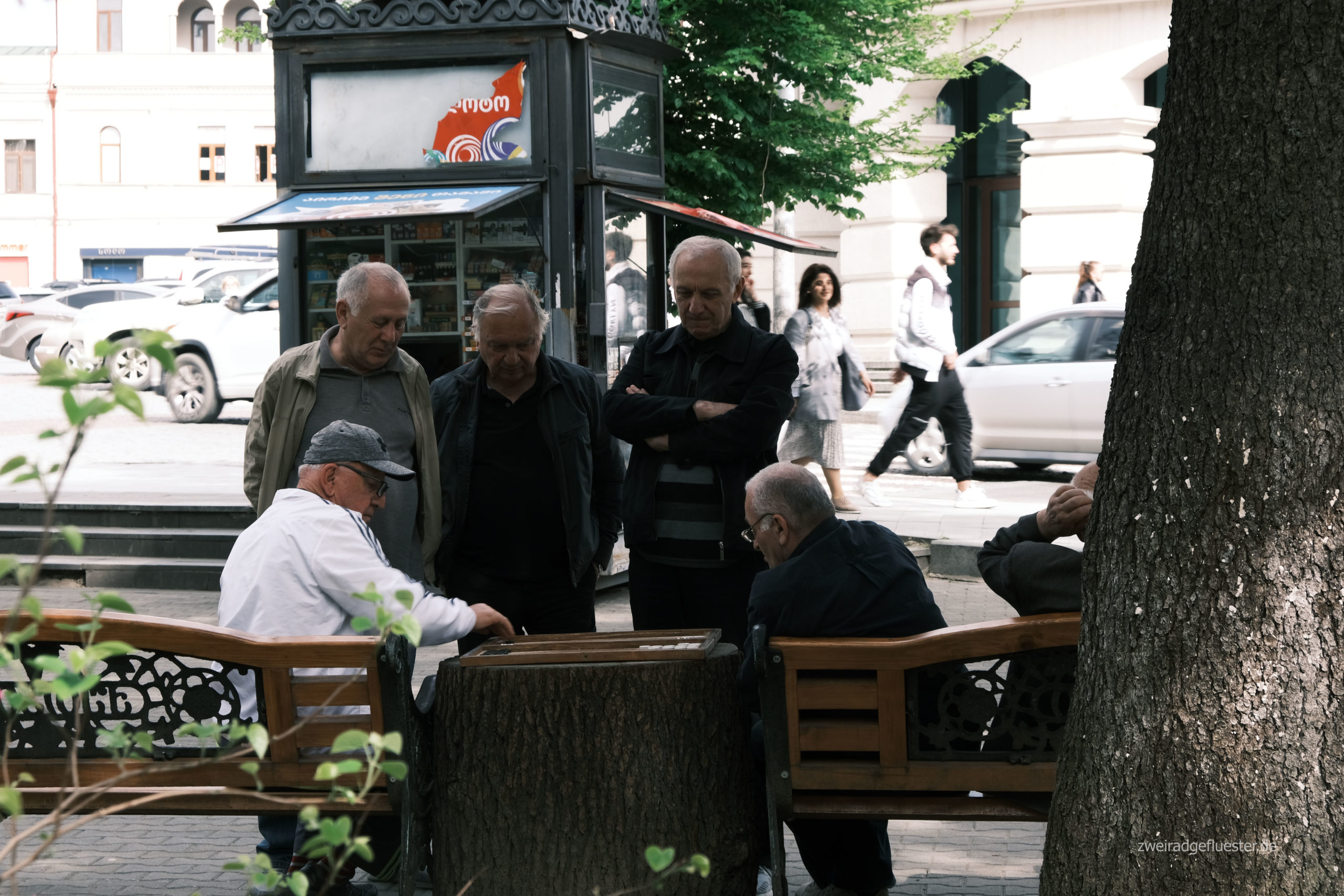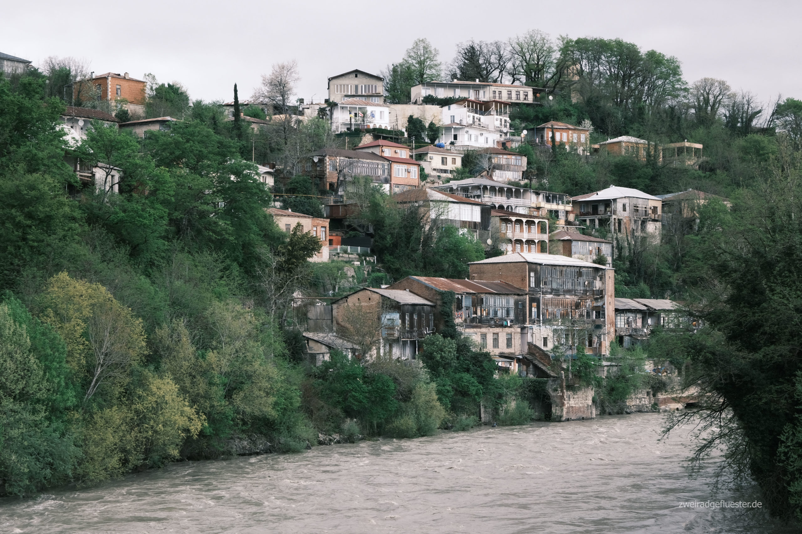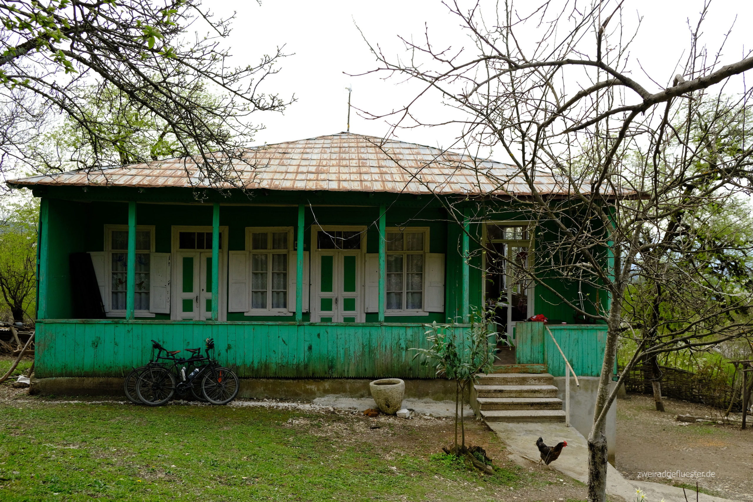 Wir radeln über kleine Straßen durch kleine Dörfer oder Siedlungen. Die Georgier:innen begegnen uns stets mit einer freudig grüßenden, herzlich lächelnden Offenheit. Sollten wir mal kurz stehen bleiben und nach dem Weg schauen, kommen direkt ein, zwei Leute herbei und wollen uns weiterhelfen. Doch das wir uns für kleine Wege und nicht für die stark befahrene Bundesstraße interessieren, stößt bei den Meisten auf Unverständnis. Nach anfänglichen Erklärversuchen sind wir schließlich dazu übergegangen, bei der Frage wohin wir wollen, einfach das nächste Dorf zu nennen, was man nur über die kleinen Straßen erreichen kann. Sollten wir uns doch mal bei der Ortschaft vertan haben und diese über die Bundesstraße besser zu erreichen sein, wird uns heftig kopfschüttelnd, die Arme verkreuzend von dem Weg abgeraten. Wir atmen dann kurz durch, trinken einen Schluck, warten bis das Auto um die Ecke gefahren ist und radeln weiter.