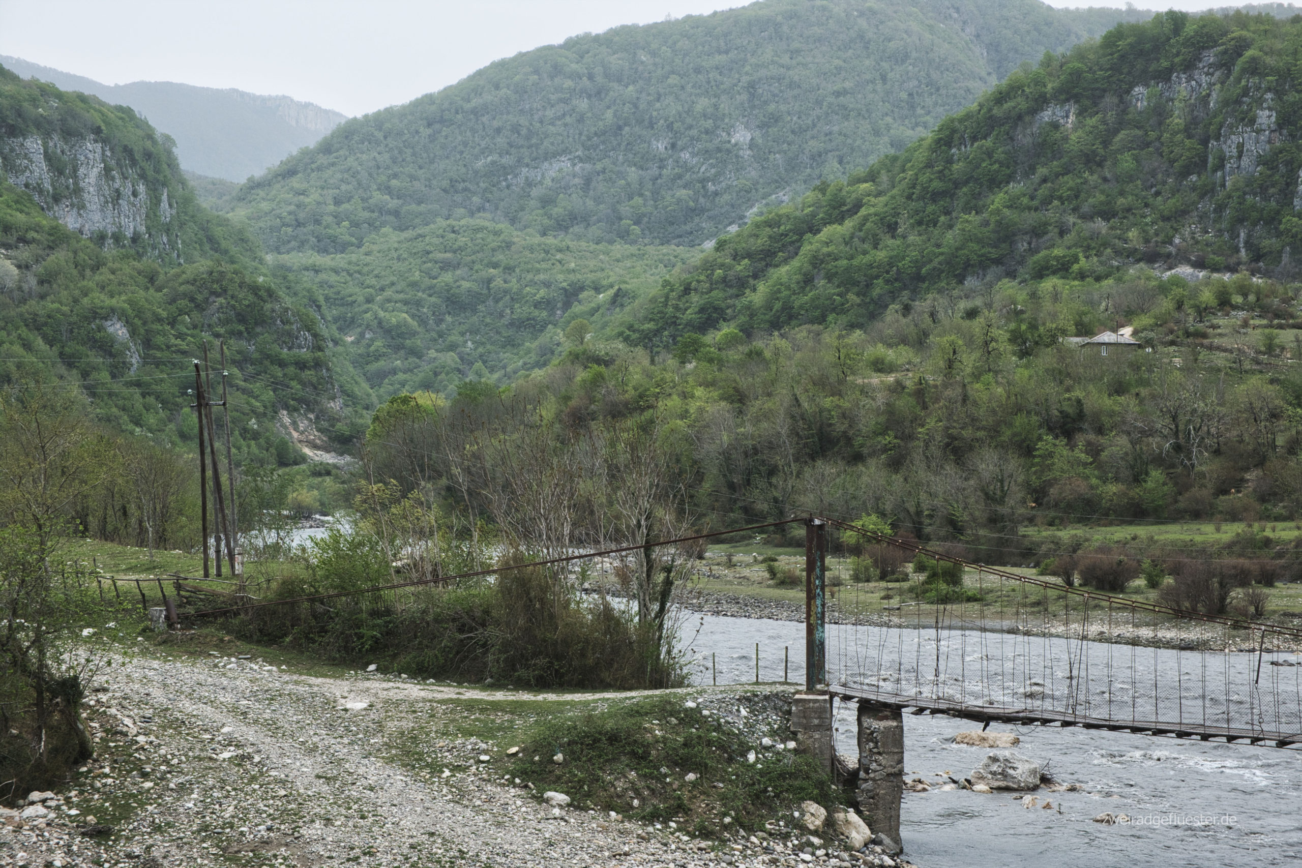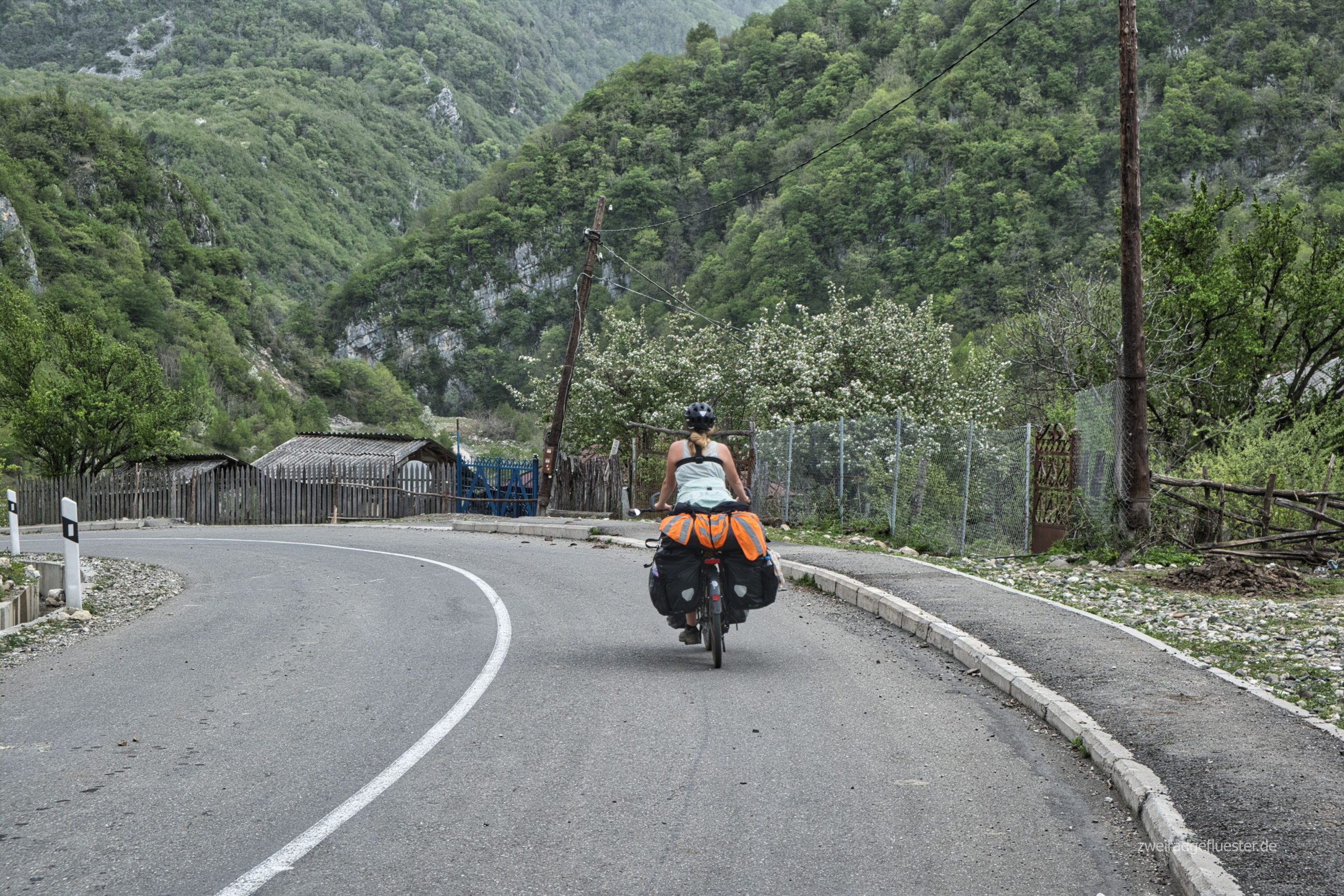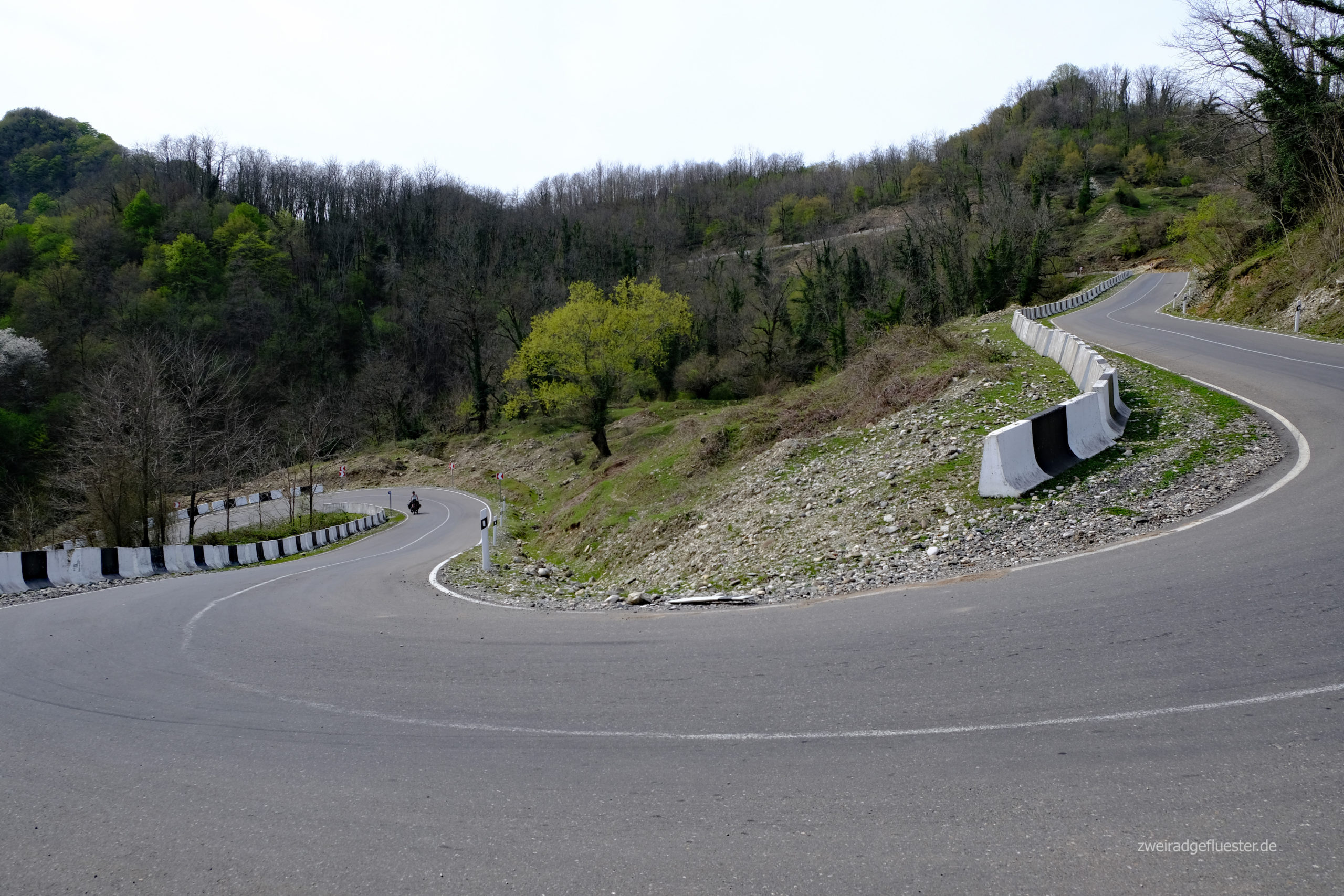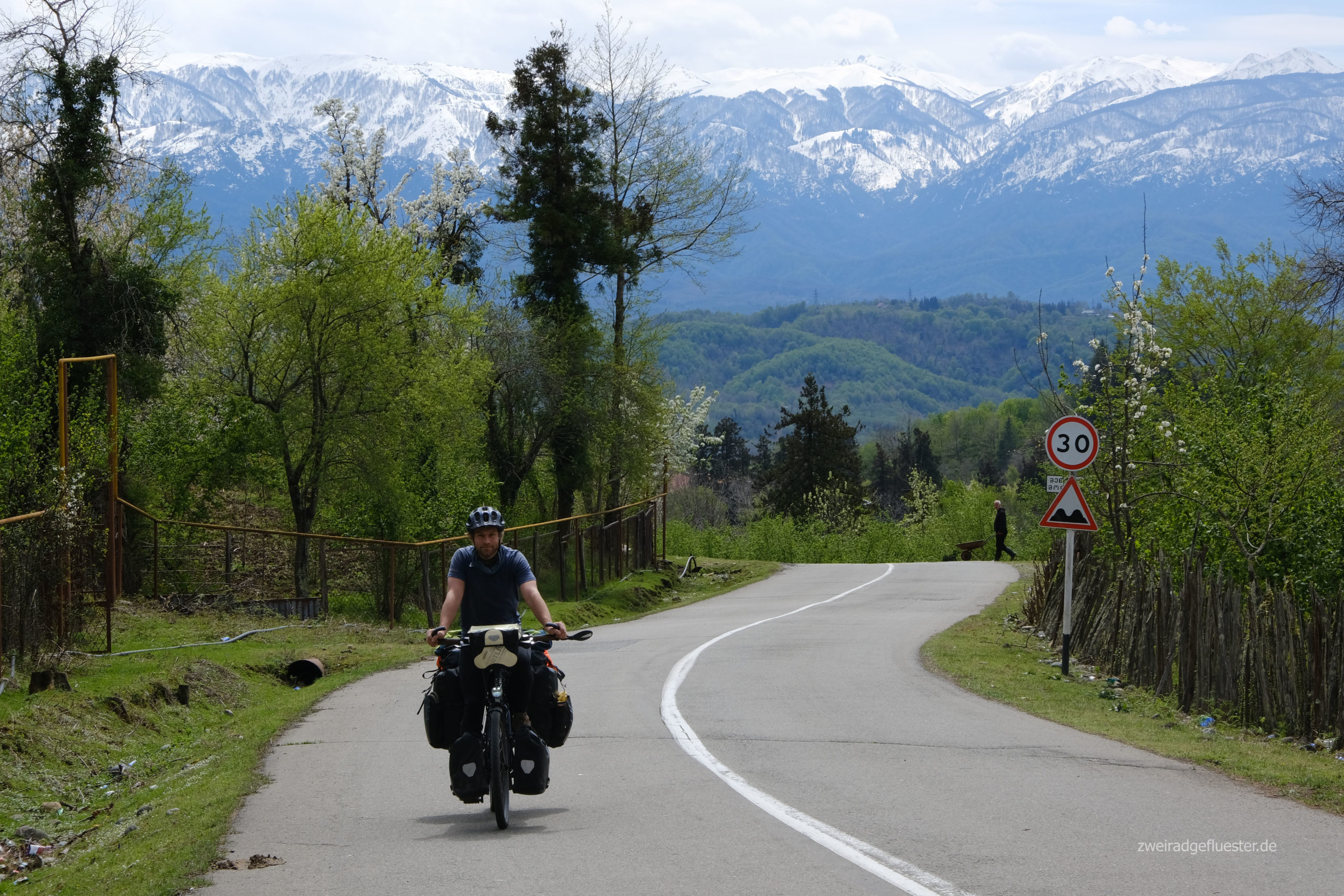 Von da aus führt uns eine kräftezehrende Bergetappe in den Großen Kaukasus, wo wir den Okatse Canyon bestaunen wollen. Der Weg dahin fordert unsere Beine seit Langem mal wieder richtig. Nichts ahnend, was hier vor uns liegt, starten wir am frühen Nachmittag in die Berge. Die umsorgten Blicke der Autofahrer und ihr Angebot uns mitzunehmen, als wir sagen wo wir hin wollen, irritieren uns genauso wenig wie der Opi auf dem Moped, der scheinbar aus Mitleid nochmal zurückkommt, um uns ein paar Äpfel zu schenken. Als wir den ersten Anstieg erreichen ändert sich unsere Wahrnehmung. Wir schauen uns erst jetzt so richtig an, wo wir da eigentlich hin radeln wollen… Am Ende werden es gute 1.000 Höhenmeter, die wir mal eben am Nachmittag überwinden müssen.