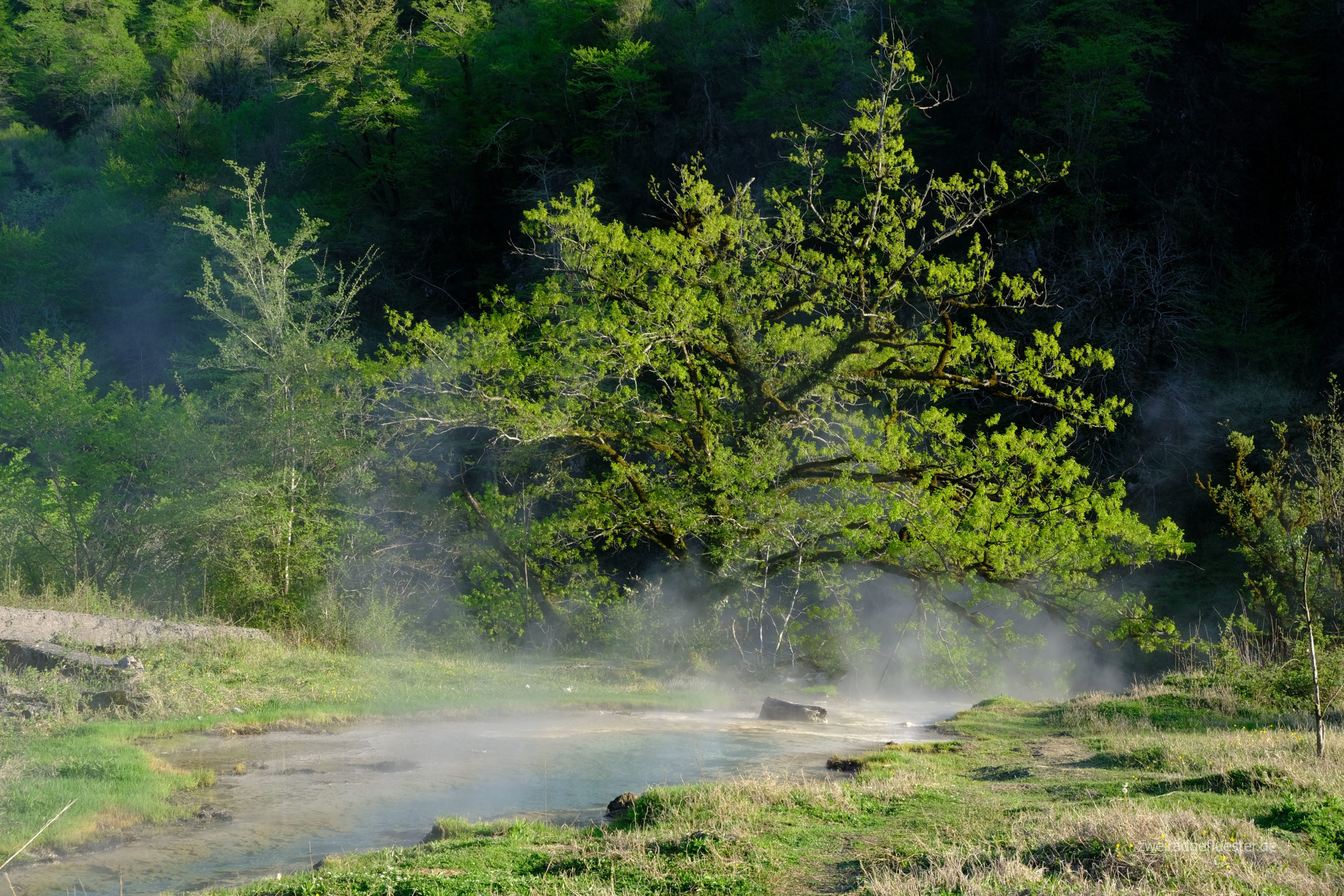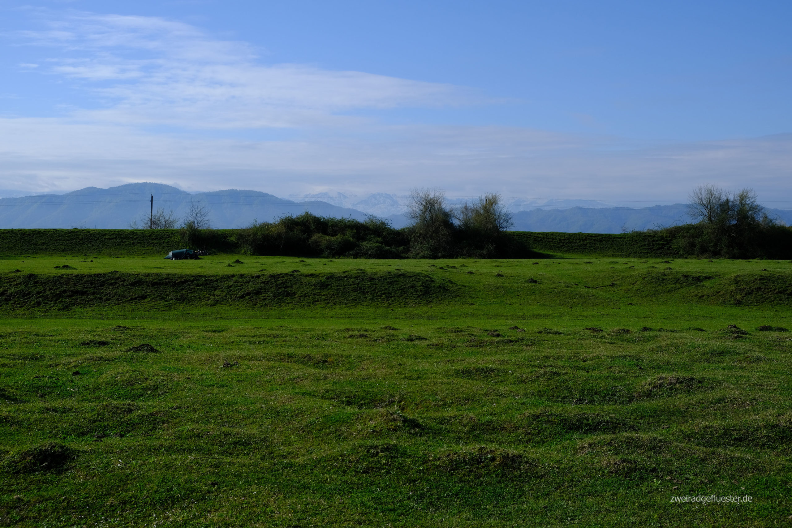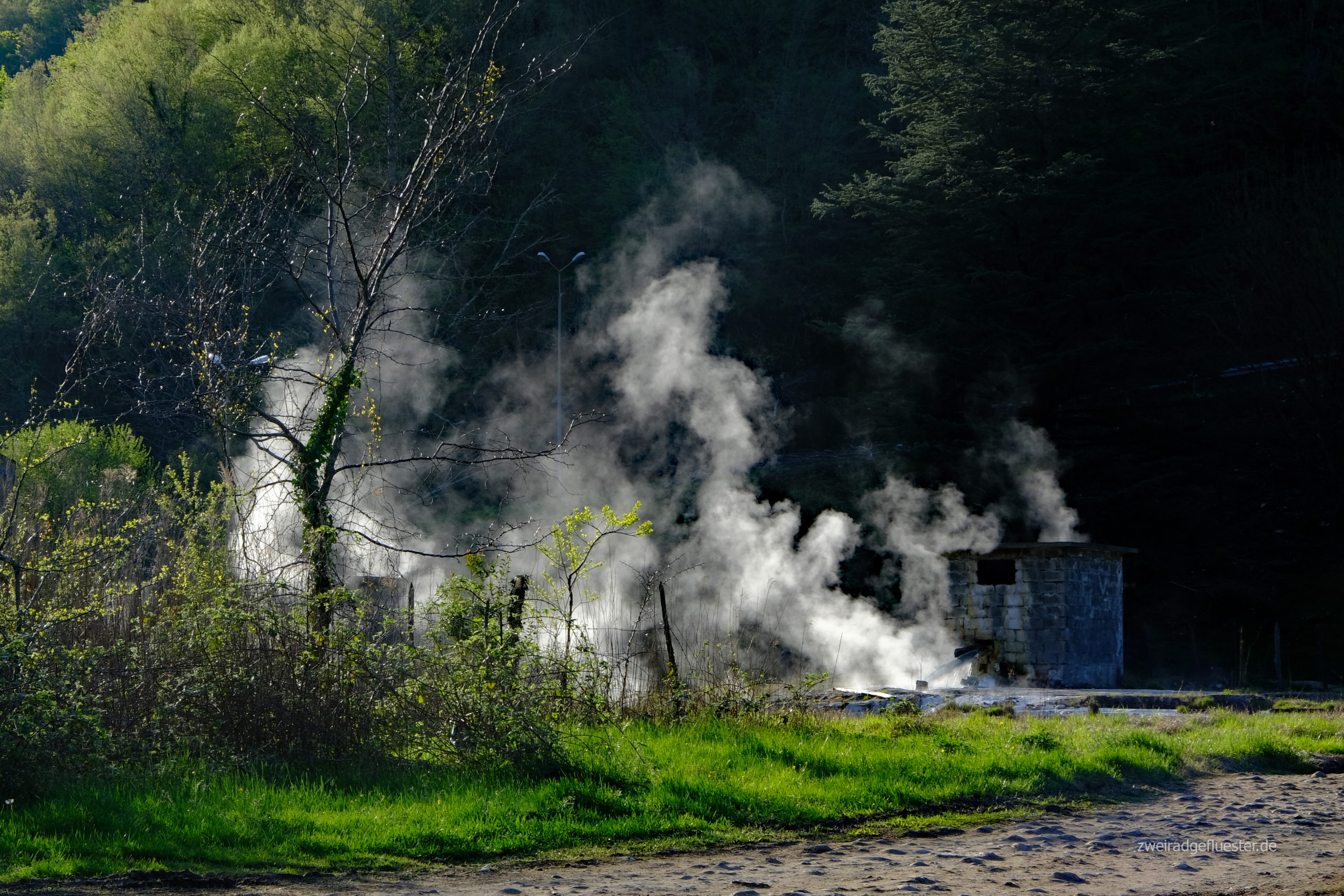 Unser Weg führt uns an den Fuß des Großen Kaukasus, ein Faltengebirge dessen Berge, wie beispielsweise der Elbrus mit seinen 5.642 m, teilweise ruhende Vulkane sind und damit auf die tektonischen Unruhen hinweisen. Kein Wunder, dass es hier unter der Erde weiterhin brodelt und es viele heiße, schwefelige Quellen gibt. Eine davon genießen wir in vollen Zügen.