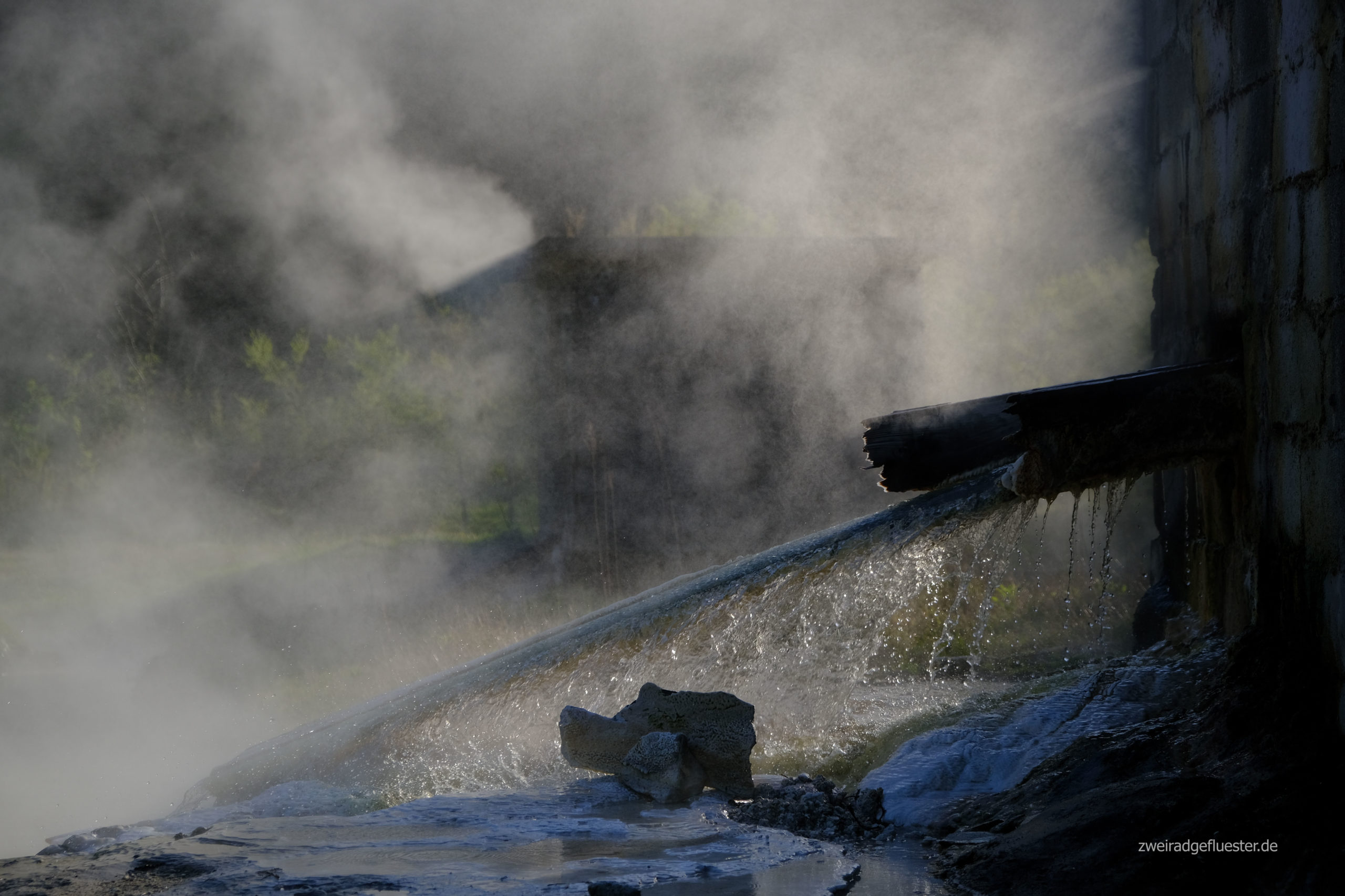 Mit 75°C sprudelt das Wasser hier aus der Erdoberfläche. Manch einer kocht sich hier sein Frühstücksei im Quellwasser. Man erzählt uns, dass das Gelände wohl vor hundert Jahren noch ein Heilbad war, heute sind hier nur noch Ruinen und kleine Hütten auf den Quellen. Einheimische verschließen diese provisorisch und nutzen sie als Natursauna.