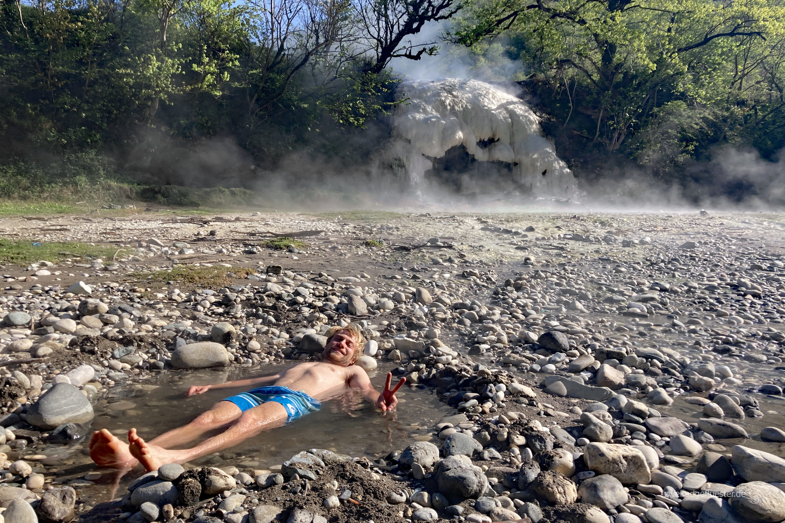 Das heiße Wasser fließt einen kleinen, weiß-versinterten Wasserfall hinunter und mündet anschließend in den kalten Gebirgsfluss. Auf dem Weg dahin kühlt es immer weiter ab und je nach Temperaturwunsch gräbt man sich ein Loch in den Boden, lässt es mit Quellwasser volllaufen und genießt das heiße Bad, bevor es zur Abkühlung in den kalten Fluss geht. Eine wahre Wohltat nach einem anstrengenden Radeltag.