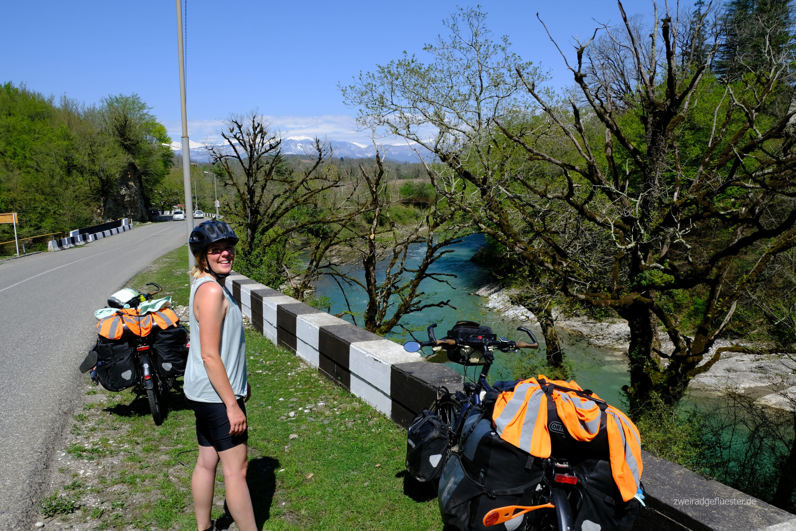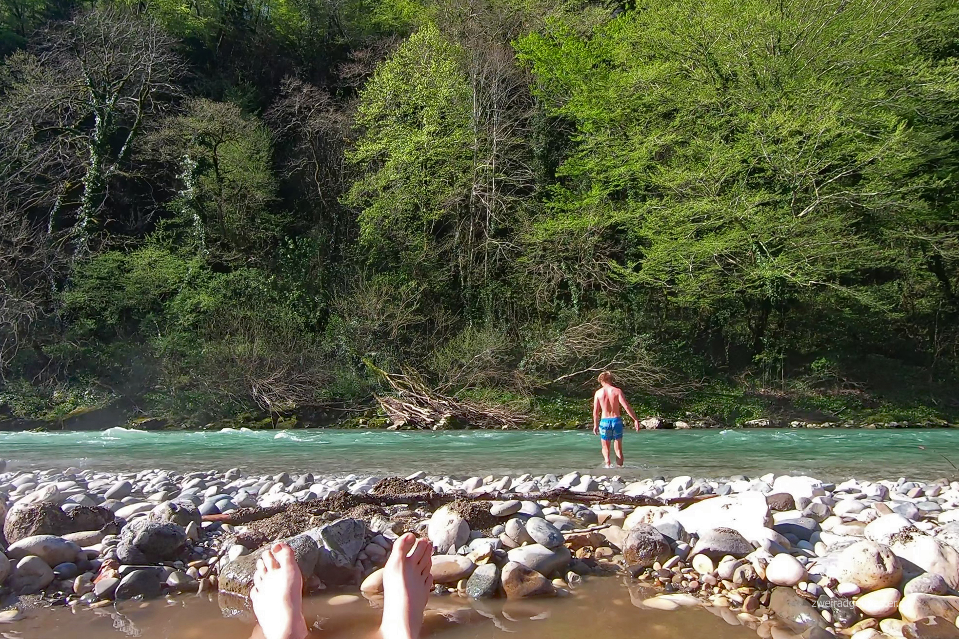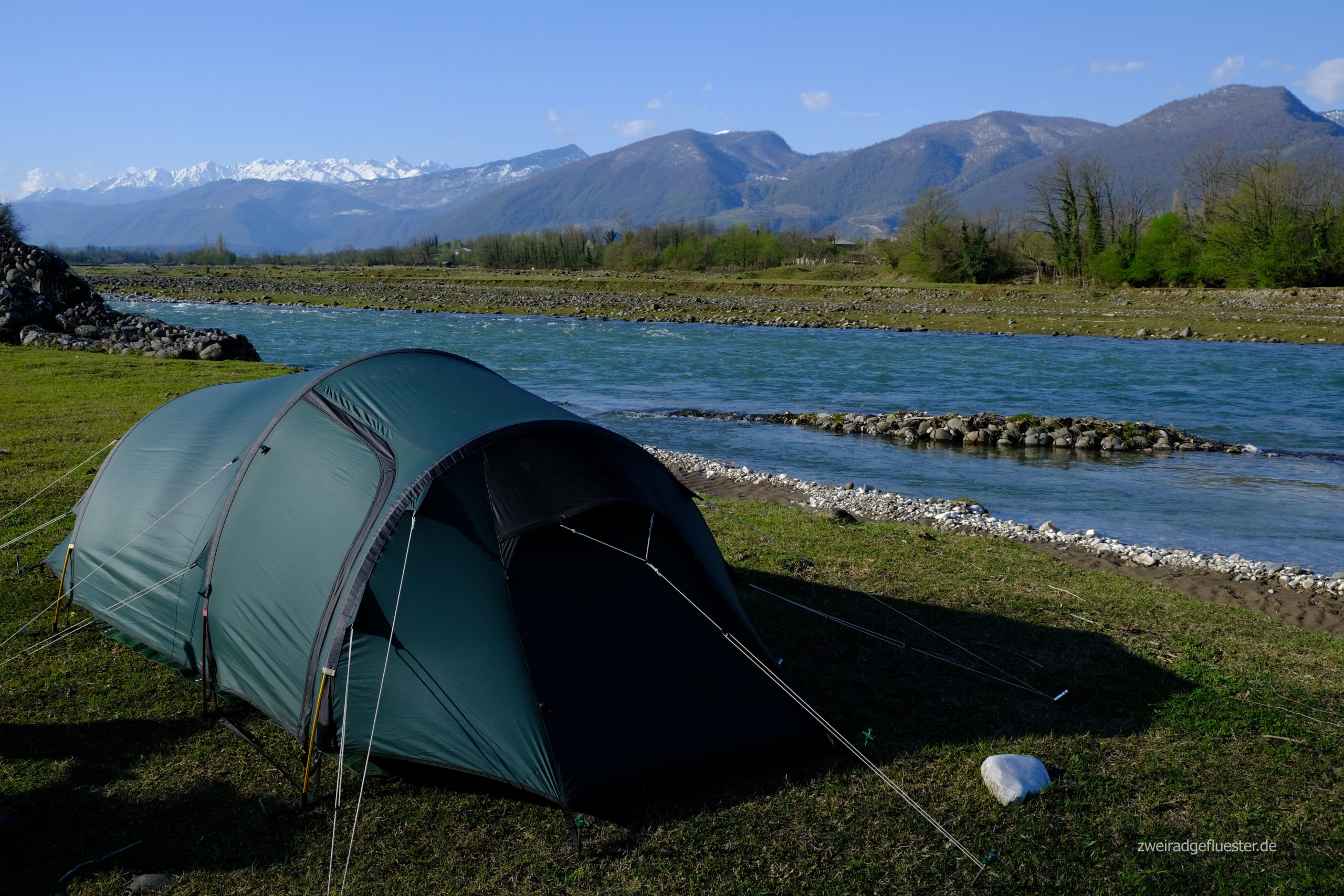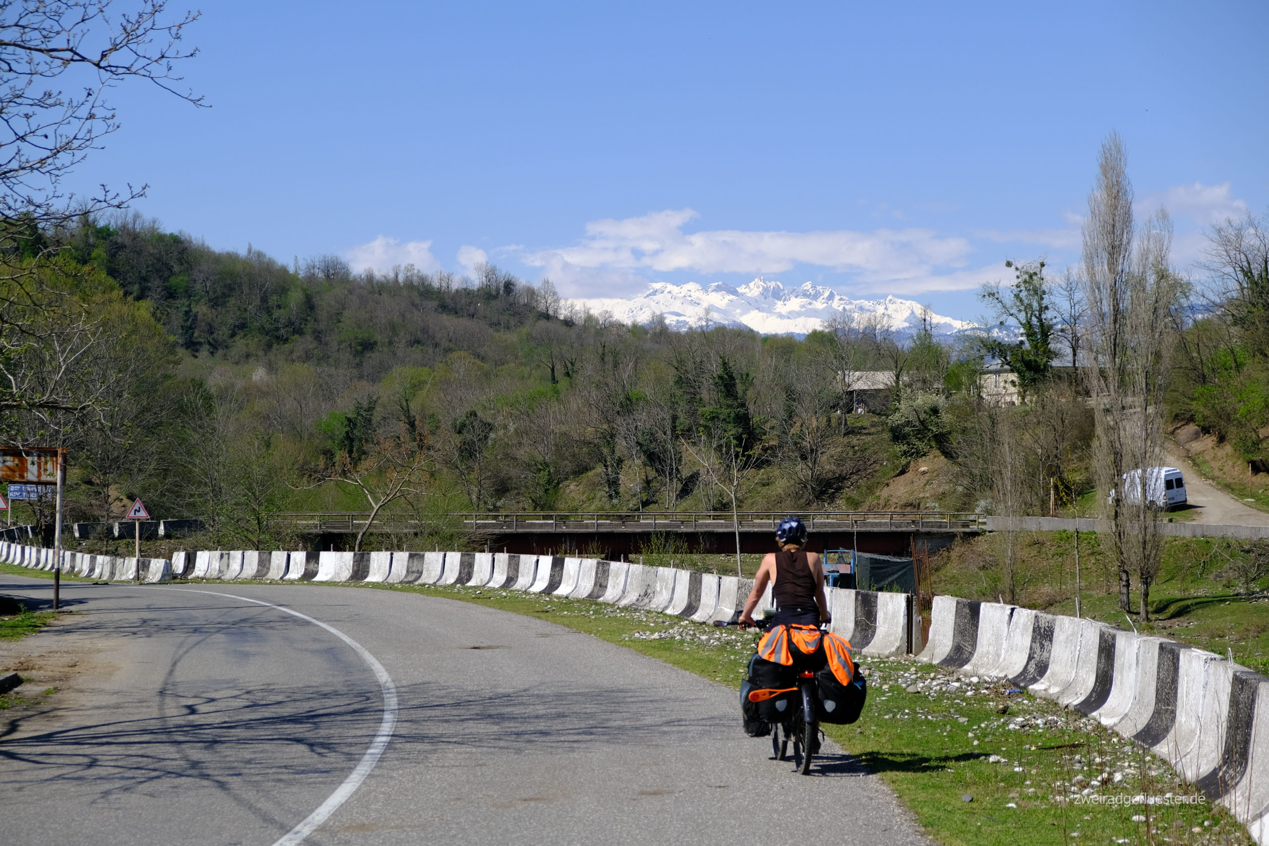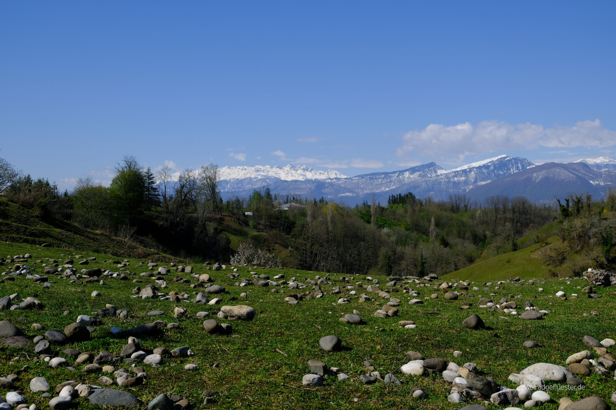 Betrachtet man die topografische Karte von Georgien erkennt man ein relativ flaches Dreieck zwischen Batumi – Sokhumi – Kutaisi, was sich geografisch zwischen dem Schwarzen Meer, dem Kleinen und Großen Kaukasus befindet. Wir erkunden die Gegend und finden wunderbare Plätze zum Zelten an kleinen und großen Wasserströmen, die so langsam die Schneeschmelze in Richtung Westen transportieren. Im Hintergrund präsentiert sich uns stets das beeindruckende Panorama der schneebedeckten Berge.