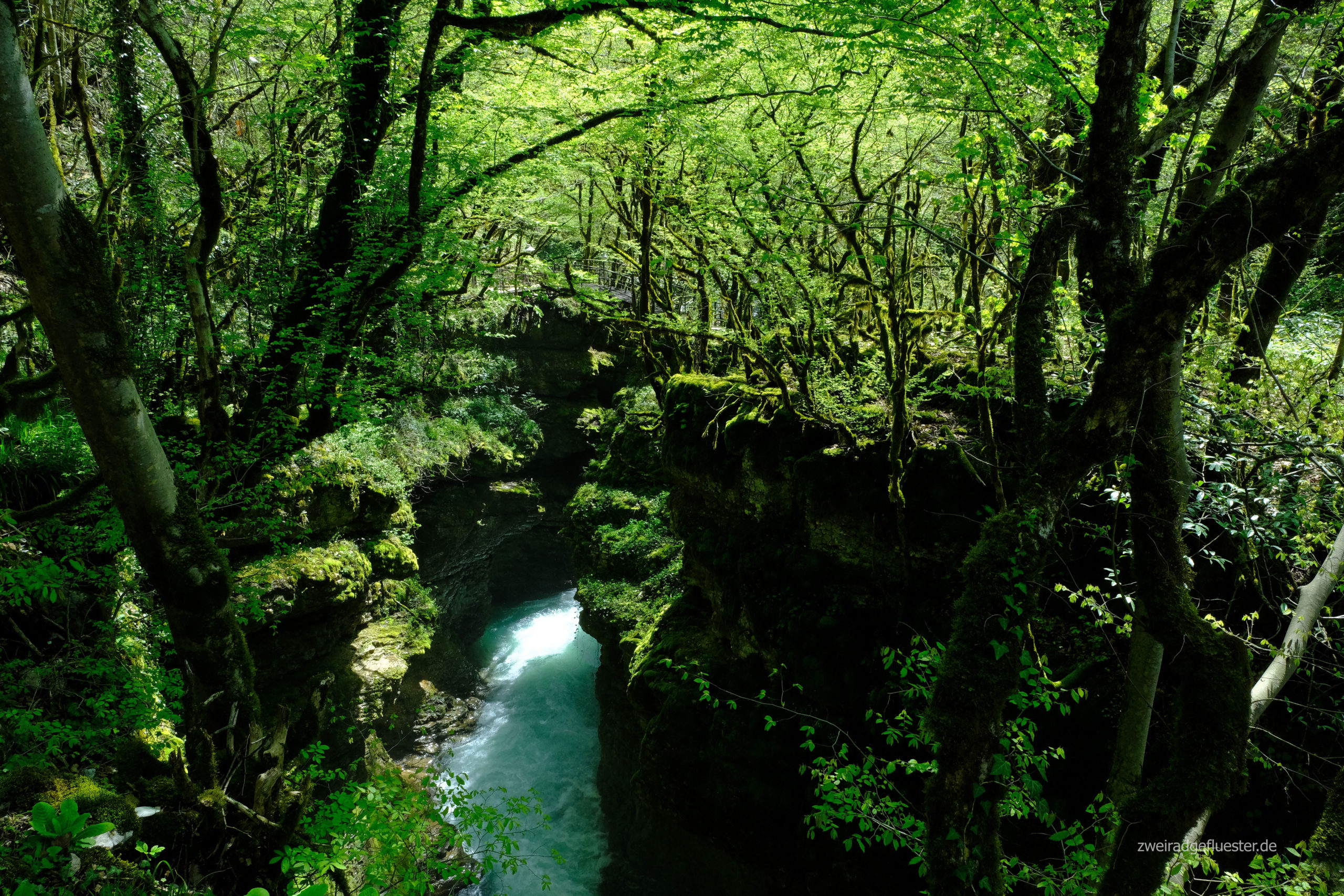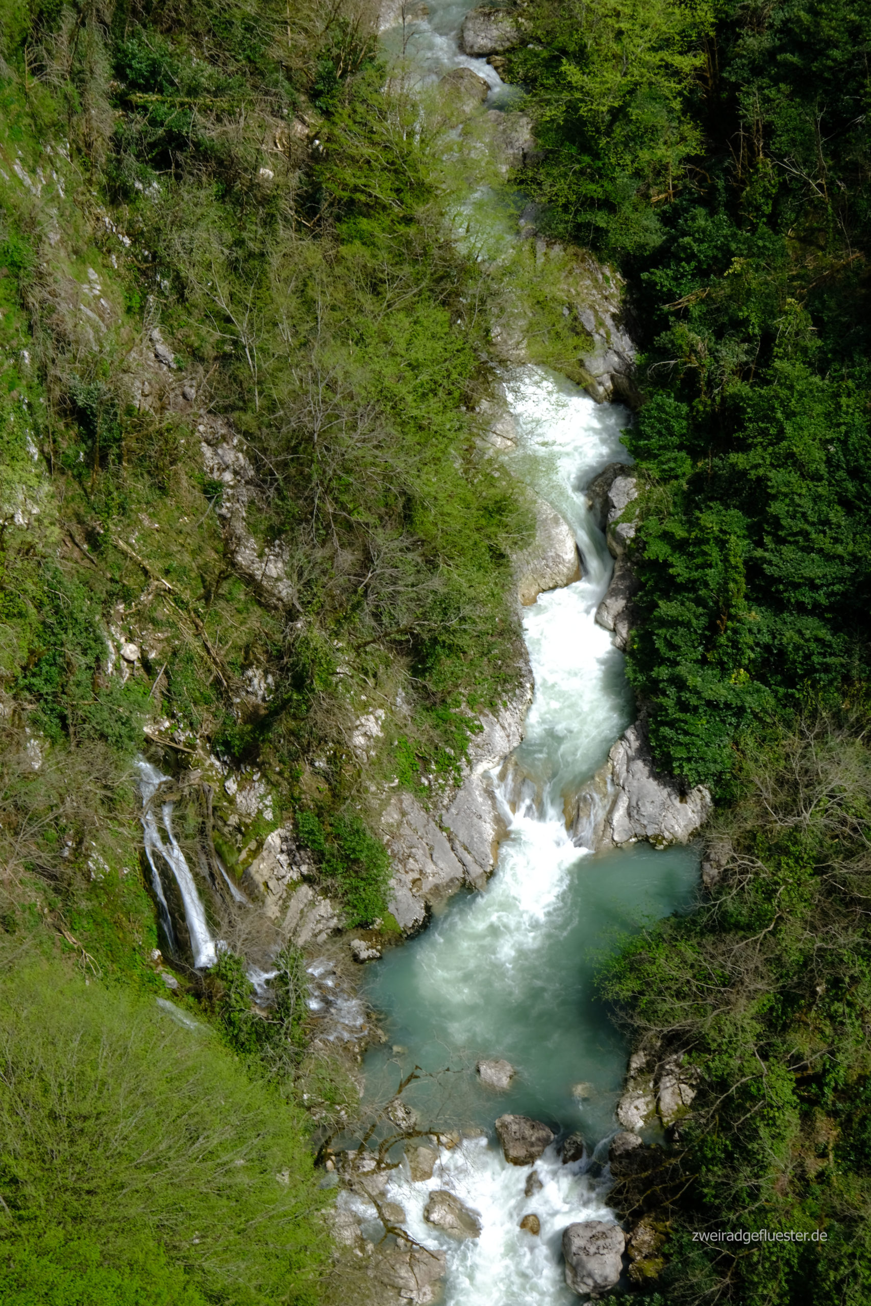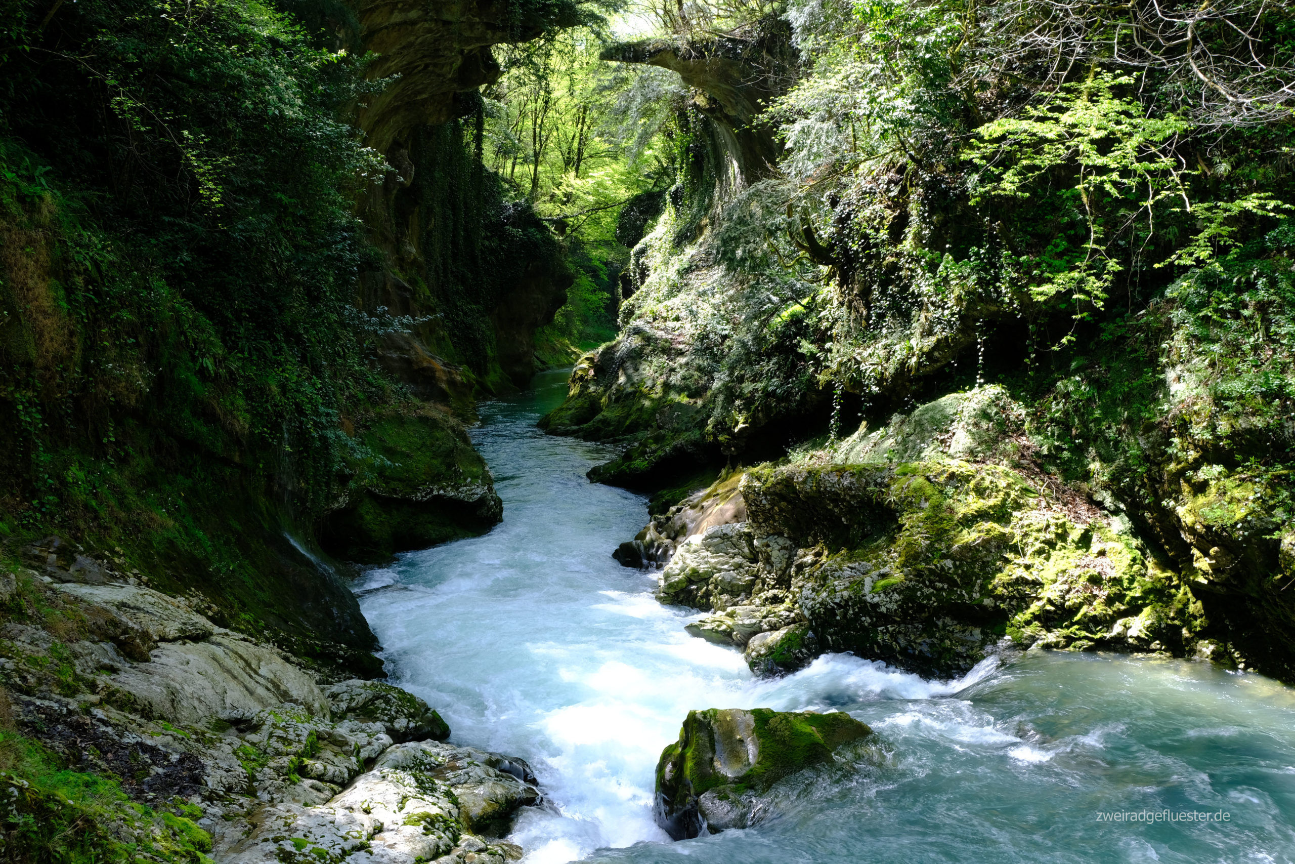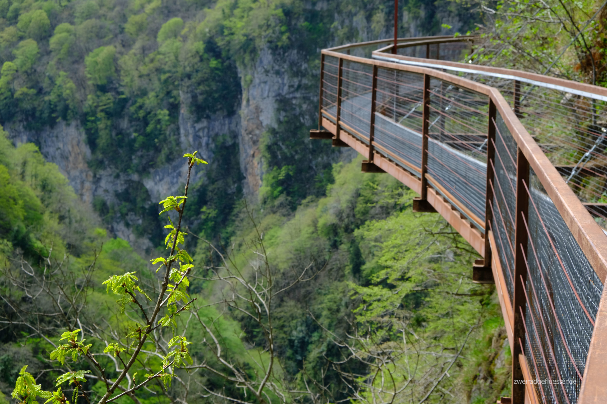 Etwas weiter in Richtung Norden erstreckt sich der Martvili Canyon, eine Erosionsschlucht des Abasha-Flusses. Das Wasser bahnt sich hier mit ziemlicher Wucht einen Weg durch den Canyon. Wir lassen uns auf dem kleinen Wanderpfad von dem Naturschauspiel in allen möglichen Grünnuancen verzaubern. Auf die Erkundung mit dem Boot müssen wir leider verzichten, da der Wasserstand um diese Zeit zu hoch ist.