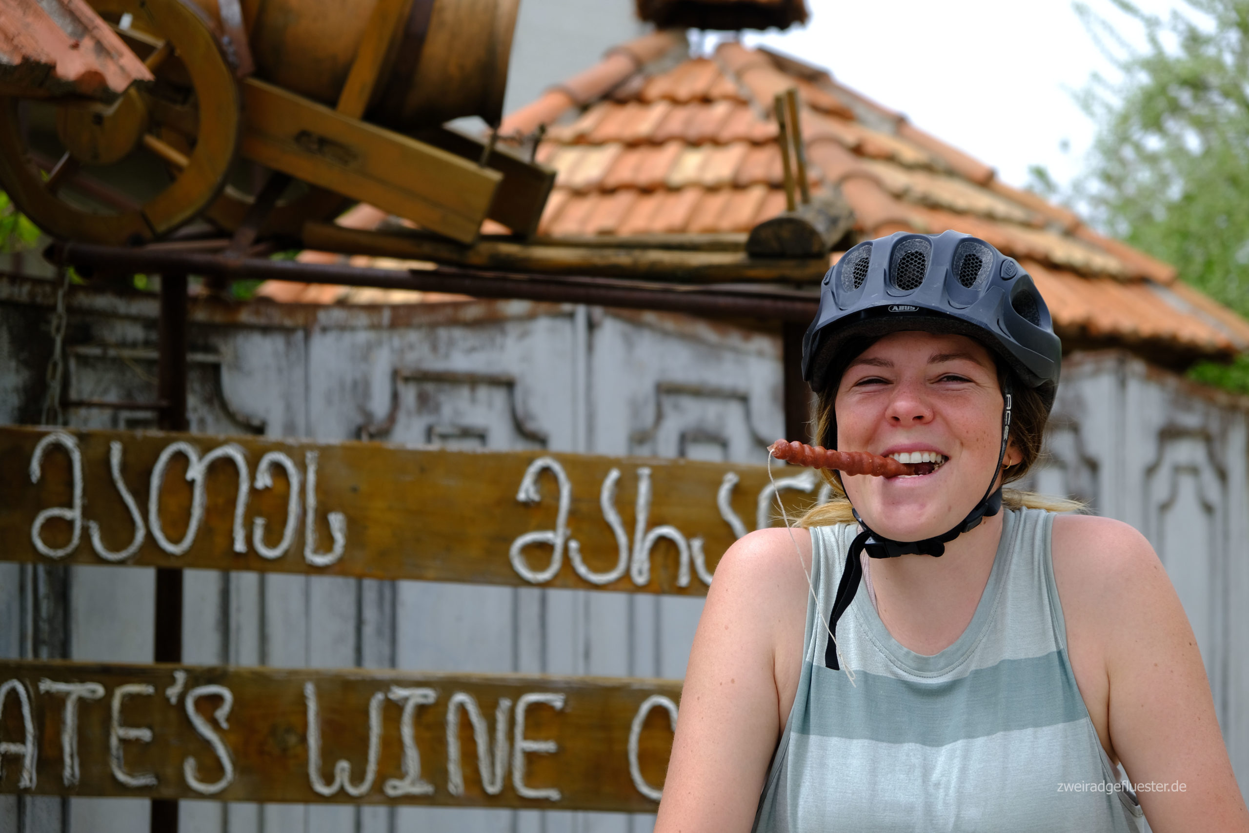 Zu unserer Flasche Wein bekommen wir noch 2 Stangen tschurtschchela, eine georgische Süßigkeit aus Nüssen und Traubensaft, geschenkt, was auch ganz hilfreich ist, um den Alkohol ein bisschen aufzusaugen. Als wir aus dem kühlen Weinkeller kommen, merken wir erstmal wie warm es draußen ist, aber bis Kutaisi rollen wir glücklicherweise nur noch ein Stück bergab.