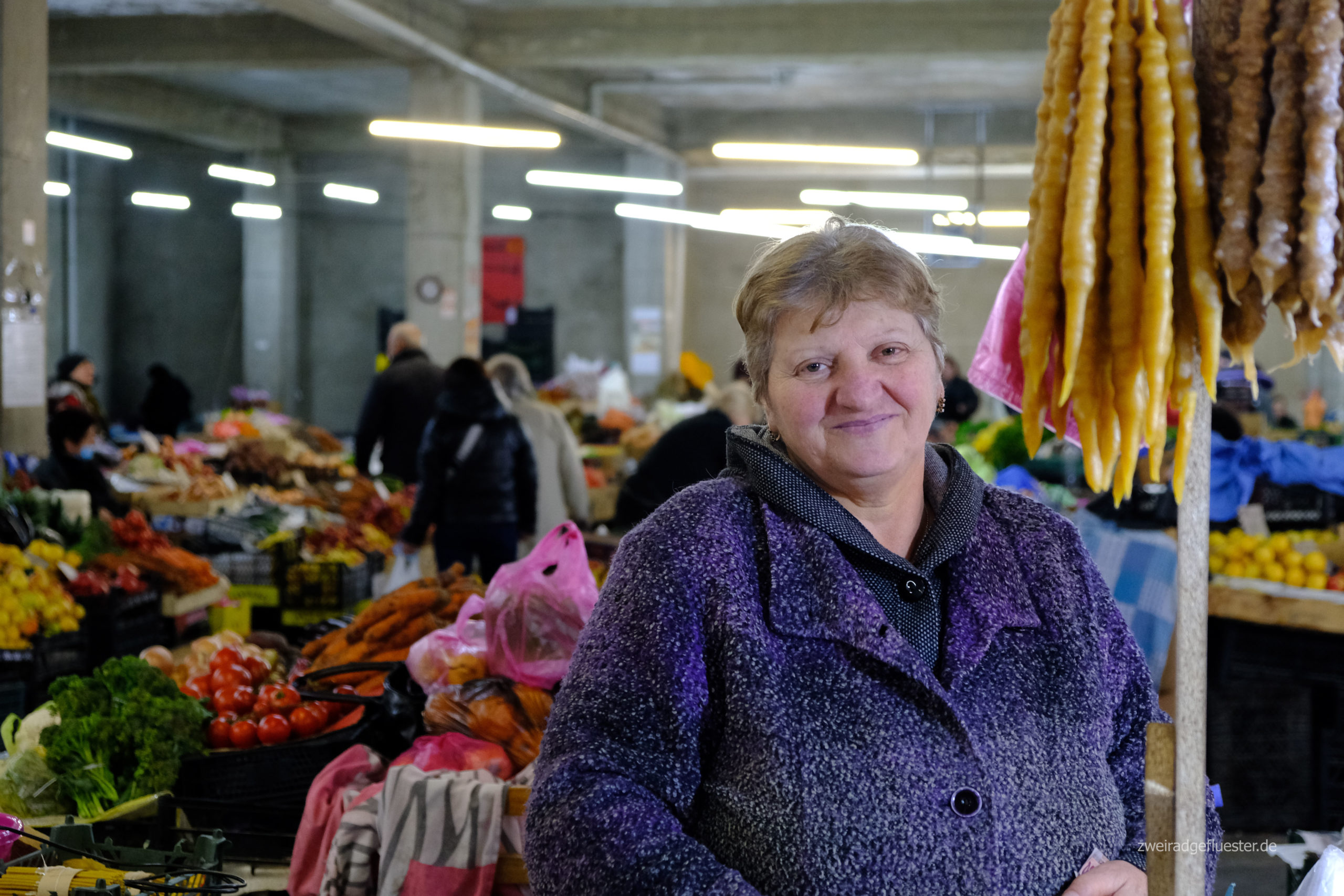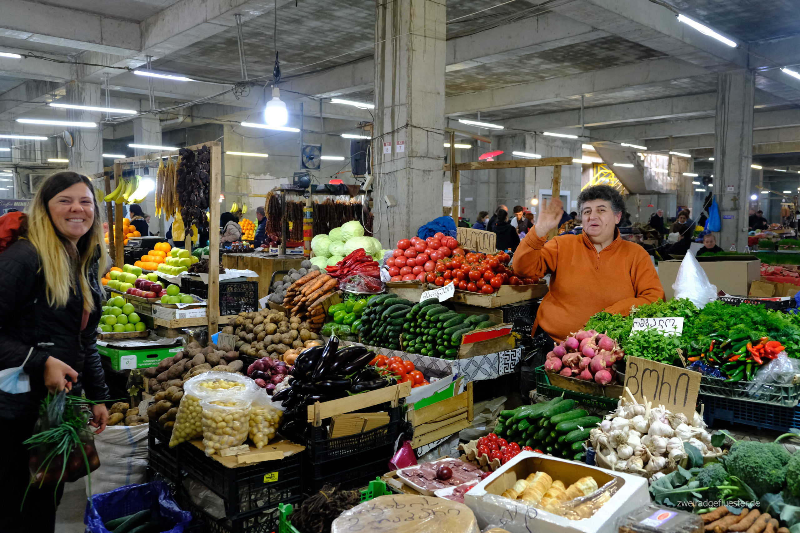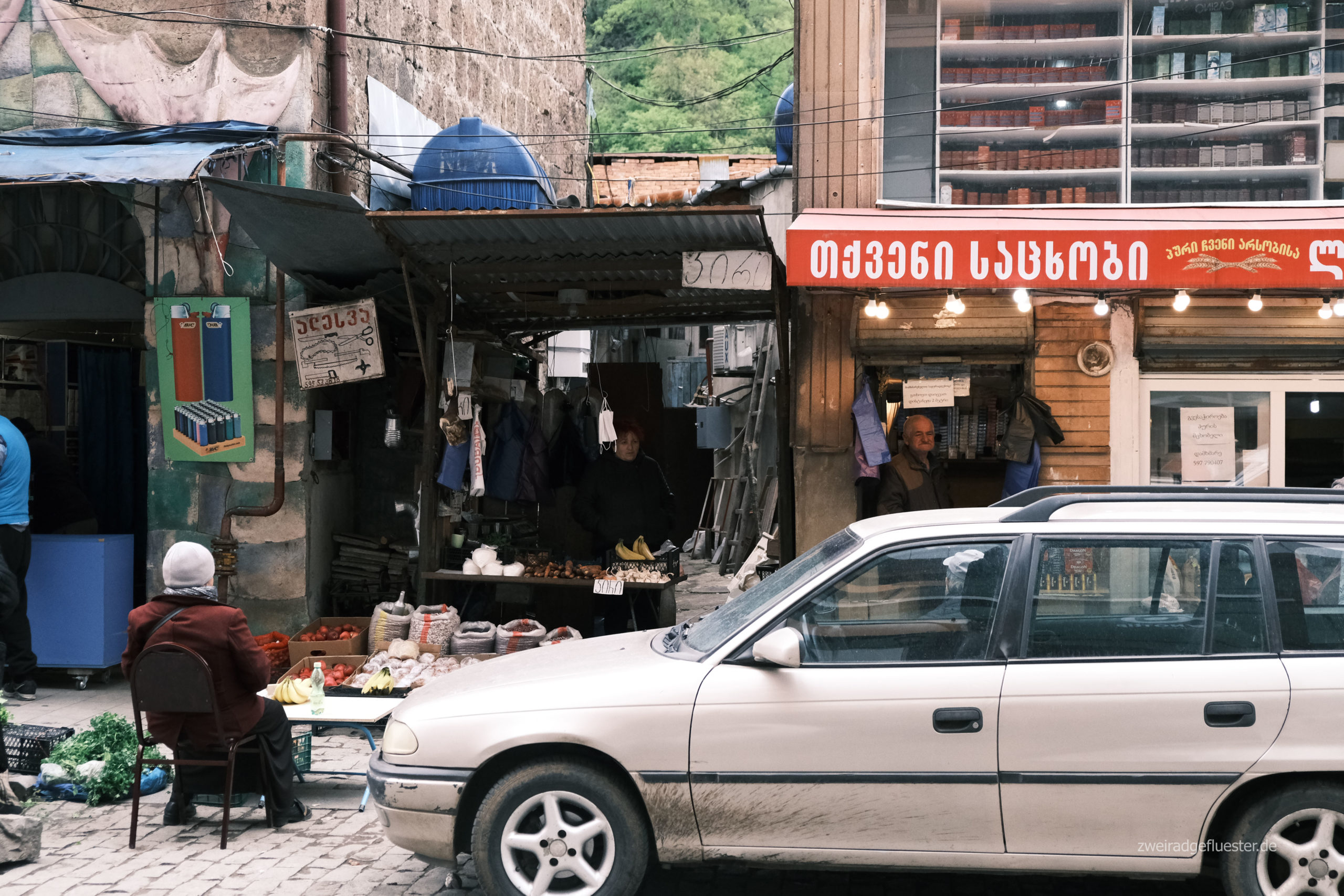 Wieder in Kutaisi angekommen schlendern wir durch die Straßen. Es ist ein einziges Gewimmel. Überall werden Sachen am Straßenrand verkauft. Auf dem Green Bazaar decken wir uns für die nächsten Tage ein und genießen den Markttrubel in vollen Zügen.