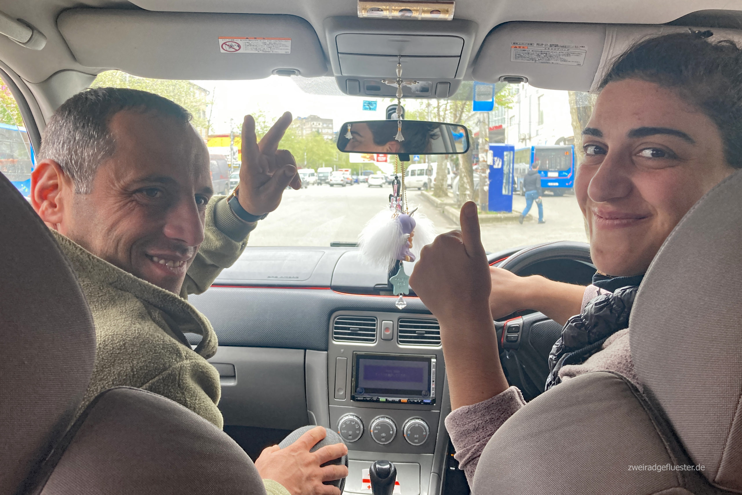 Als wir die Höhle verlassen und unsere Augen sich nach einer Stunde untertage wieder an die Helligkeit gewöhnt haben, müssen wir leider feststellen, dass der Taxifahrer recht hatte mit seiner Aussage, dass von hier aus keine marshrutka zurück nach Kutaisi fährt. Nachdem uns ein Taxifahrer vor Ort einen völlig utopischen Preis nennt, beschließen wir lieber erstmal los zu stiefeln. Nach einer Viertelstunde stoppt das erste, vorbeifahrende Auto sofort und schon sitzen wir auf der Rückbank einer netten Familie, die uns anstrahlt und netterweise mit nach Kutaisi nimmt. Die Verständigung klappt irgendwie mit Händen, unserem rudimentären Georgisch, den Englischkenntnissen der achtjährigen Tochter und dem hier liebevoll als googli bezeichneten Übersetzer. Es wird eine sehr lustige Fahrt.