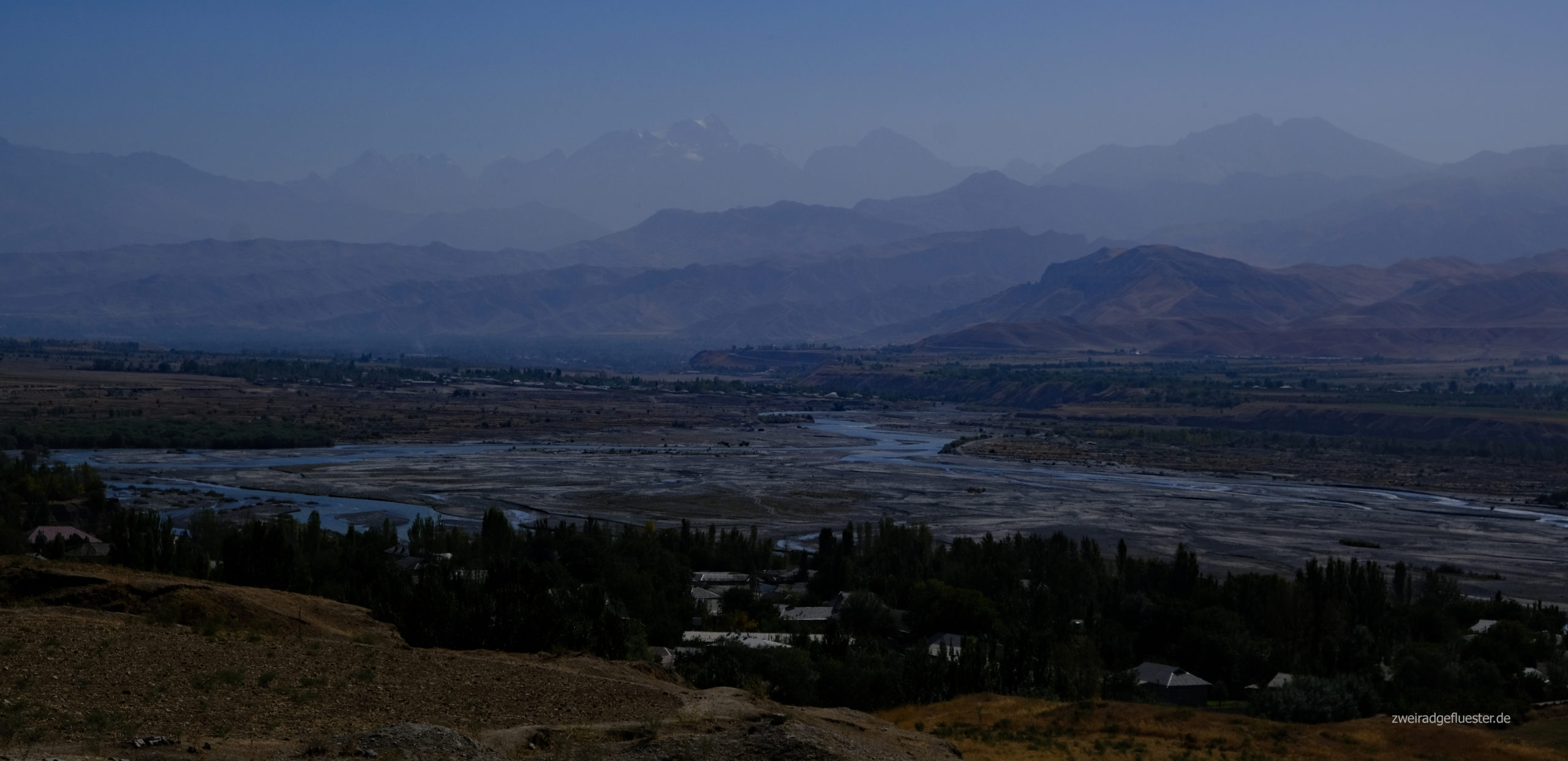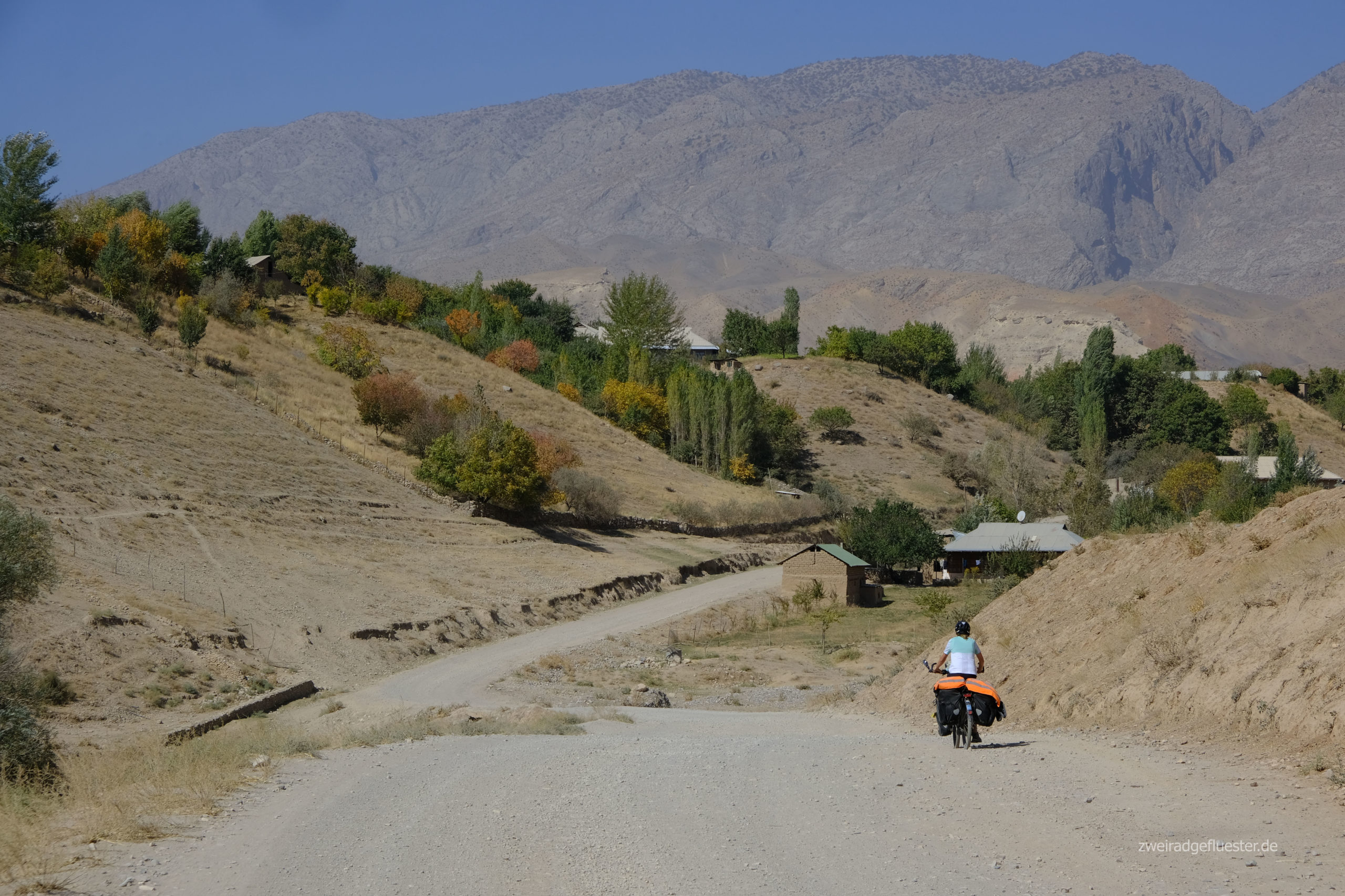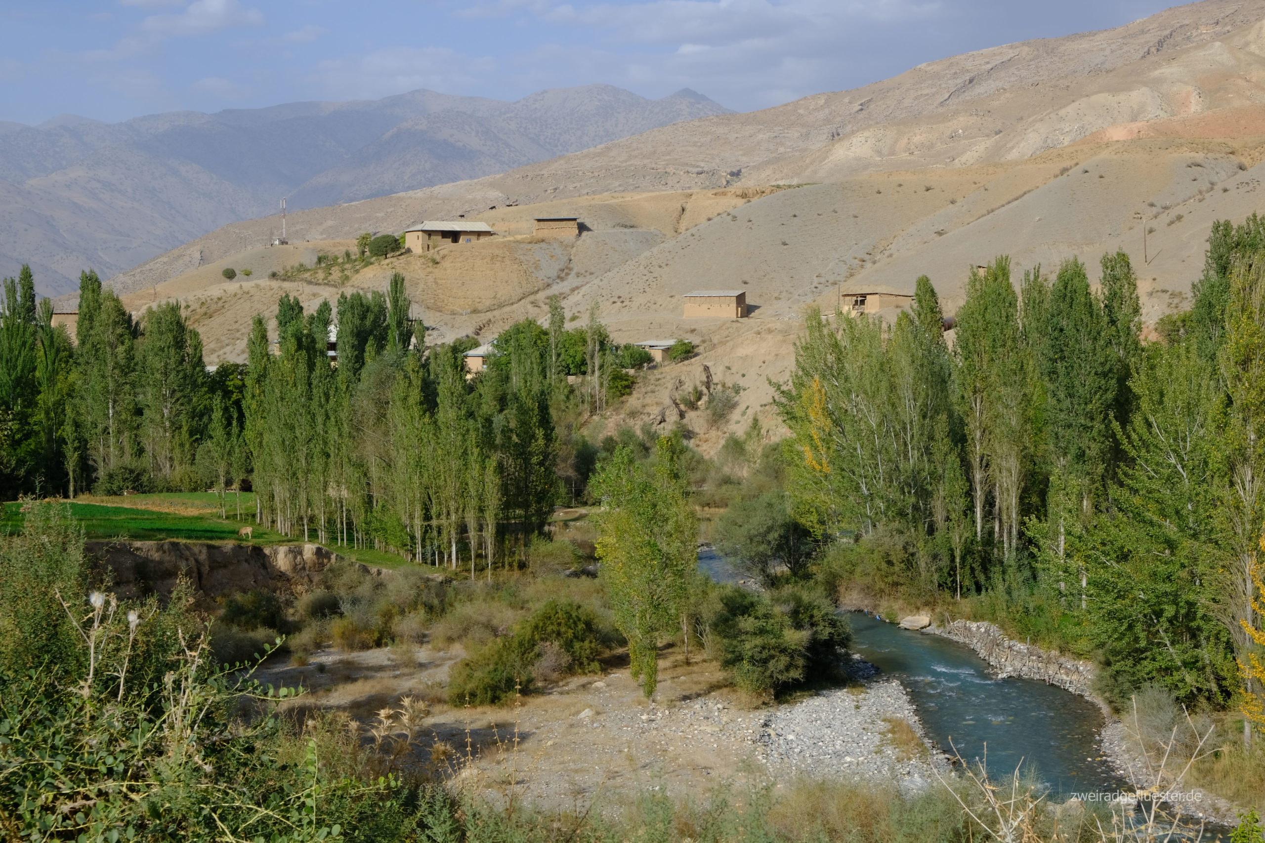 Nun machen wir etwas zum ersten Mal auf unserer Reise, wir radeln mehrere Tage denselben Weg zurück, den wir auch schon gekommen sind. Wir campen sogar ein zweites Mal an einem Platz und wir schlafen wieder im Gästehaus in Panjakent. Nur auf dem Weg dahin fahren wir auf der anderen Flussseite entlang und es wird sehr schnell ersichtlich, dass die fruchtbare Gegend dem Zarafhon entspringt und sich sehr schnell in Luft auflöst, wenn man Richtung Berge blickt.
