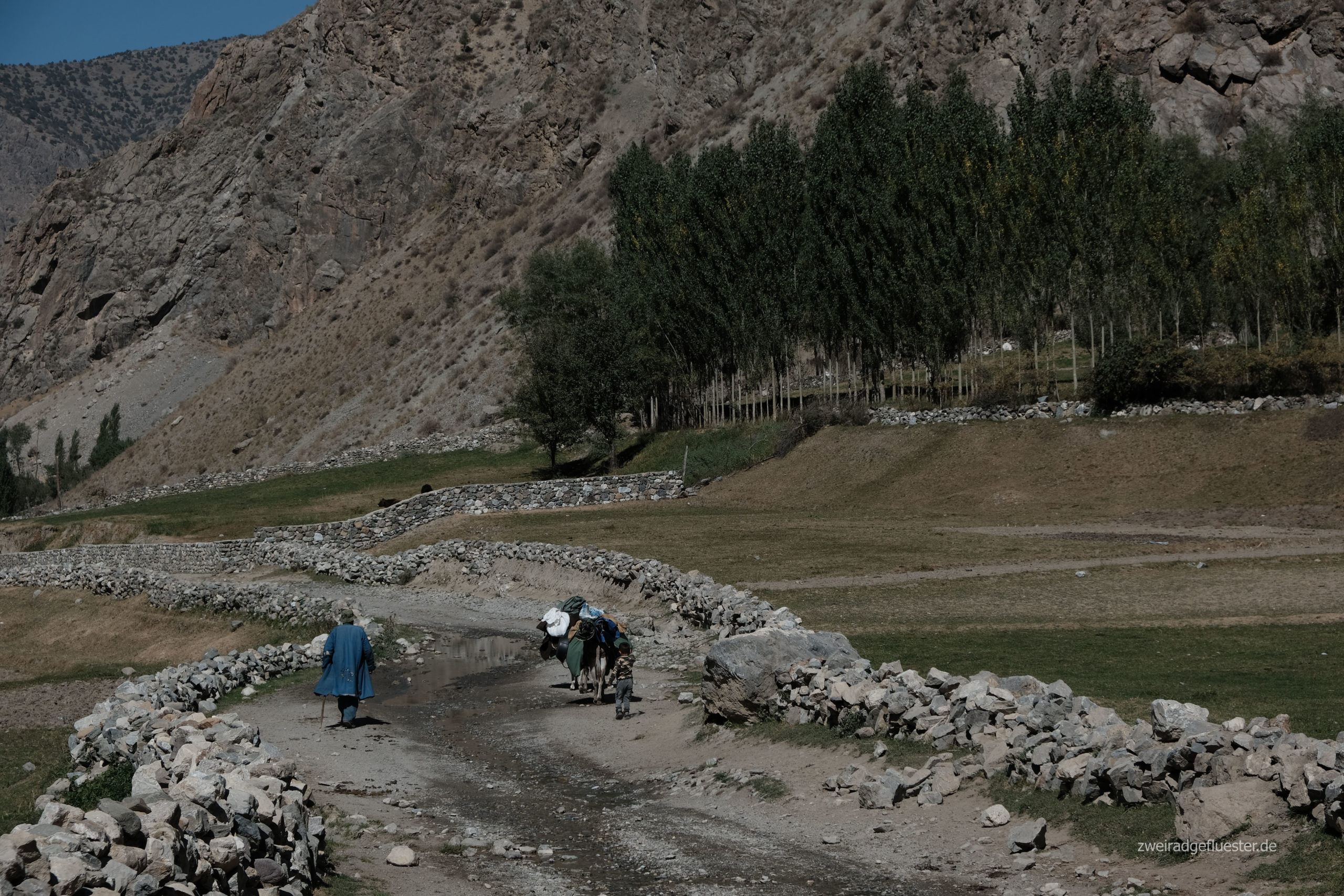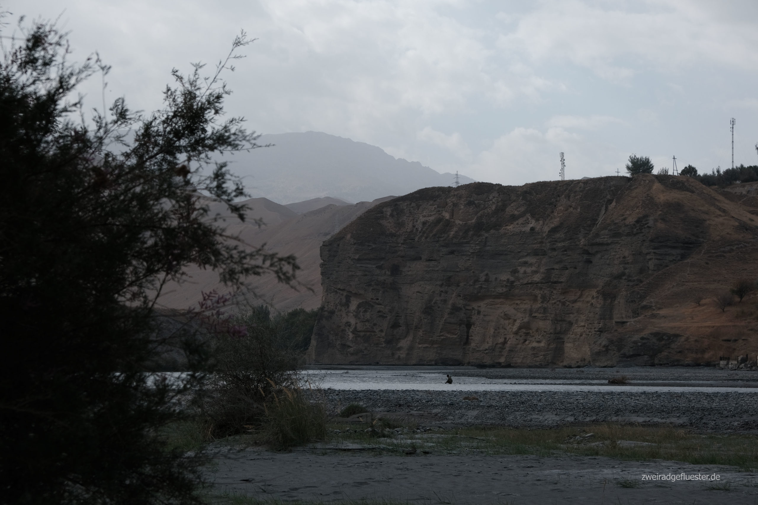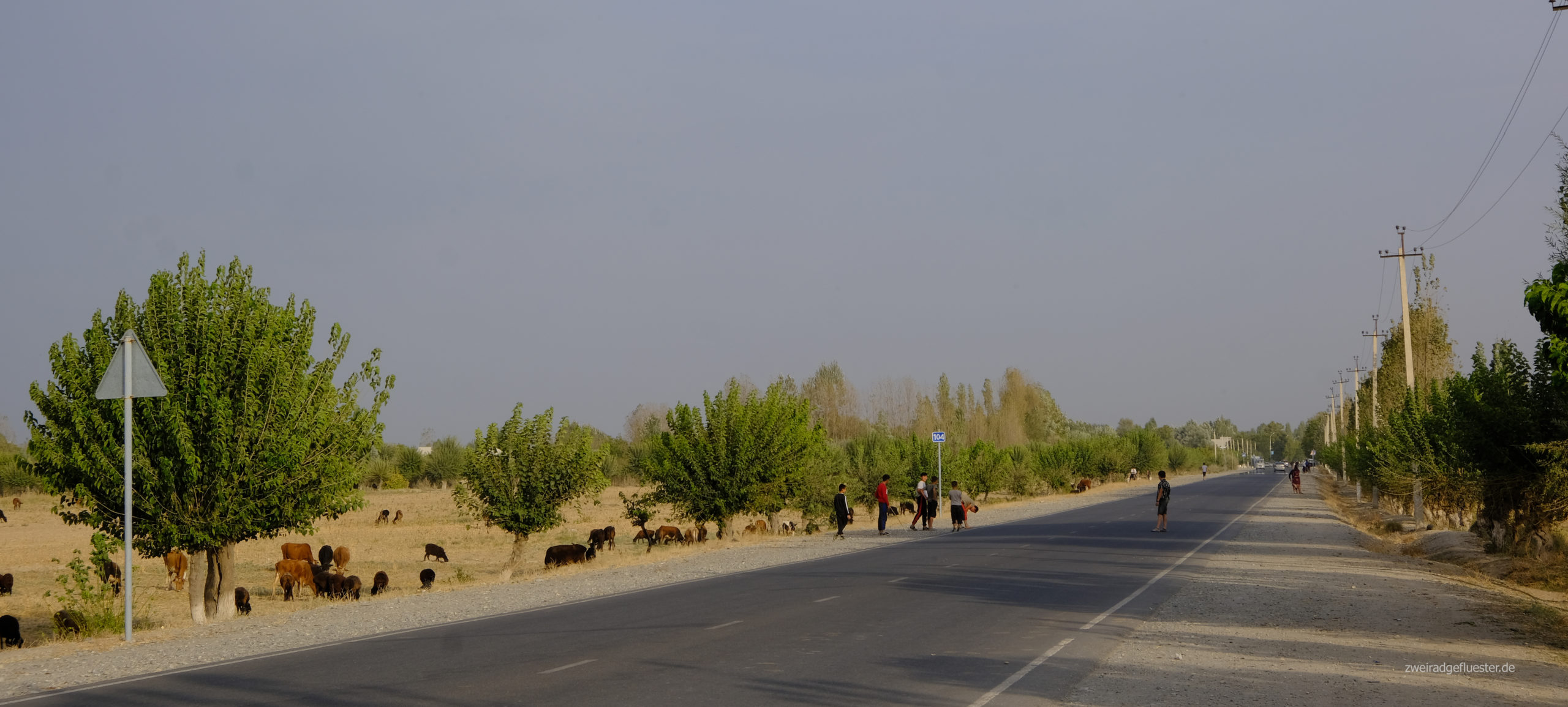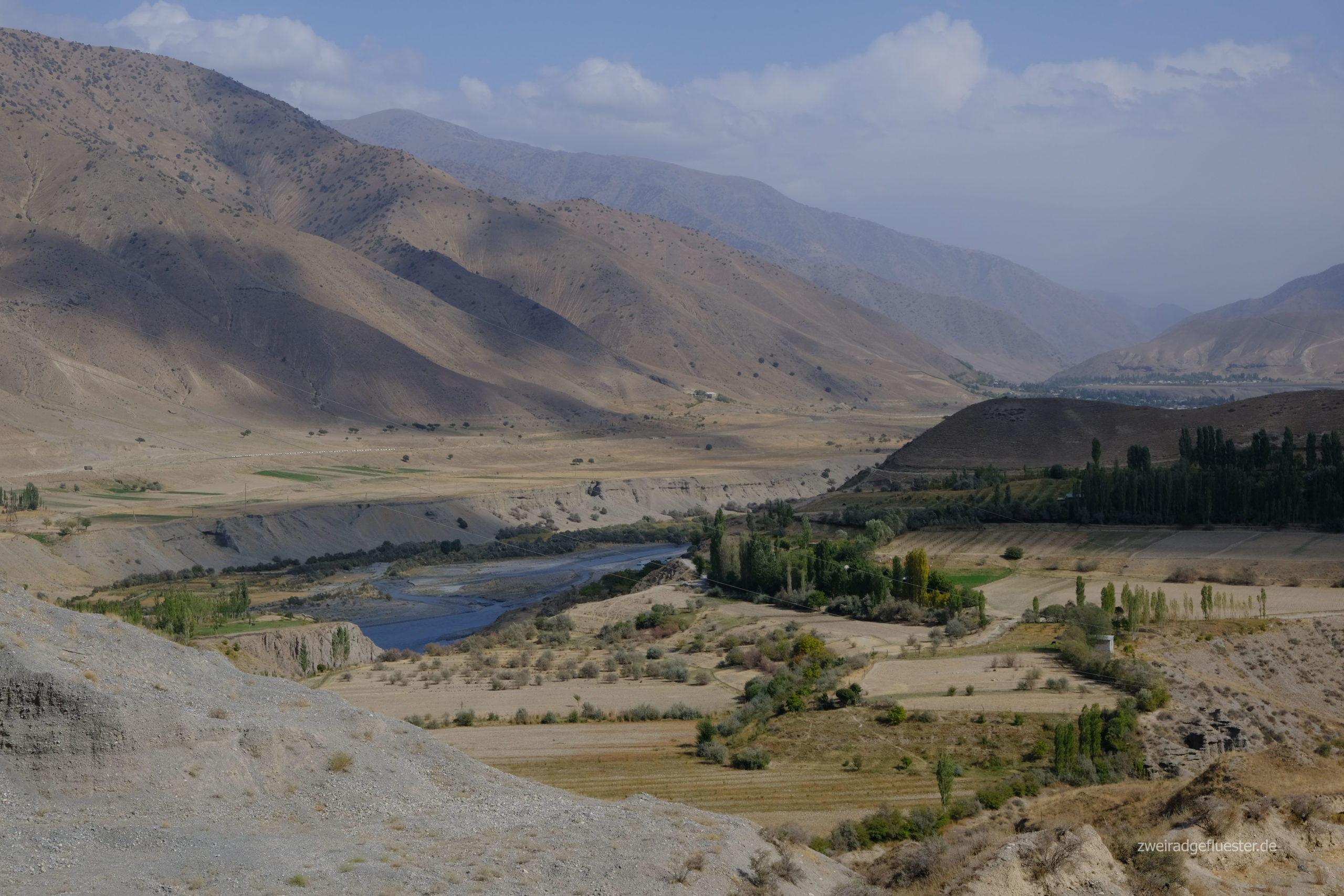 Nun machen wir etwas zum ersten Mal auf unserer Reise, wir radeln mehrere Tage denselben Weg zurück, den wir auch schon gekommen sind. Wir campen sogar ein zweites Mal an einem Platz und wir schlafen wieder im Gästehaus in Panjakent. Nur auf dem Weg dahin fahren wir auf der anderen Flussseite entlang und es wird sehr schnell ersichtlich, dass die fruchtbare Gegend dem Zarafhon entspringt und sich sehr schnell in Luft auflöst, wenn man Richtung Berge blickt.