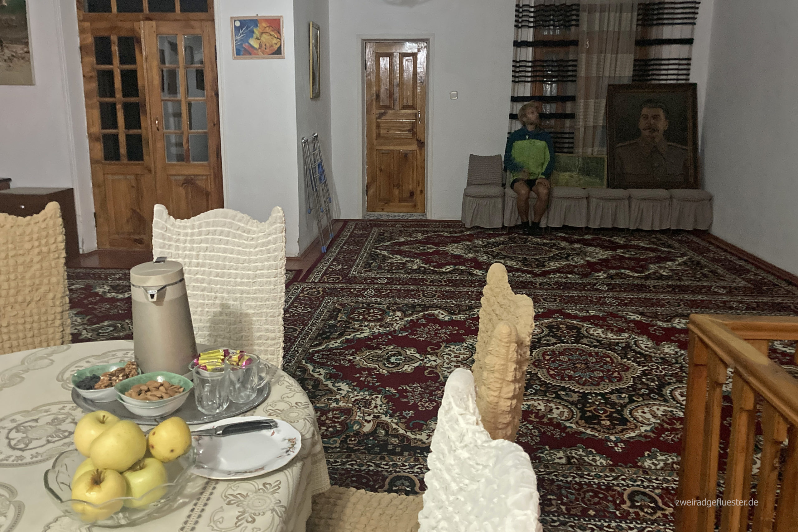 Auch am nächsten Tag gehts uns noch nicht wirklich besser und so legen wir noch einen Tag Zwangspause im ominösen Gästehaus mit Hang zur Sowjetunion ein. Am Abend soll es dann eine magenschonende Gemüsebrühe geben, doch auch hier ist es schier eine unglaubliche Attraktion, dass diese von einem Mann zubereitet wird. So richtig glaubt die Mutter der Familie nicht daran, dass es funktioniert, und so wird jeder Schritt von ihr begleitet. Später, als sie einsieht, dass das Wasser auch ohne ihre direkte Aufsicht hochkochen kann, lehnt sie sich zurück. Allerding ist sie jetzt nicht mehr allein, sondern die ganze Familie ist in der winzigen, nach Milchsäure riechenden Küche, versammelt. Staunend und lächelnd schauen nun als noch der Vater und die drei Jungs zu, wie man(n) eine Gemüsebrühe zubereitet.