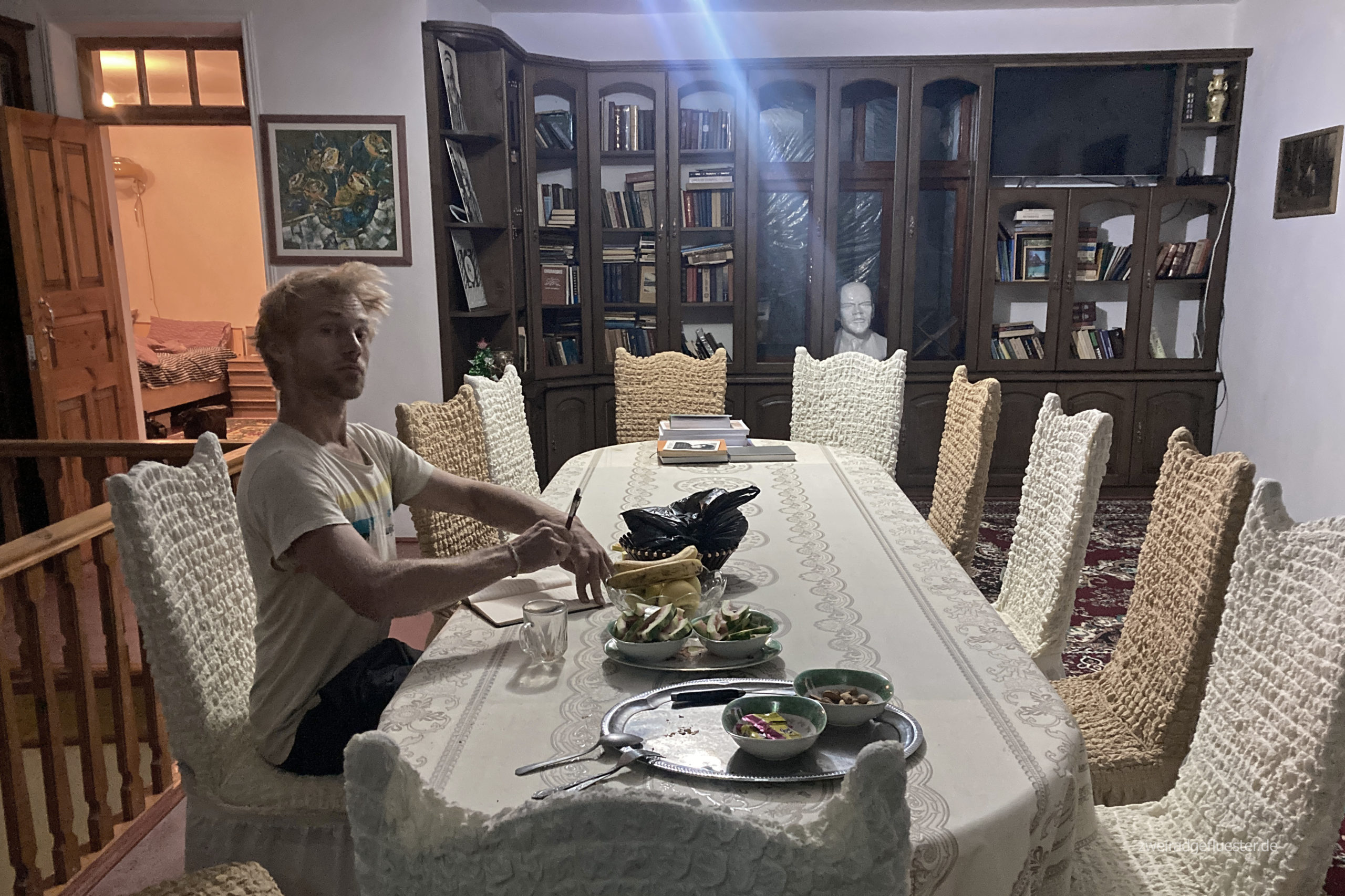Wir kommen nach dem kräftezehrenden Tag dennoch ziemlich müde und kaputt in der Stadt Panjakent an. Das Gästehaus haben wir aufgrund der ansteigenden Preise schon im Voraus gebucht, aber die Leute hier sehen nicht so aus, als hätten sie mit uns gerechnet. Viel eher wirkt es so, als ist hier gerade schon Winterpause. Das Haus ist schon zur Renovierung einfoliert. Wir sind genervt und wollen eigentlich nur noch ins Bett. Unsere Farsikenntnisse sind dann doch nicht so üppig, dass wir uns mit der Familie, die – wie sich später herausstellt – hier nur arbeitet und auf das Haus aufpasst, verständigen können. Ein paar Telefonate später, kommt dann eine Frau angefahren, die Englisch spricht, den Schlüssel dabeihat und öffnet uns die Tür zu unserer wohlverdienten Waagerechten.