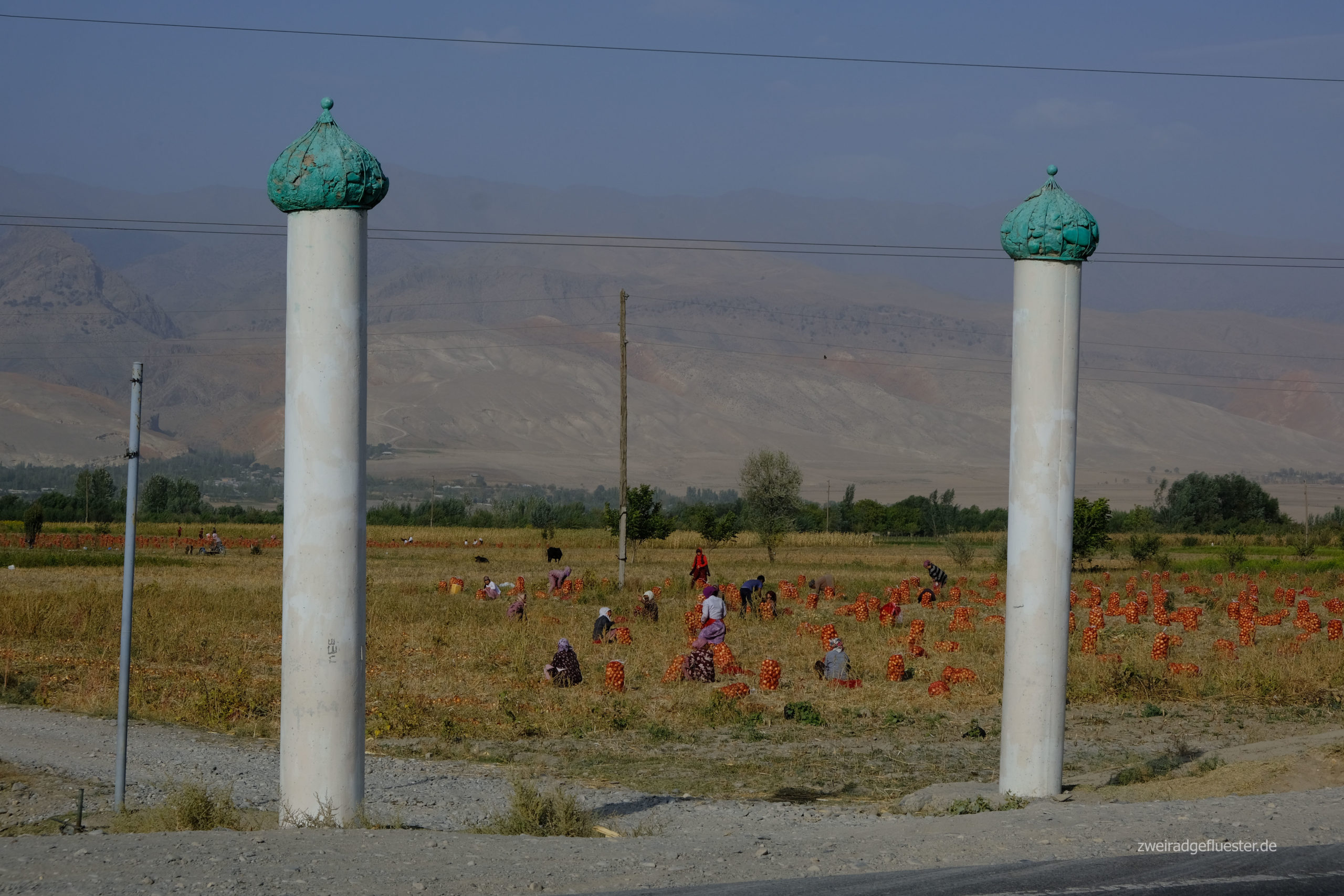 Nun können wir uns endlich voll und ganz Tajikistan widmen. Wir radeln am Zarafshon entlang durch das sehr fruchtbare Tal des breiten Flusses. Überall ist die Ernte in vollem Gange und es werden Trauben sowie andere Leckereien direkt von den Feldern verkauft. Blöd nur, dass wir unsere Mägen lieber noch schonen sollten.