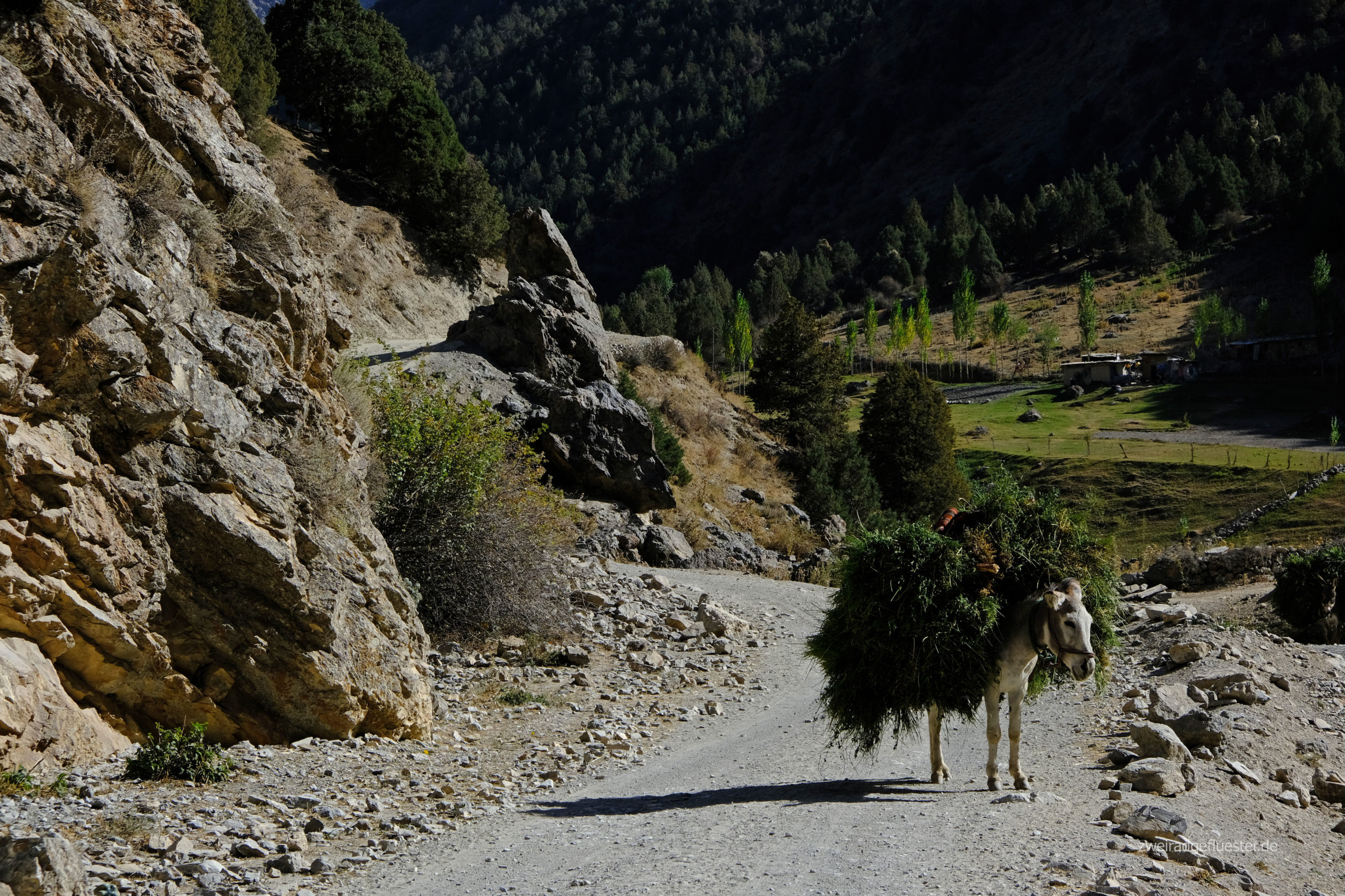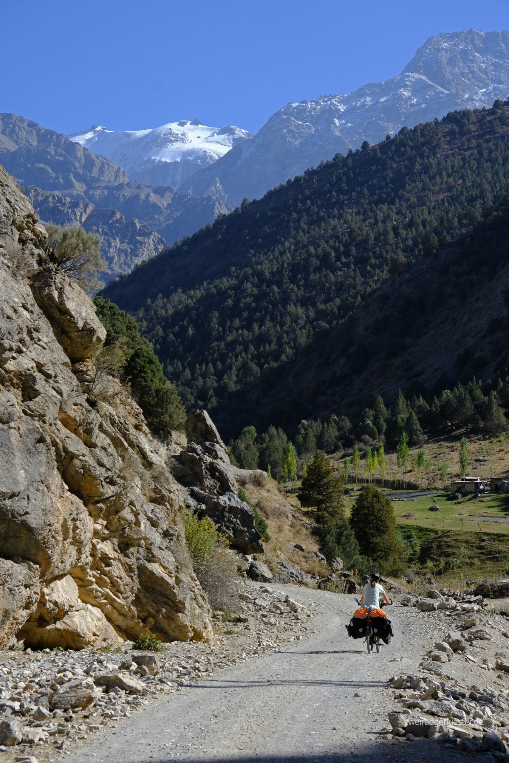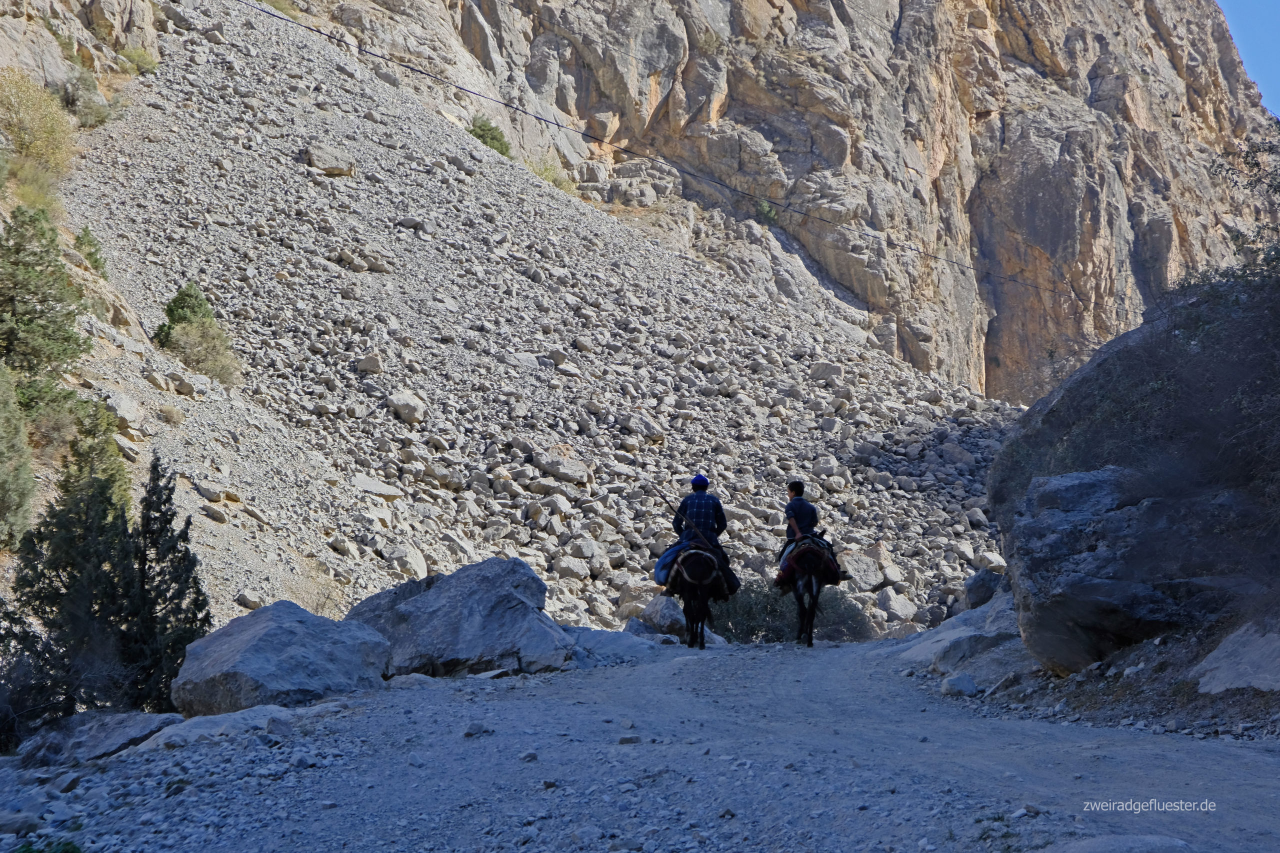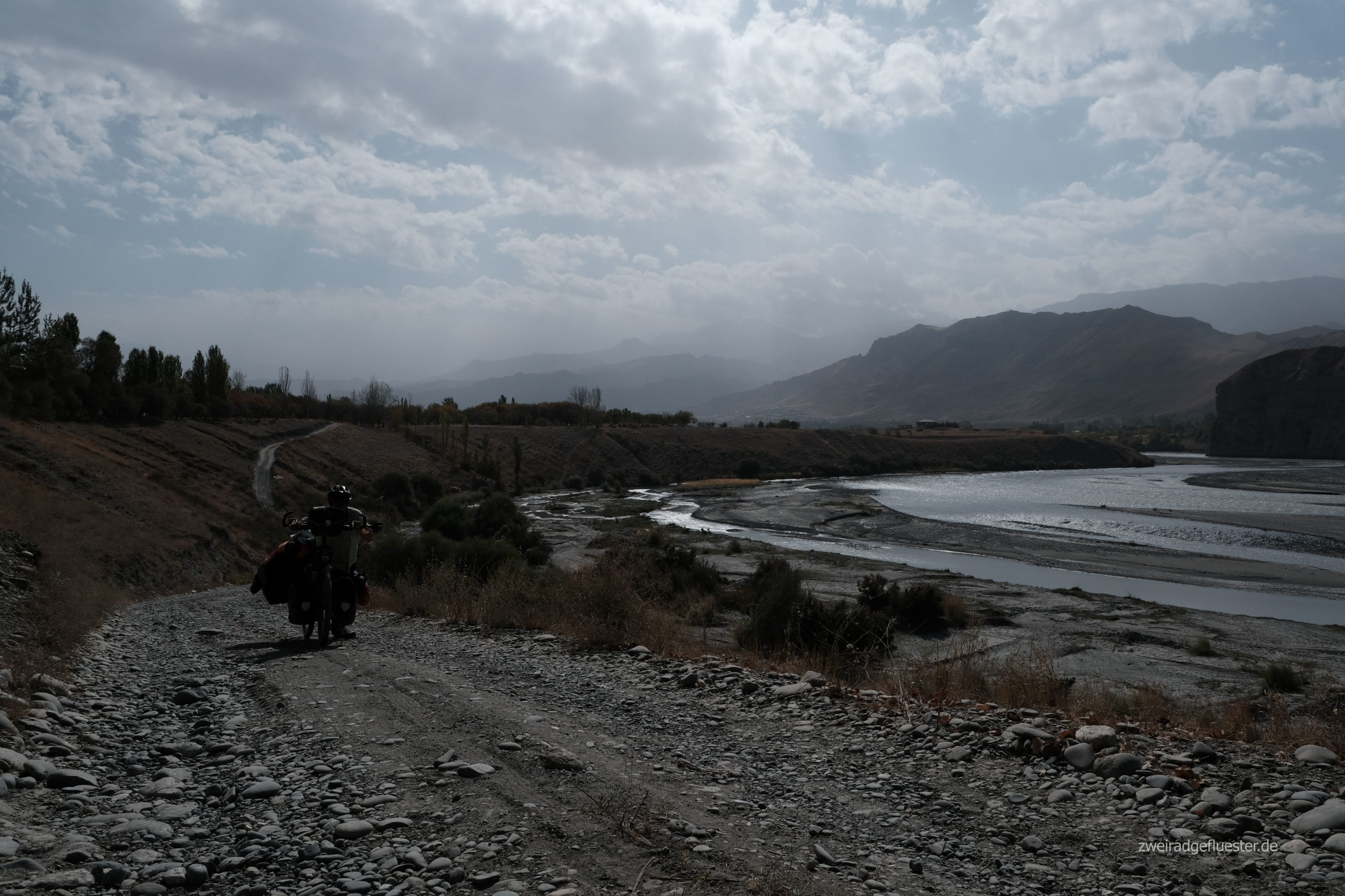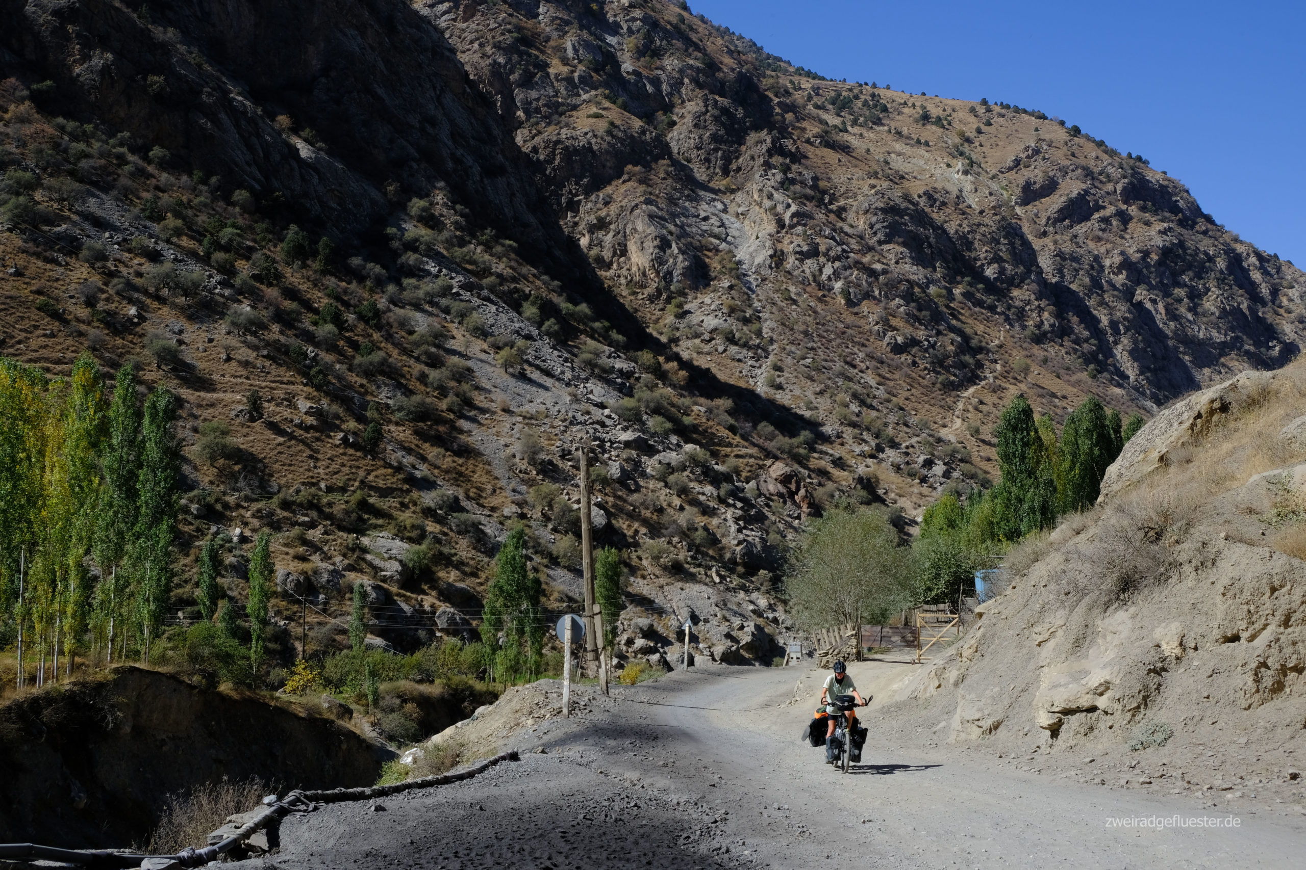 Gestärkt kurbeln wir immer weiter nach oben, wobei auch die Piste immer schlechter wird. Loser Flusskies, Sand sowie Schotter und eine Piste, die dazu auch noch immer steiler wird. Ein richtiger Esel ist hier wohl die bessere Wahl. Wieder müssen wir gemeinsam ein Rad schieben, vielleicht auch weil uns im Moment einfach die Kräfte fehlen. Das Panorama wird dafür aber immer atemberaubender. Die markanten, recht spitzen Gipfel der Fann-Berge begrüßen uns bei bestem Sonnenschein. Dazu sprudelt uns ein kleiner, aber kräftiger Gebirgsfluss entgegen. Etwas weiter oben erhaschen wir dann auch die ersten Blicke auf die imposanten Gletscher, die gute 5.000 m in die Höhe sprießen.