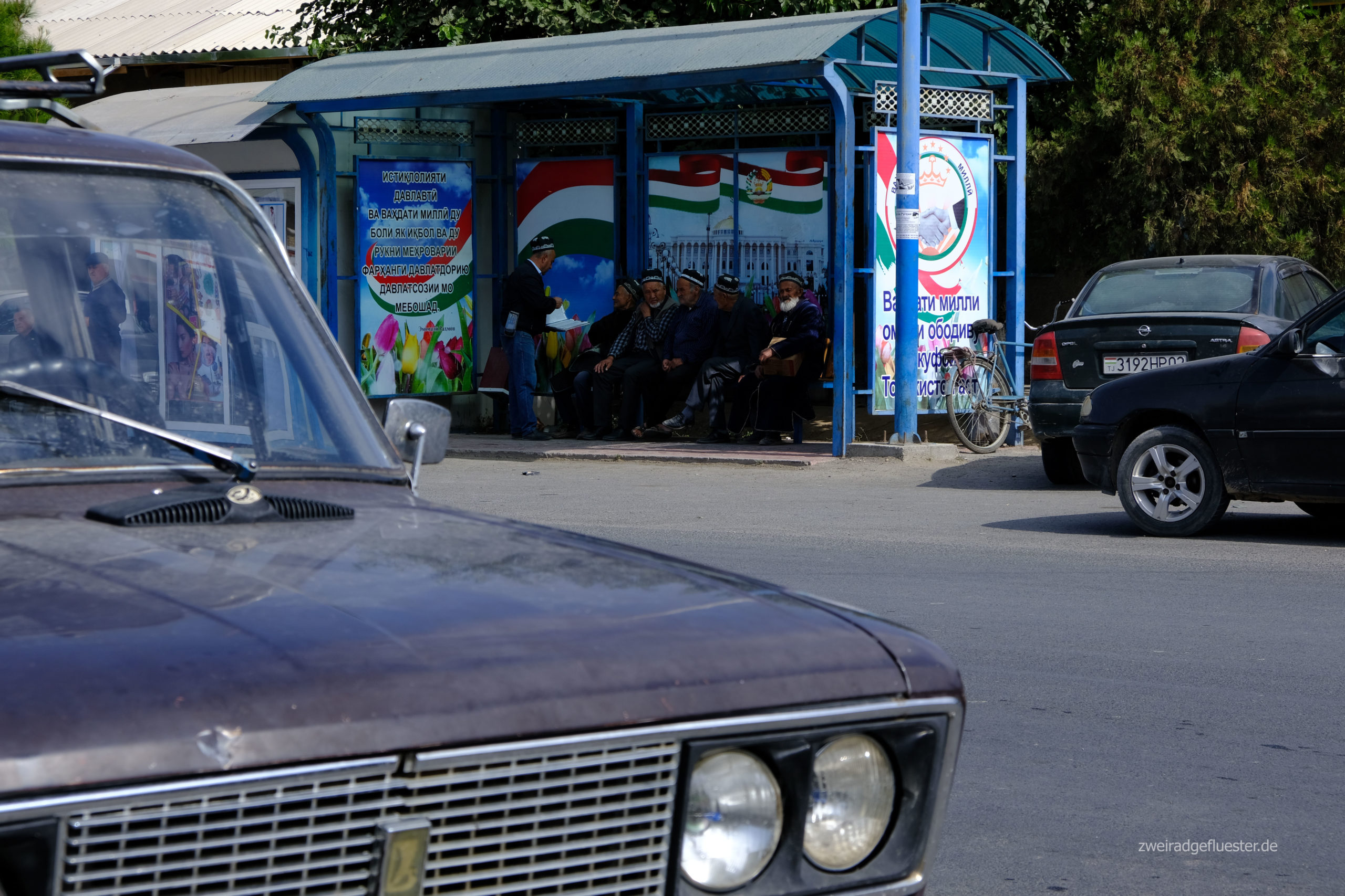 Der Start nach Tajikistan verläuft zunächst etwas holprig, was nicht nur an den vielen Löchern in der Straße liegt, sondern vor allem daran, dass unsere Mägen mal wieder ordentlich rumpeln. So ganz zur Ruhe kommen sie in Zentralasien irgendwie nicht. Mit Magenkrämpfen und ziemlich erschöpft quälen wir uns durch den chaotischen und stark frequentierten Verkehr die ca. 60 km bis zur Grenze. Der Grenzübergang ist glücklicherweise das ganze Gegenteil zu diesem Fiasko. Wir werden auf beiden Seiten nett empfangen und sind nach 20 min und einem ersten gratis Tajikischsprachkurs direkt vom lächelnden Grenzbeamten während der Passkontrolle in unserem 14. Reiseland angekommen. Die Wörter kommen uns bekannt vor, denn die tajikische Sprache ist eine Varietät des Persischen und so können wir nach unserer Zeit in Iran einiges verstehen und unser Farsi wieder rauskramen.