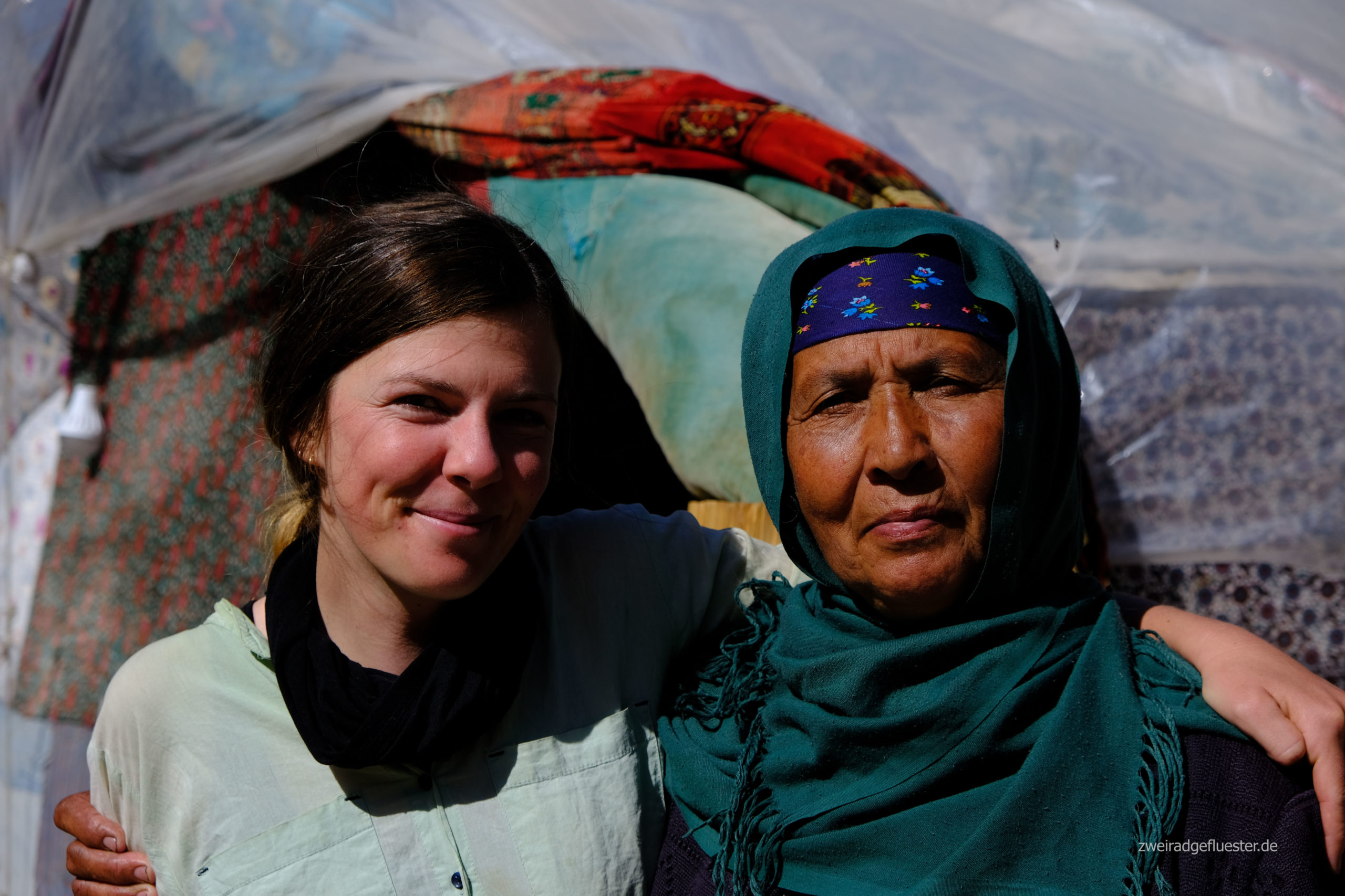 Zwischen den Weiden, die hier häufig mit Steinzäunen umgeben sind, werden wir von einem Kuhhirten in sein Zelt zum Teetrinken eingeladen. Nachdem wir die Schuhe ausgezogen haben, sollen wir auf dem Teppich im Zelt Platz nehmen. Draußen wird derweil noch der staubtrockene Acker mit dem störrischen Esel gepflügt. Neben uns liegt ein uns neugierig anstarrendes, warm eingepacktes Baby und wir können dem kleinen Ismael, der uns immer wieder ganz euphorisch begrüßt, mit unseren Schokokeksen eine riesige Freude machen.