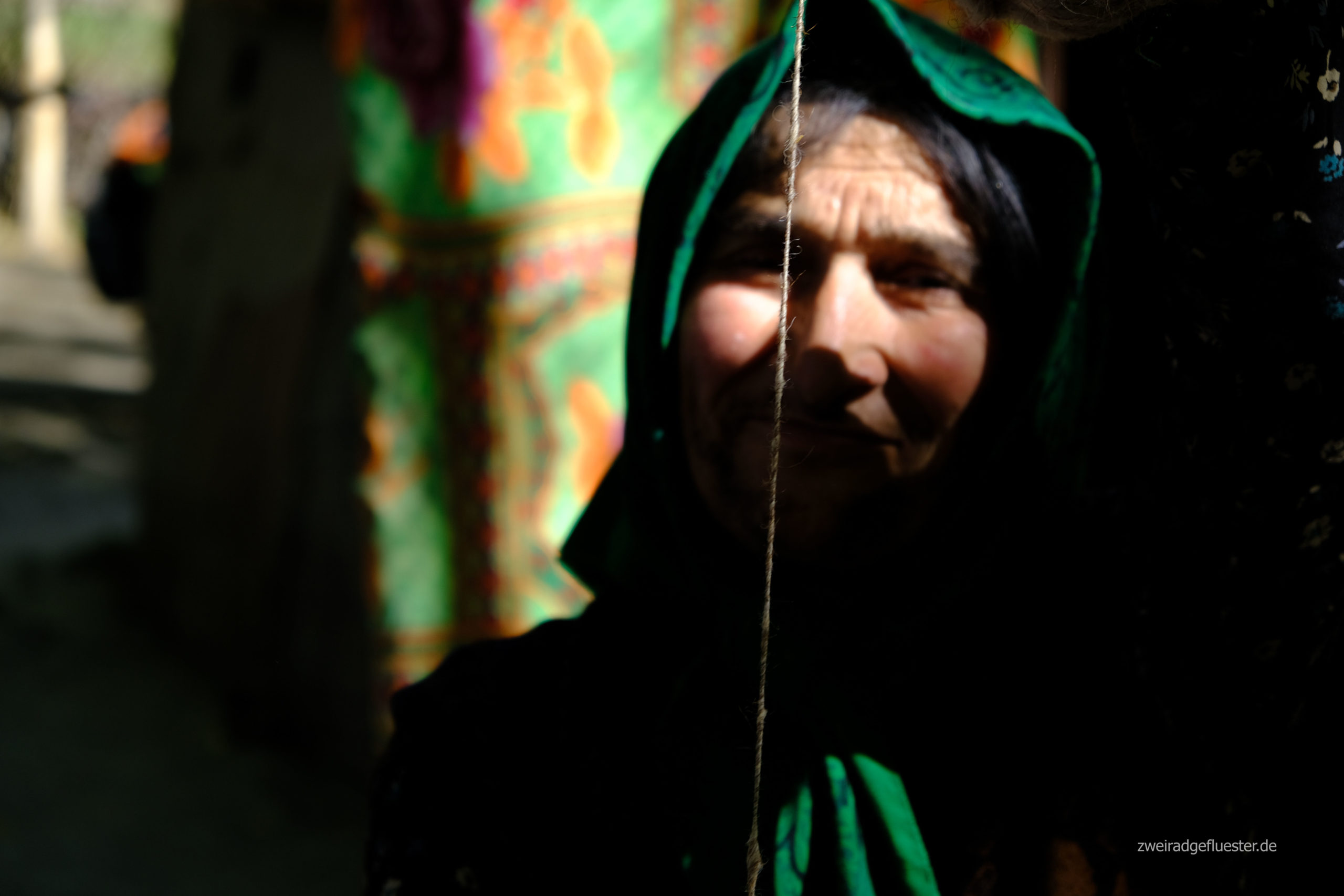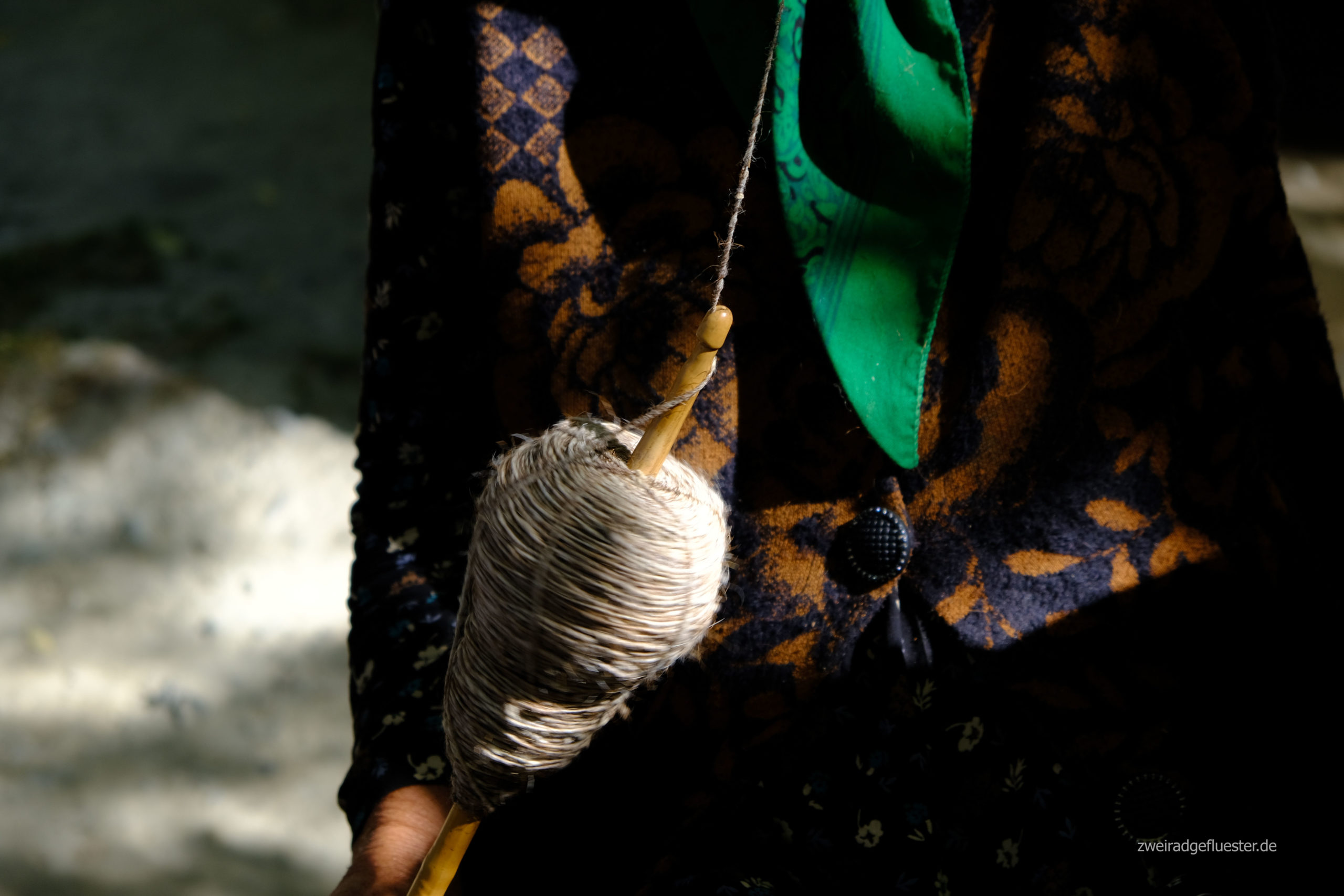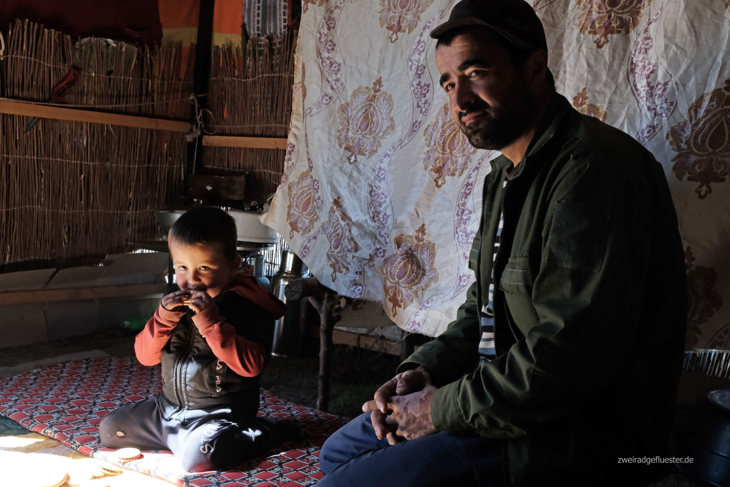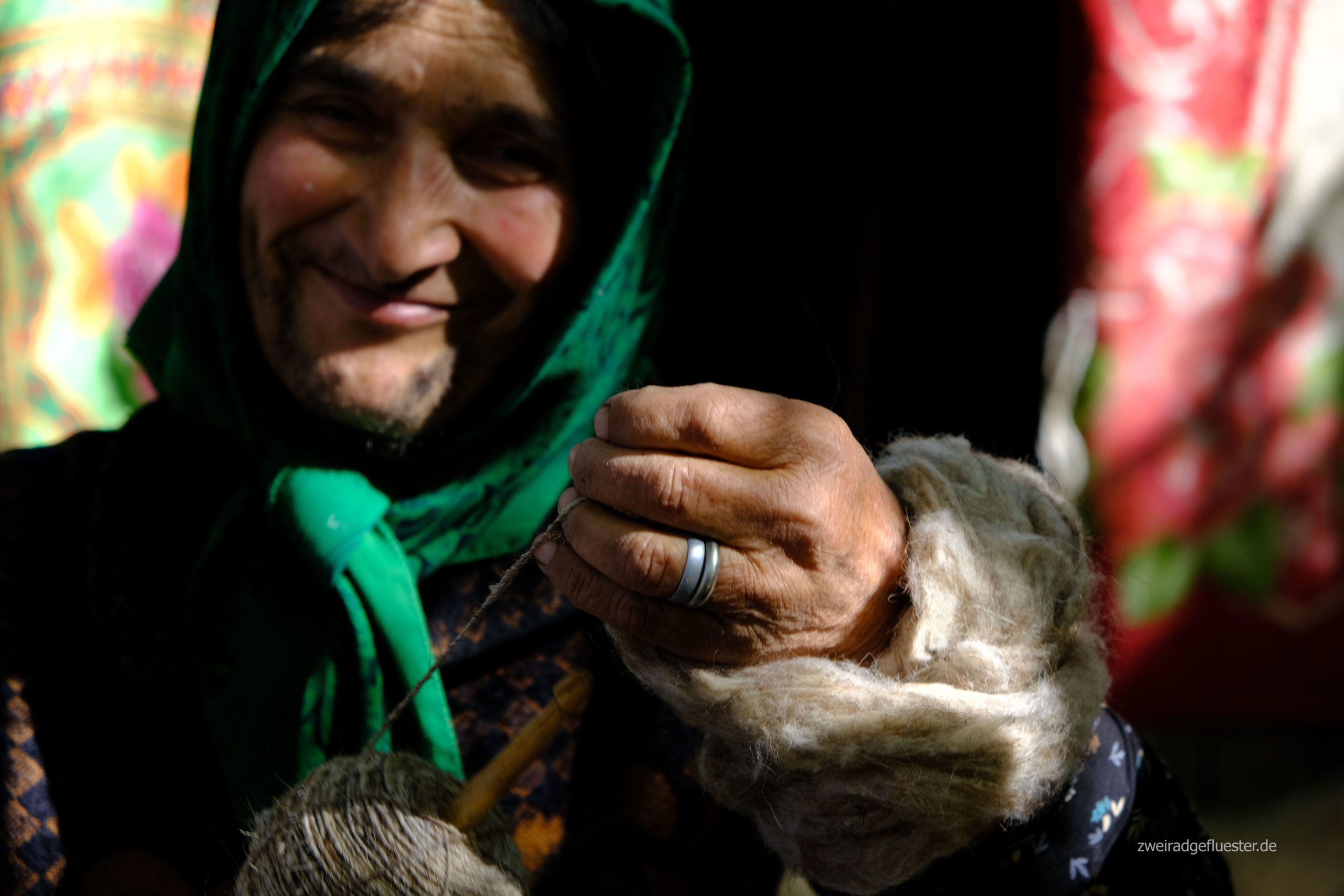 Schon bald serviert uns die liebe Ruznora Cay und die obligatorischen Ergänzungsleckerein, bevor sie sich später zum Mittagsgebet ins Zelt begibt. Munera kann man ansehen, dass sie ein riesiges Herz hat. Sie freut sich sehr über unseren Besuch und wir unterhalten uns, soweit es geht. So richtig schlau werden wir aber nicht aus der Zusammensetzung hier und wir vermuten, dass es sich um eine Art Fraueninitiative handelt. Der kleine, sportbegeisterte Bachtior freut sich jedenfalls sein Englisch zu präsentieren und wir sind begeistert Edigul beim Spinnen der Fäden für die Decken und Teppiche, auf denen wir sitzen, zuzusehen. Nach der entspannten Teezeit heißt es dann auch schon wieder Abschied nehmen von sehr herzlichen Menschen.