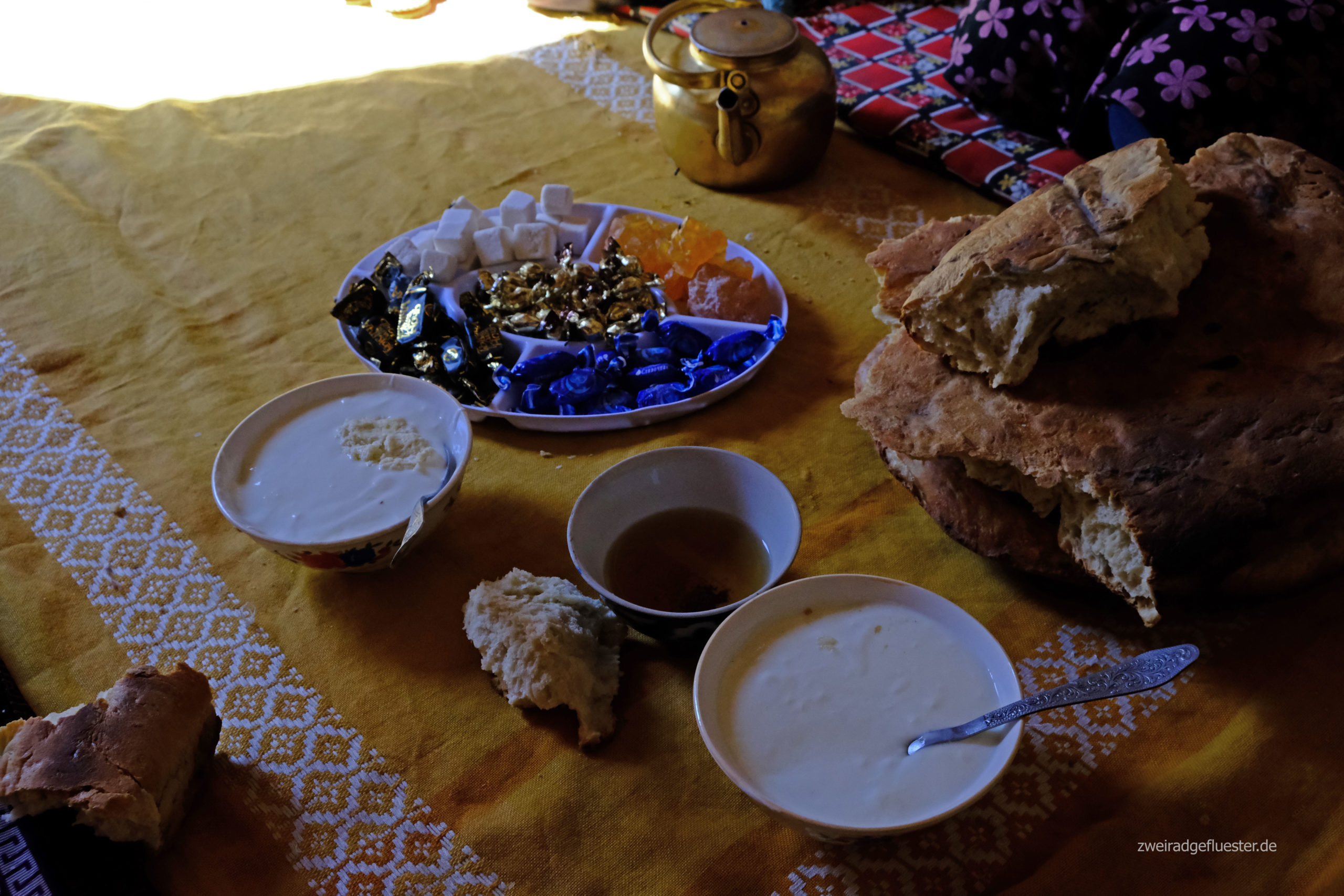 Eine junge Frau holt selbstgemachten Kefir und Naschereien für uns aus der provisorischen Zeltküche, die durch ein Tuch vom restlichen Zeltraum abgetrennt ist und schenkt uns wenige Zeit später den warmen Cay in die Teeschüsseln. Nun setzt sich auch Tochan mit zu uns, aber erst nachdem er das Brot für uns geteilt und uns gereicht hat. Eine Teezeremonie besteht in Zentralasien nie nur aus Tee, sondern es werden meistens noch selbstgemachter Joghurt, Brot, Marmeladen, Obst oder Nüsse dazu serviert.