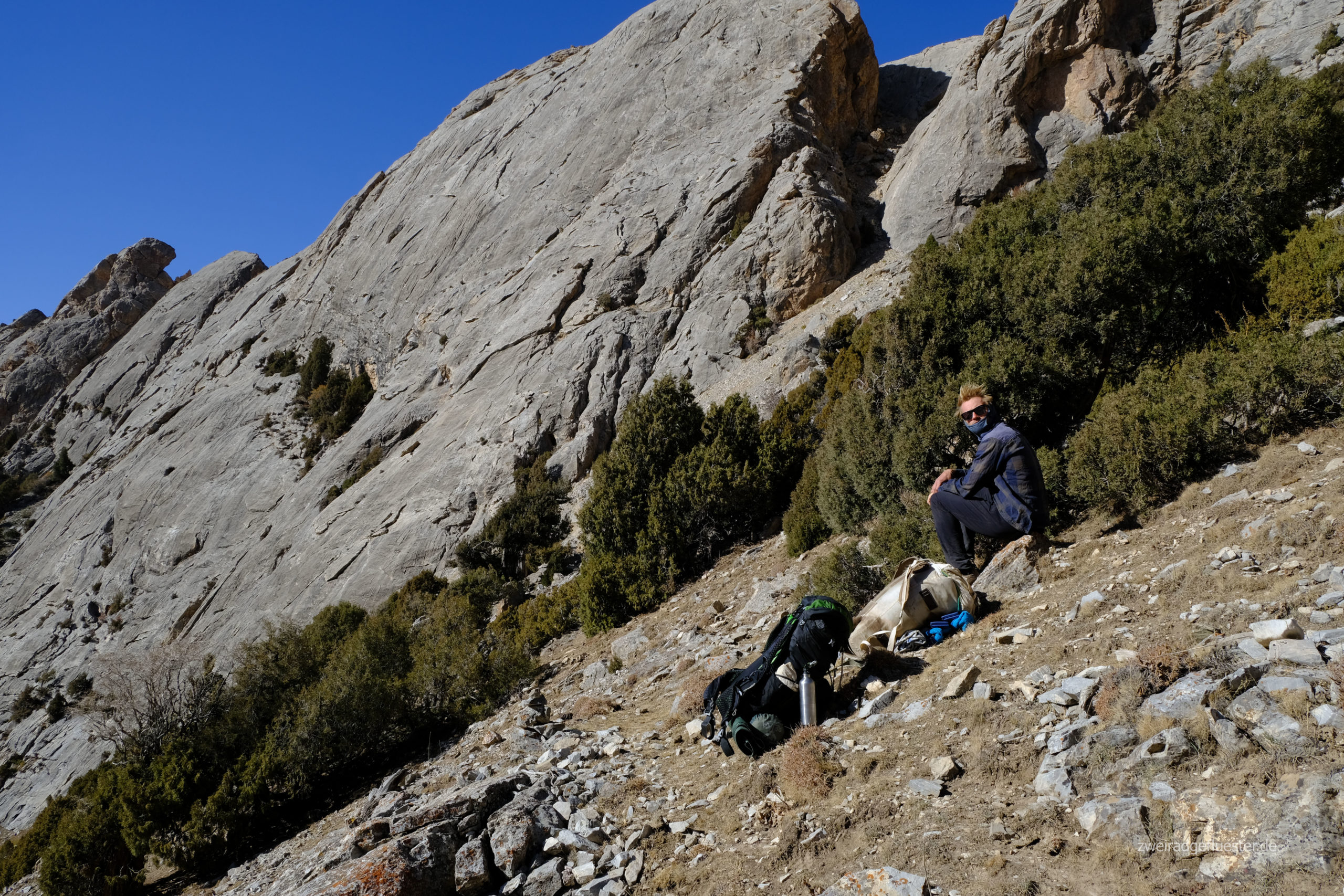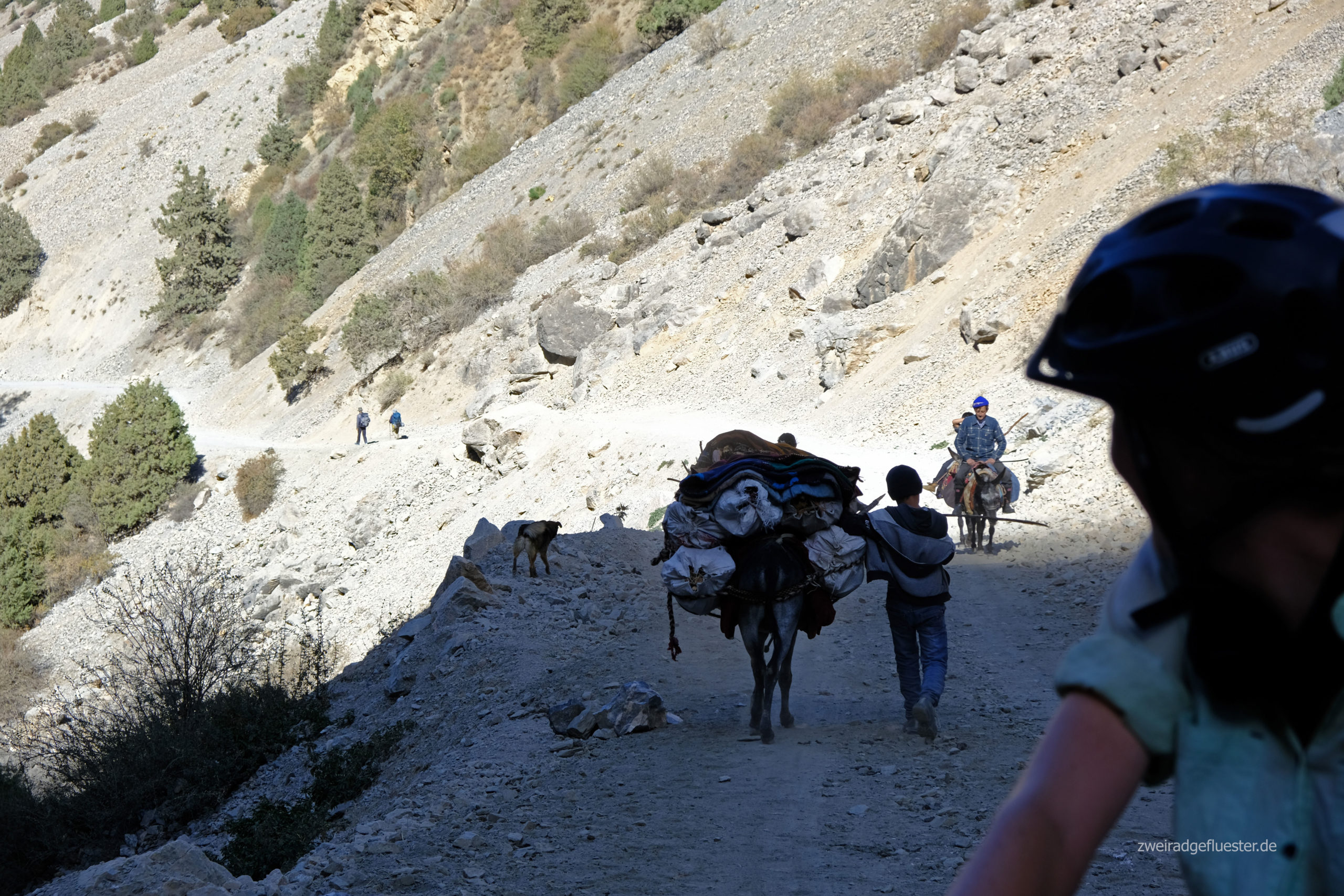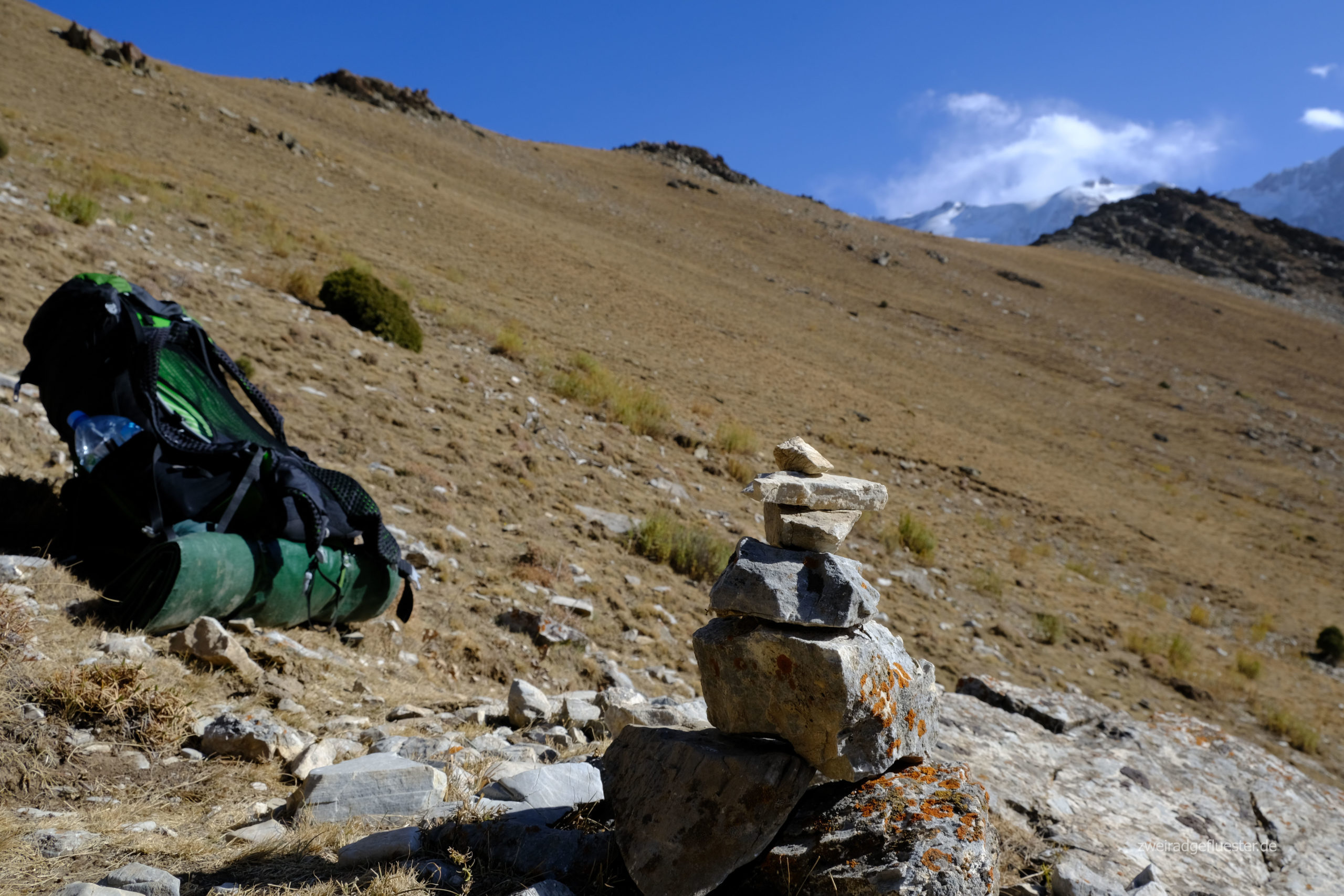Wir lassen unsere Räder im Basecamp stehen, leihen uns einen Rucksack im Retrostyle aus und begeben uns auf den Trek zum Kulikalonsee. Gegen Mittag haben wir alles in die Rucksäcke verpackt und starten in die wunderschöne Bergwelt.