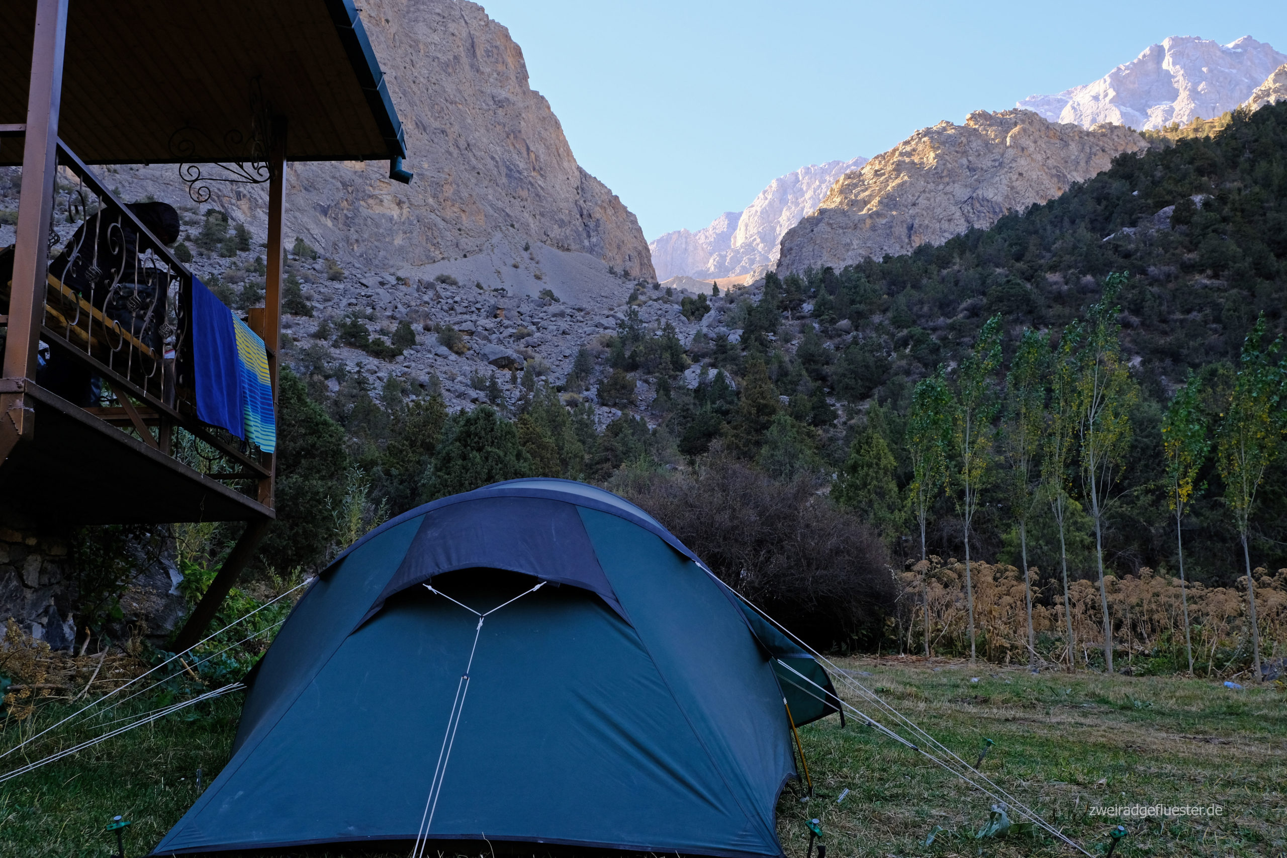 Am frühen Nachmittag erreichen wir das sogenannten Artuch Basecamp, wobei es mehr Hüttencharakter hat. Wir bauen unser Zelt im Garten auf und genießen den Ausblick beim Kochen. Doch schon bald holt uns die Kälte der Berge ein und wir verschwinden im Zelt.
