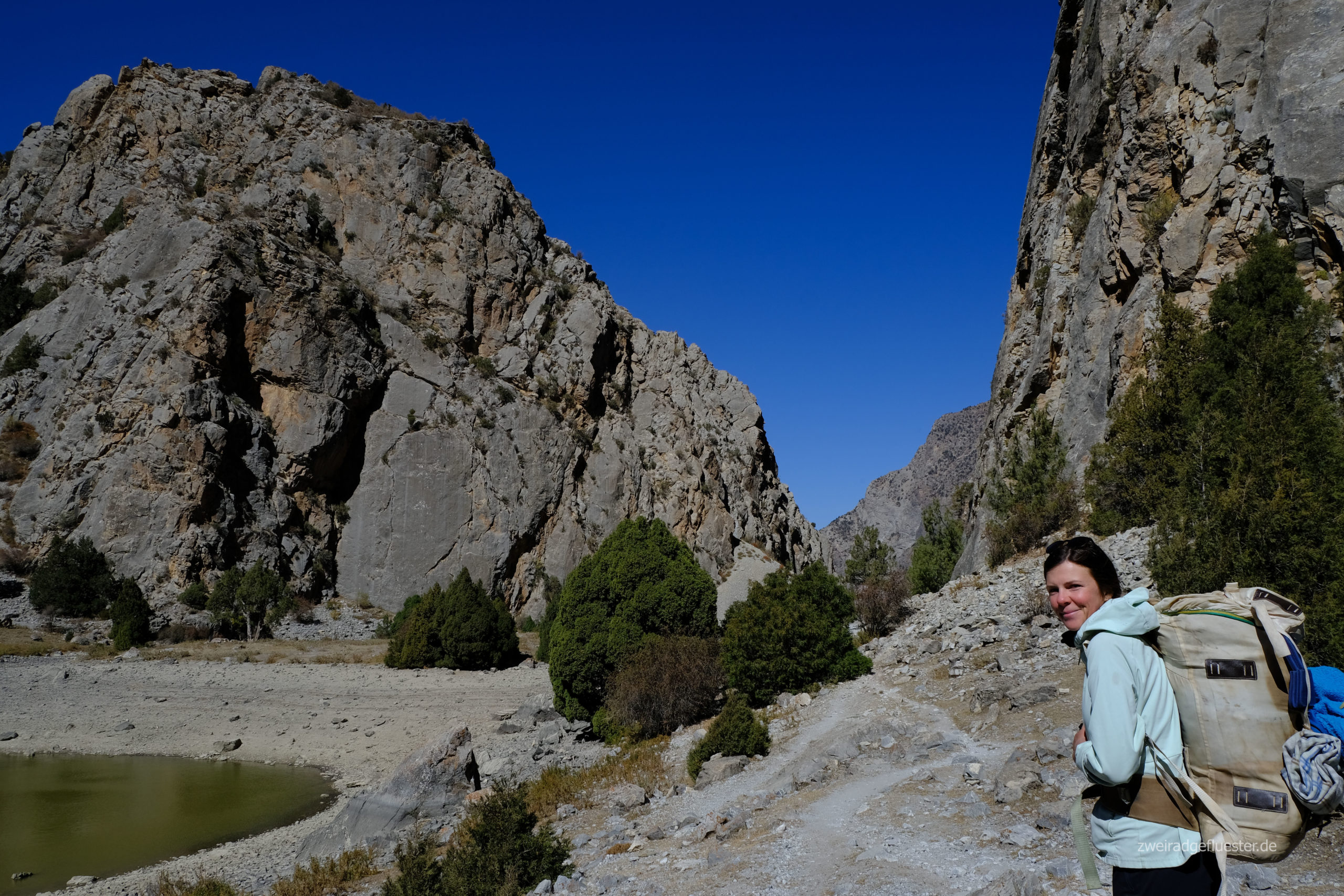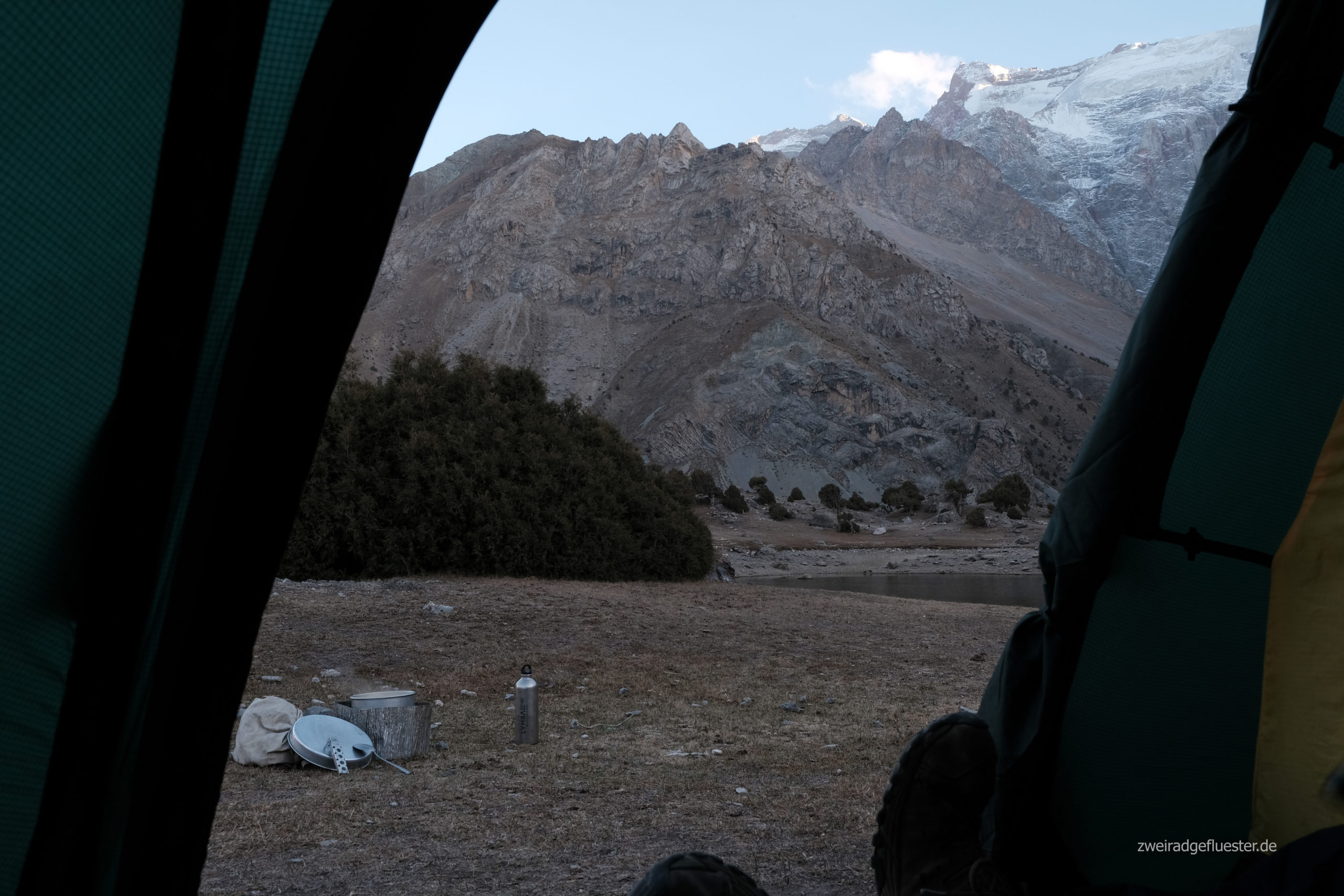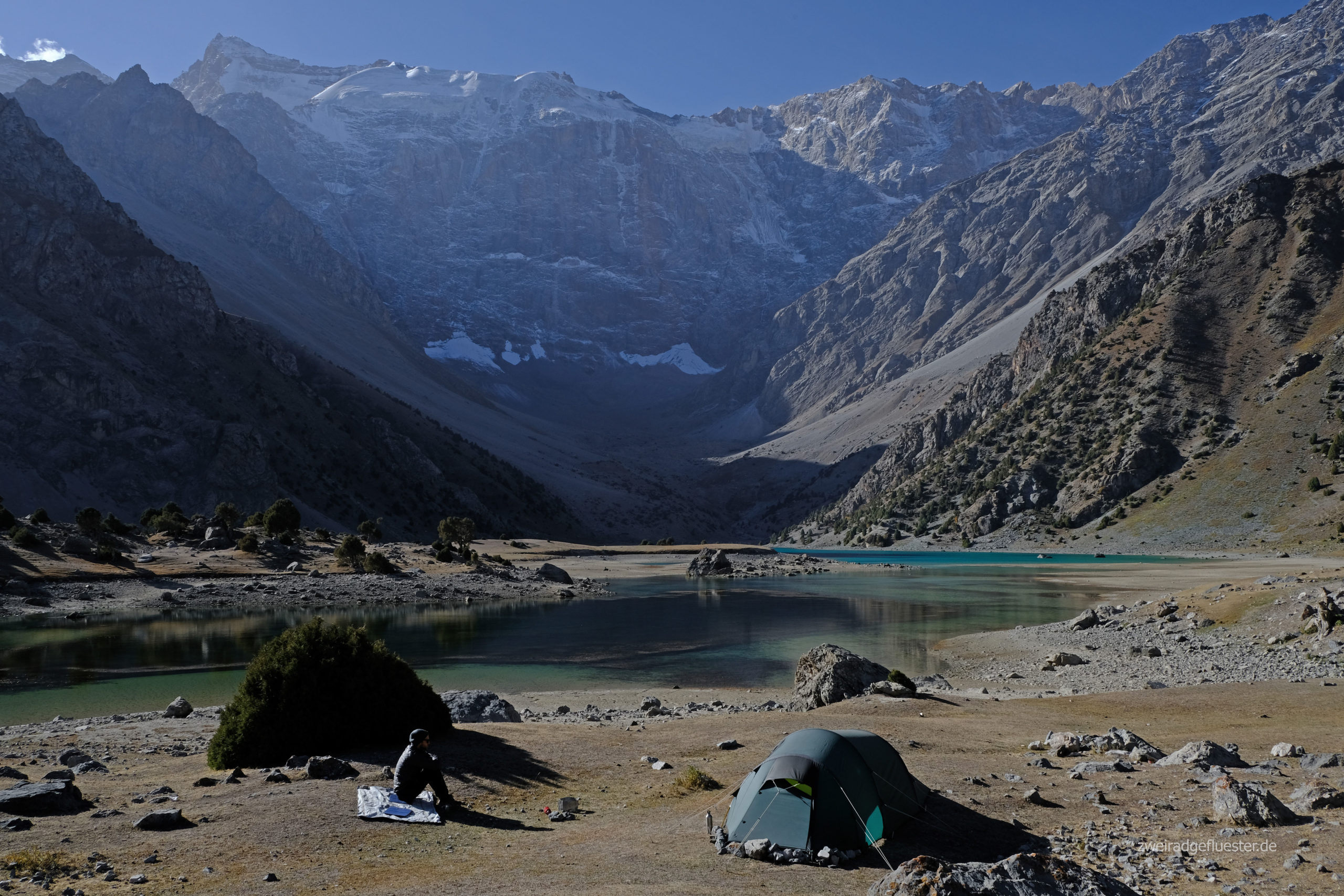 Als wir oben ankommen eröffnet sich uns ein traumhafter Blick auf den Gebirgssee auf ca. 2800 m. Wir sind gerade noch rechtzeitig, bevor die Berge ihre Schatten auf das türkisfarbene Wasser werfen. Wir steigen hinab und bauen unser Zelt vor der unglaublichen Kulisse des Bergmassivs auf und genießen die Stille.