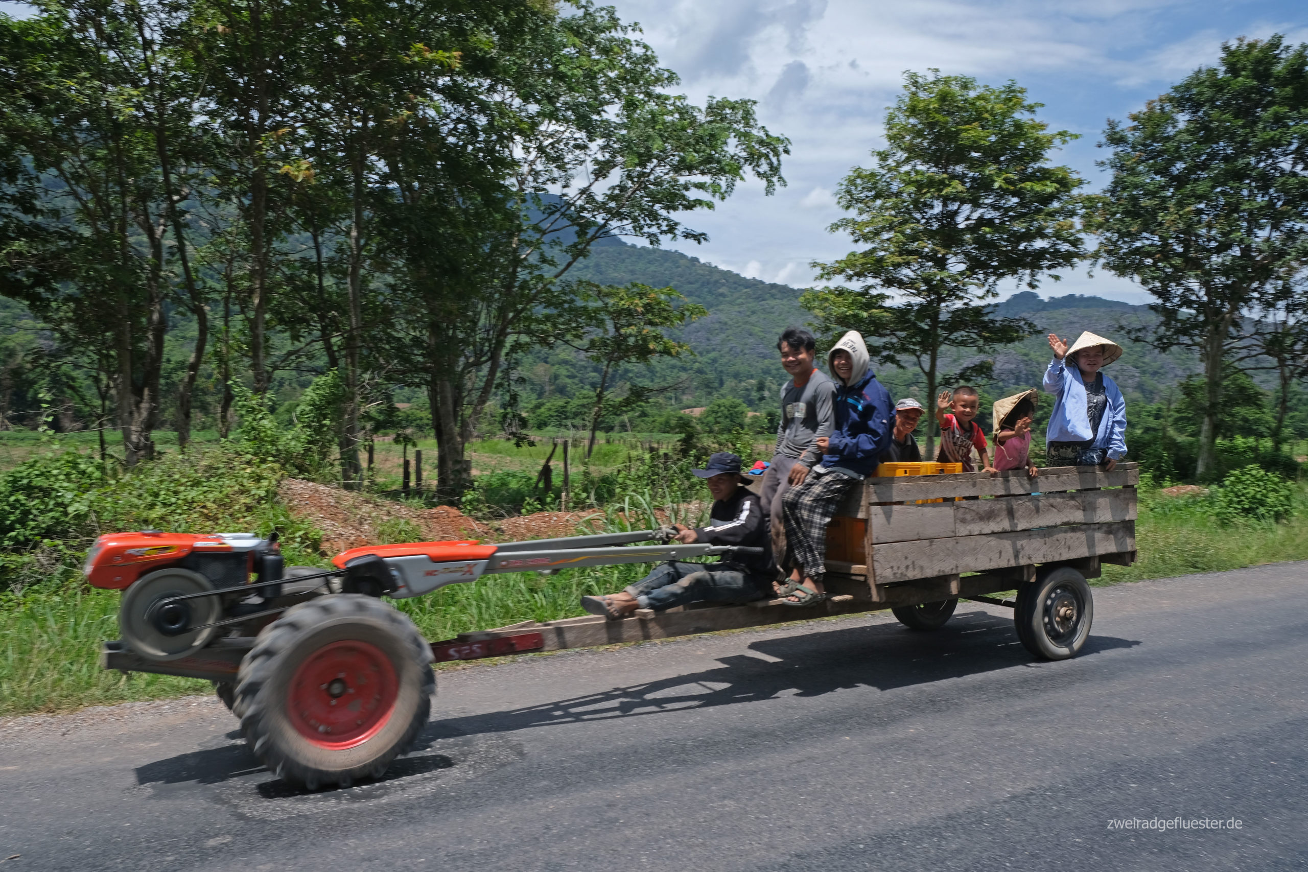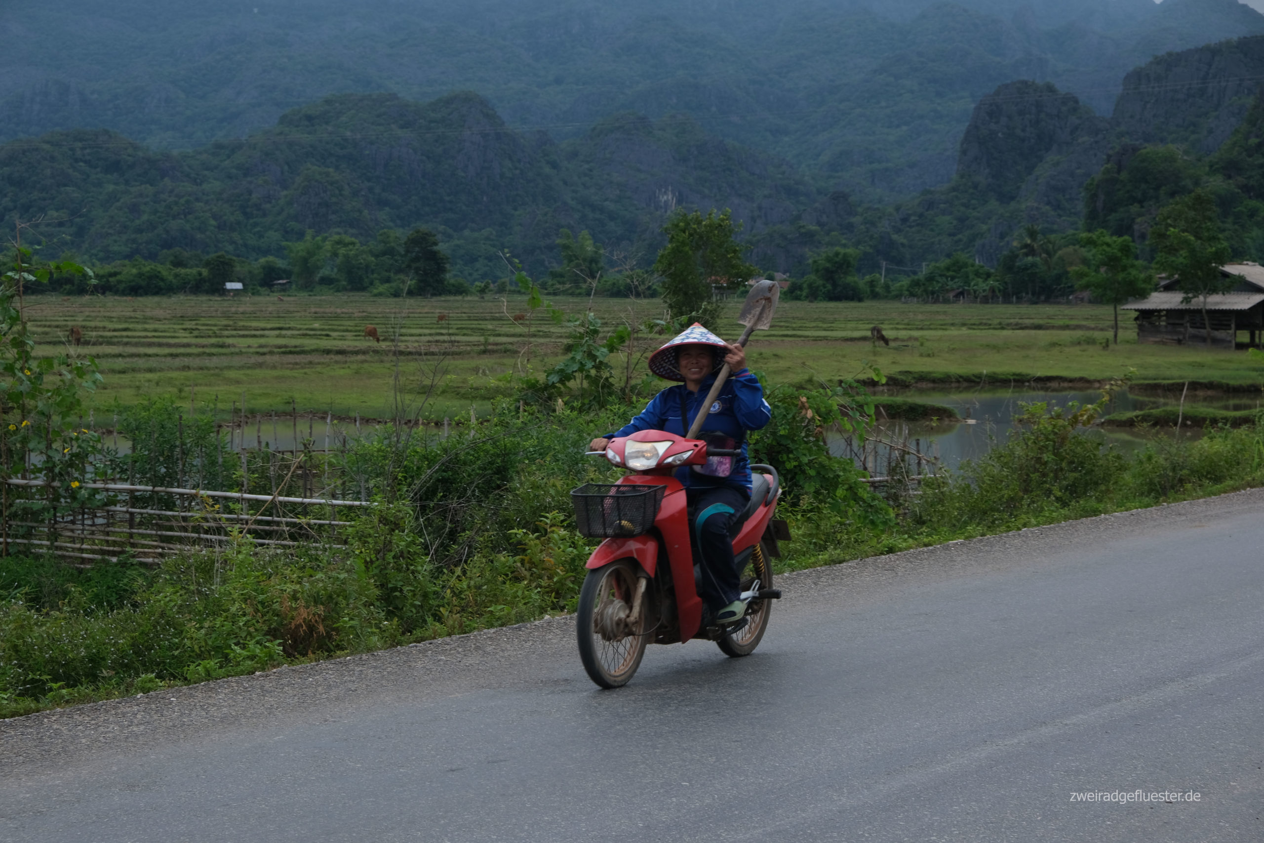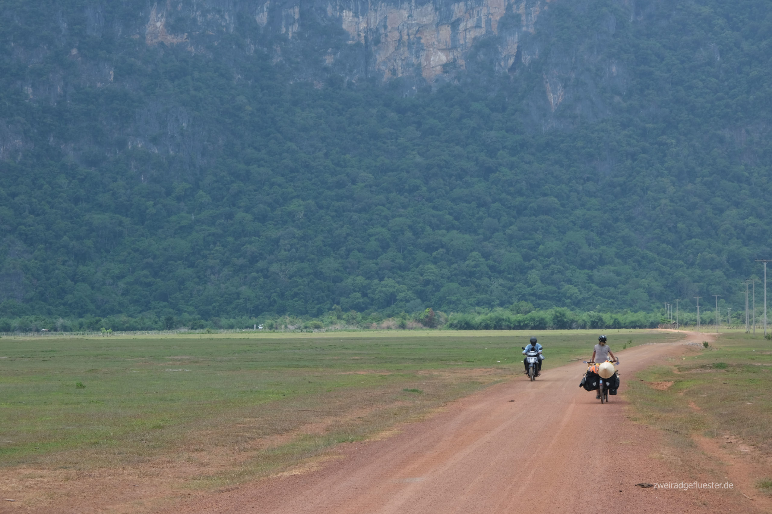 Ein Mann, der hier für eine internationale Organisation arbeitet, erzählt uns, dass hier die höchste Bombendichte des ganzen Landes sei und ihm dieses Ausmaß beim Blick auf seine Drohnenbilder mit all den unzähligen kleinen und großen Kratern noch einmal deutlicher wurde. Auch für uns ist es beim Radeln in dieser paradiesischen Kulisse einfach immer wieder unvorstellbar, was sich hier einst abgespielt hat.