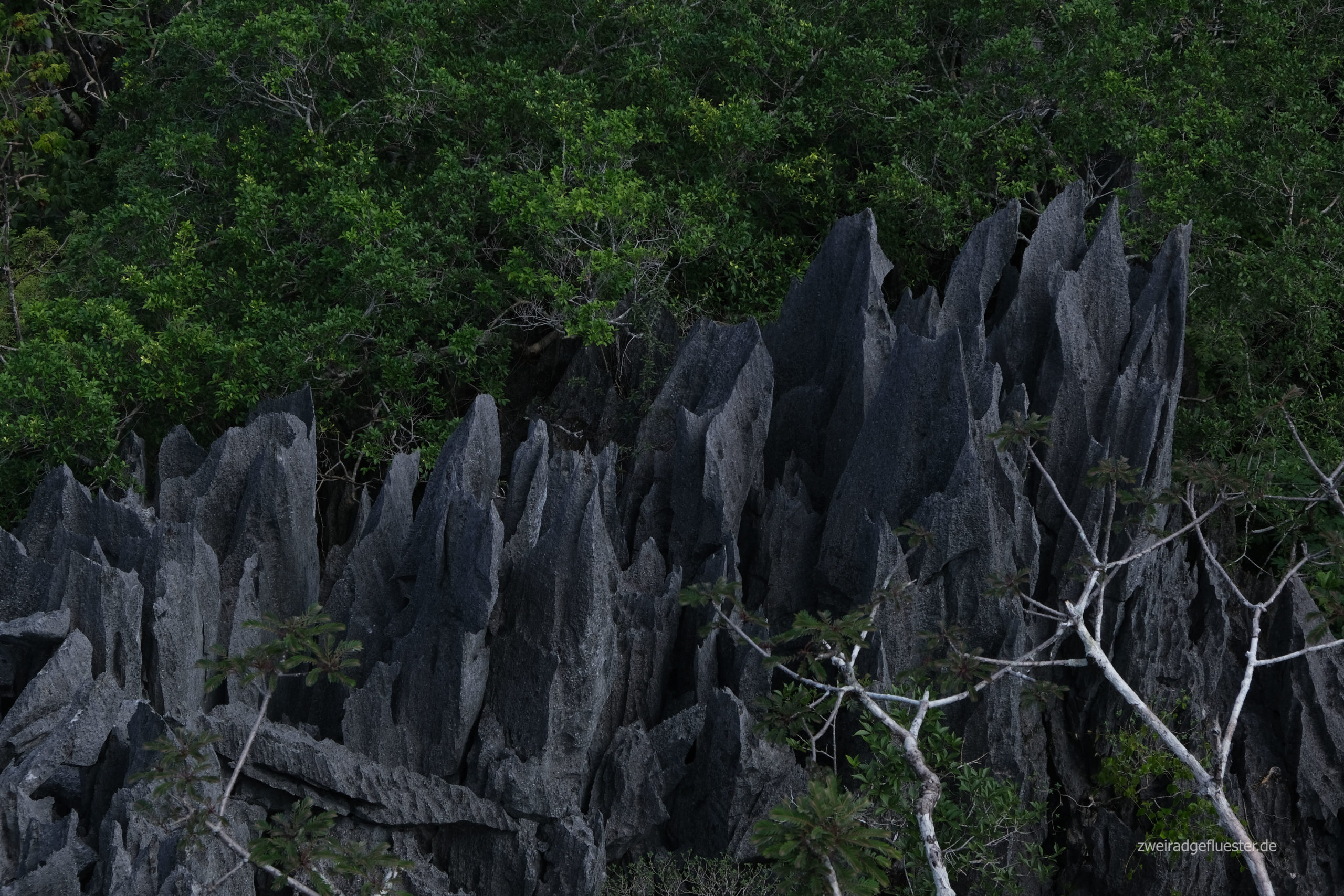 Wir radeln den berühmten, bizarren und spitzen Karstfelsen durch kleine Dörfer entgegen. Schon allein die Anzahl an kleinen Shops zeugt von einer gewissen Zivilisation. Auch weiterhin winken uns die Kinder hochmotiviert vom Straßenrand entgegen und die Dorfbewohner*innen begrüßen uns herzlich. Der Schatten, der hier von den nicht abgefackelten Bäumen auf uns fällt, tut sehr gut und wir radeln direkt mit neuer Energie und irgendwie beflügelt den ersten, steilen Anstieg durch einen wunderschönen Regenwald hinauf.