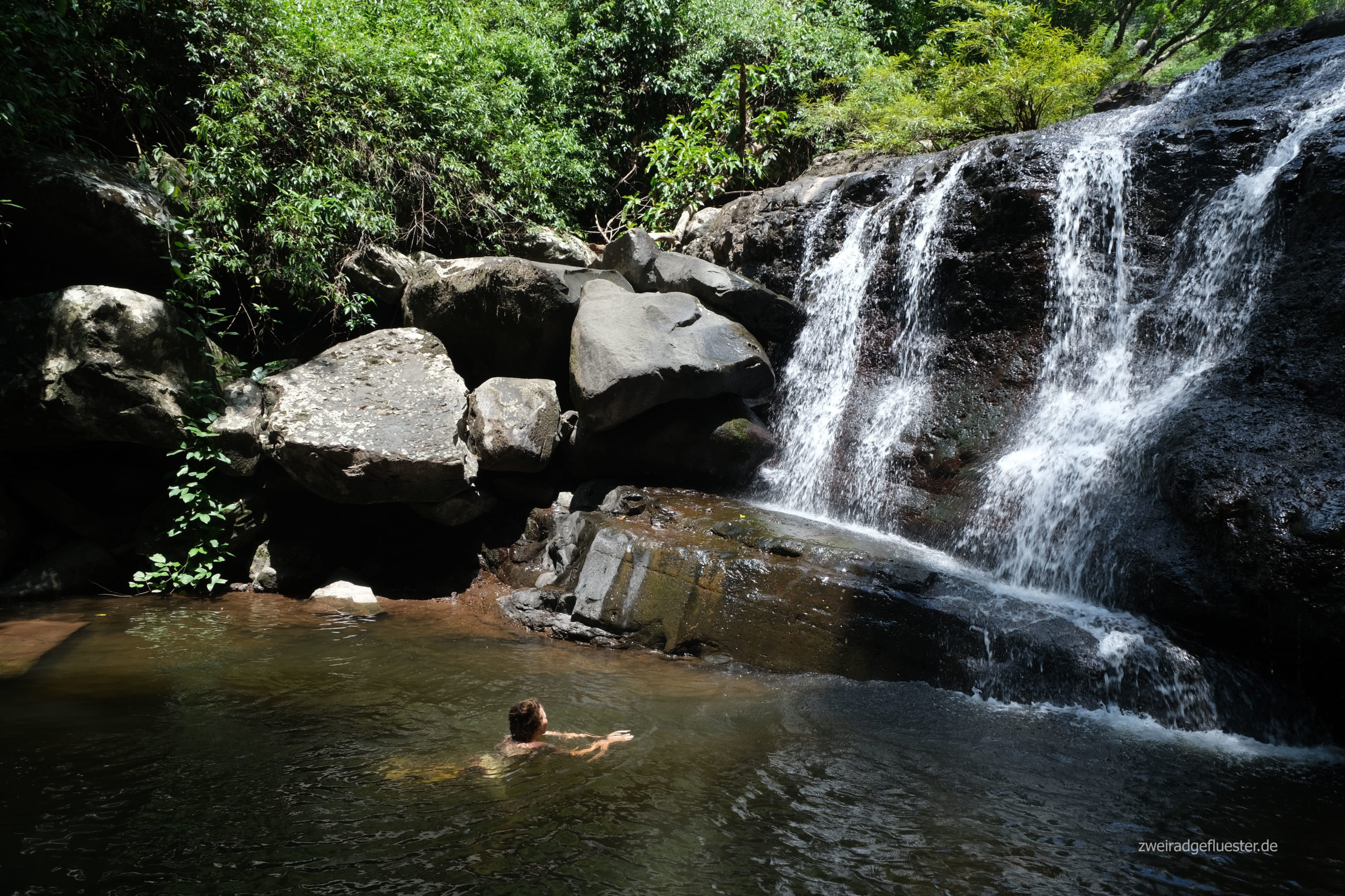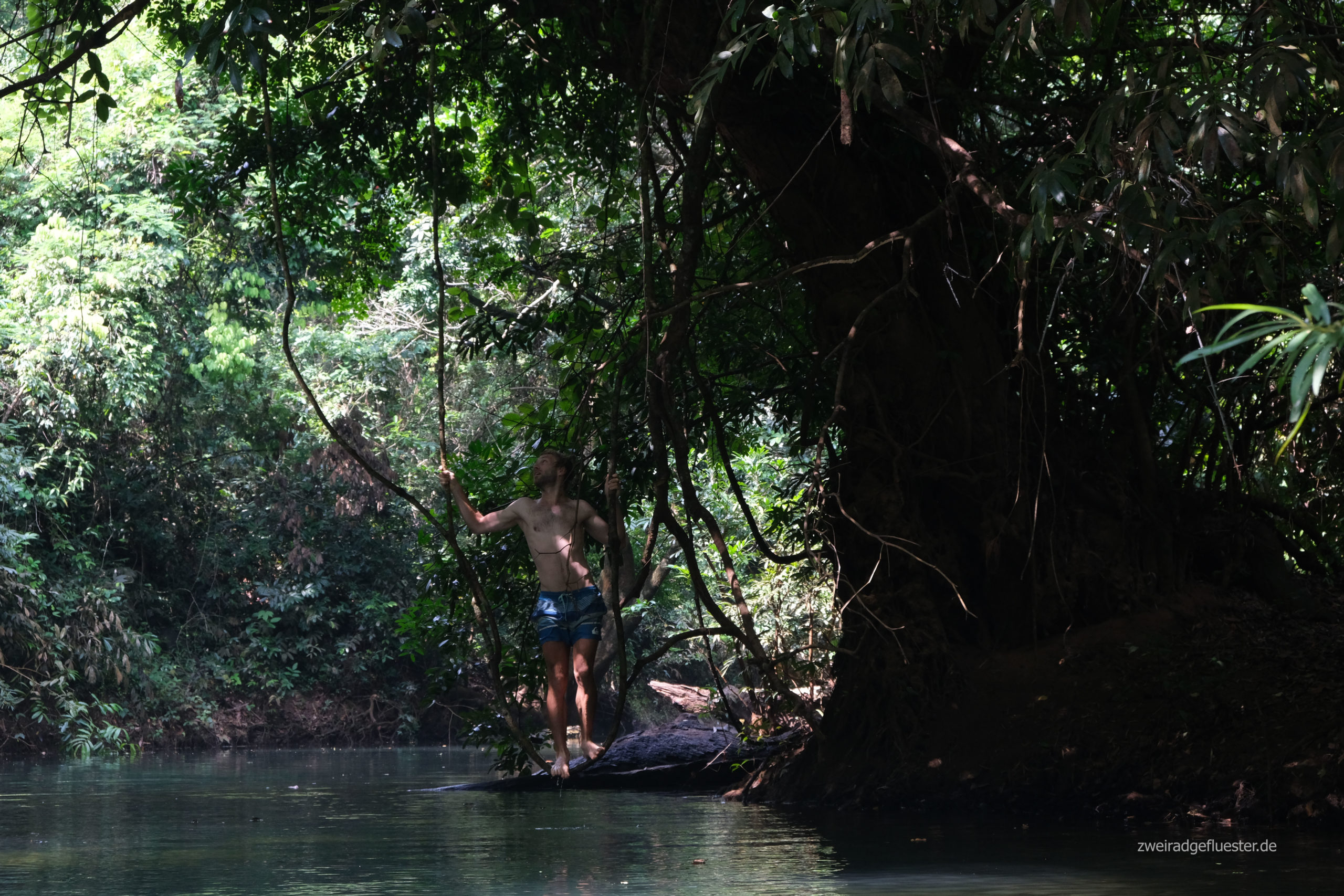 Dachten wir zumindest, denn unser Ausflug zum Nam Sanam Wasserfall am nächsten Morgen wird doch noch ein größeres Abenteuer als gedacht. Als wir mit den Rädern nicht mehr weiterkommen, schlagen wir uns irgendwie zu Fuß durch den dichten Dschungel vorbei an unzähligen, wunderschönen Baumriesen. Bei der Ankunft sind wir völlig verschwitzt, aber die Strapazen sind schnell wieder vergessen, denn wir haben den Wasserfall in dieser atemberaubenden Naturkulisse ganz für uns allein. Im kühlen Nass lässt es sich gut aushalten, bevor es durchs Gestrüpp wieder zurück zu unseren Rädern geht.
