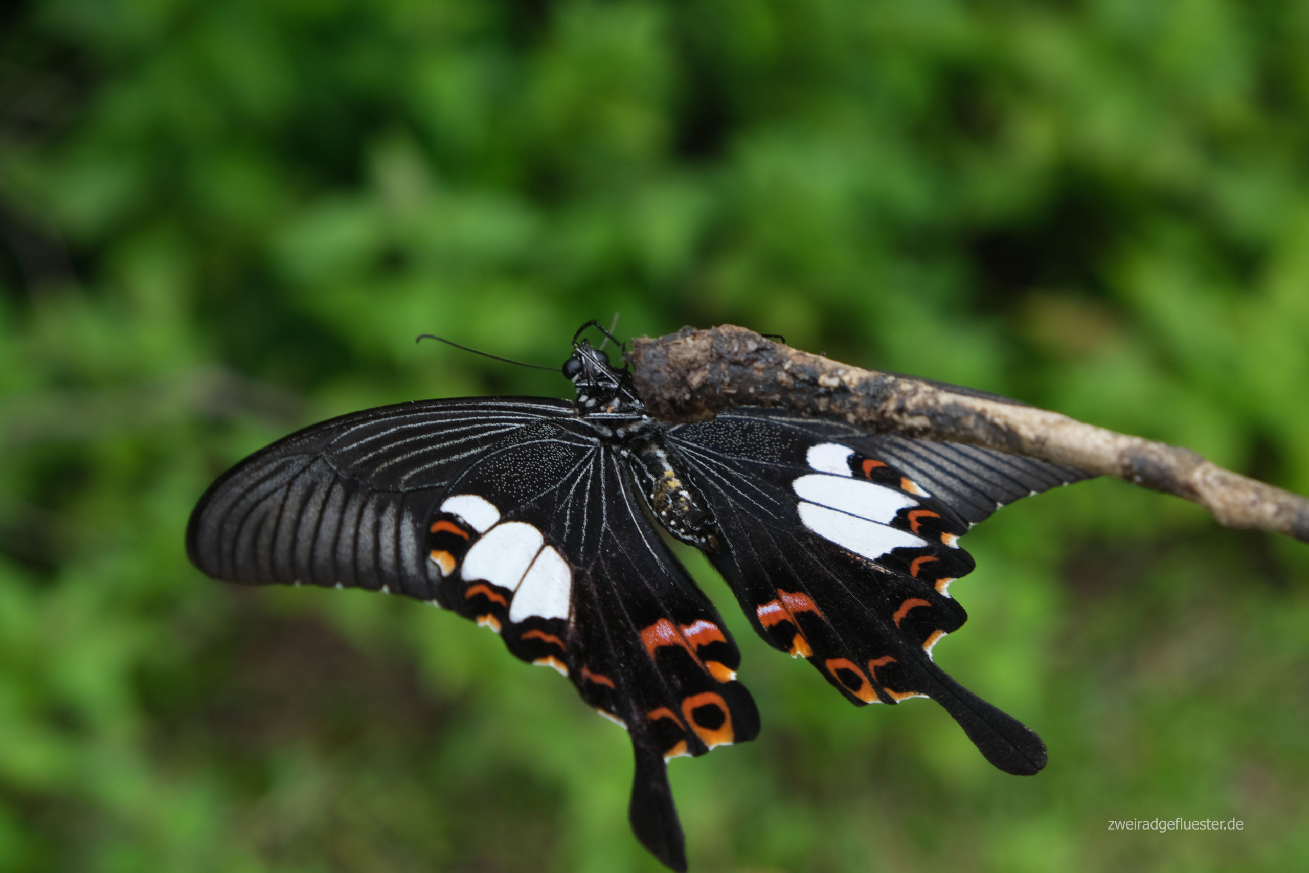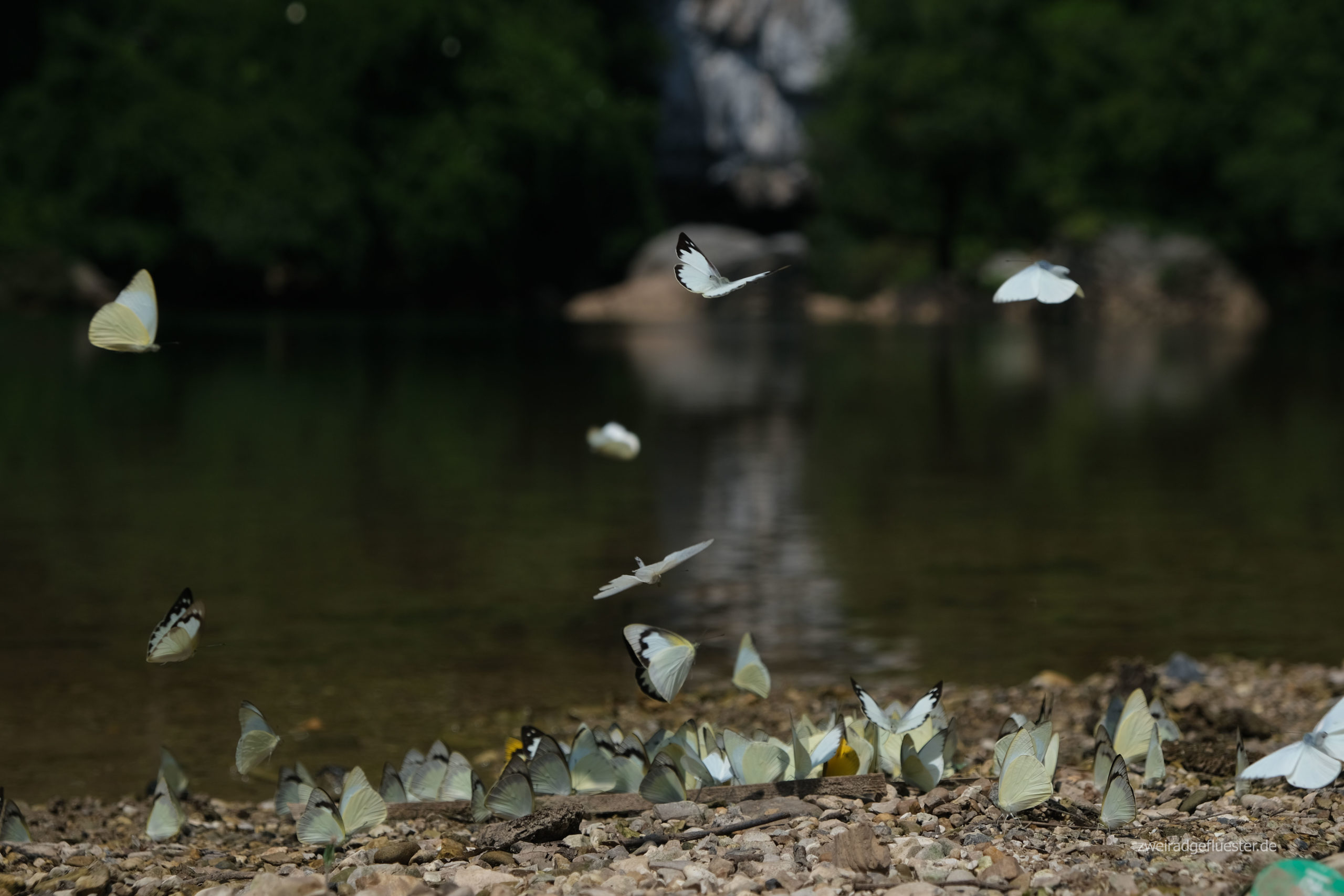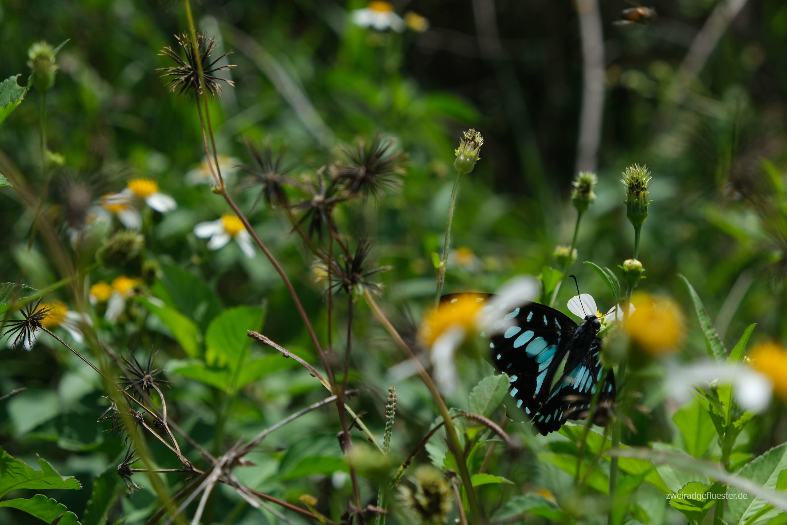 Auf unserem Weg werden wir immer wieder von wunderschönen und teilweise riesigen Schmetterlingen begleitet, die in einer enormen Geschwindigkeit um uns herumflattern. Manchmal werden sie von den motorisierten Gefährten verletzt und wir retten sie von der Straße. Bei ihren ruckartigen, flinken Bewegungen ist das die einzige Möglichkeit, sie fotografisch festzuhalten.