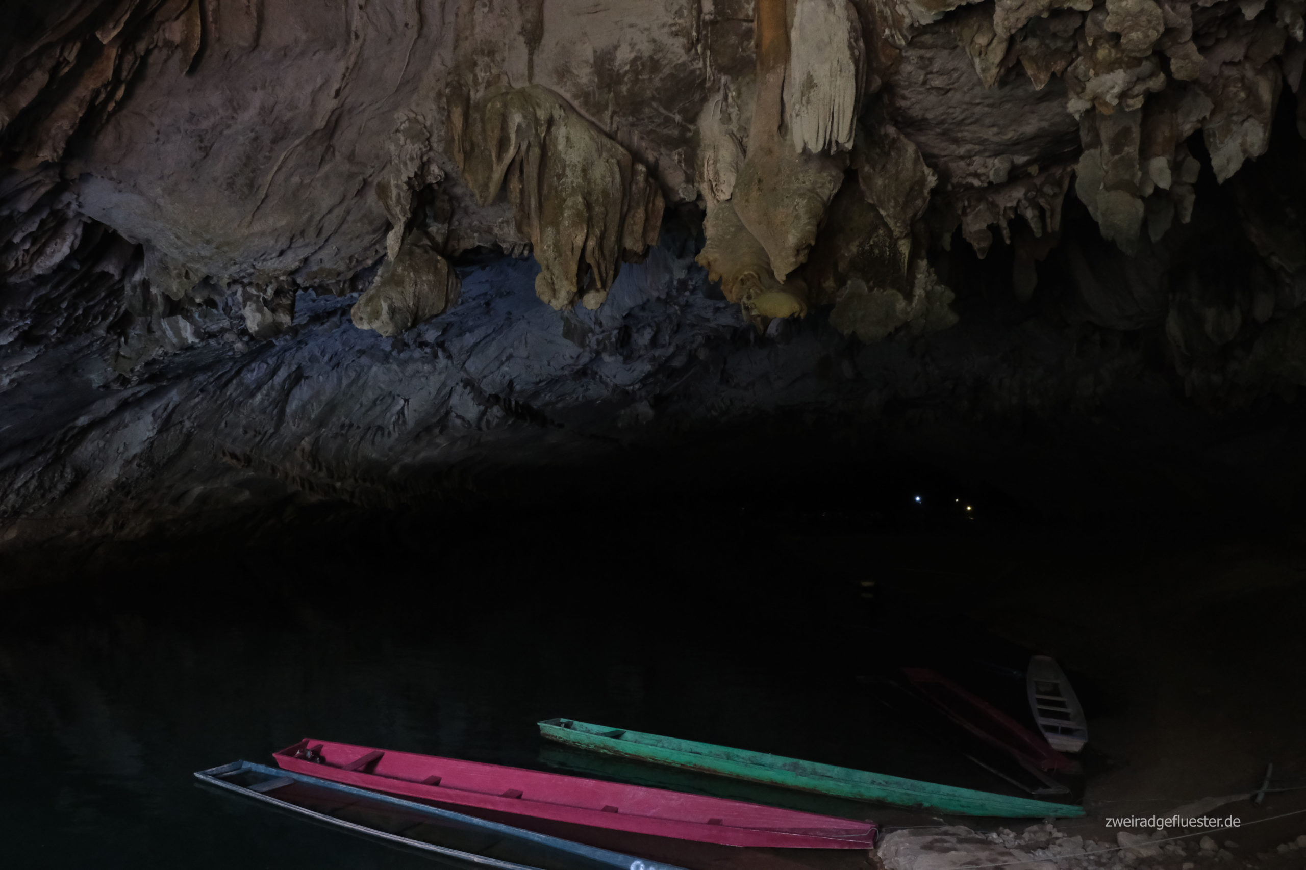 Auf einem kleinen, länglichen Holzboot mit Motor geht es ins Dunkel. Es ist ziemlich faszinierend, denn seit der Erkundung der Höhle, ist dies keine Sackgasse mehr und man erreicht nach einer ca. sieben Kilometer langen Flussfahrt die andere Seite.