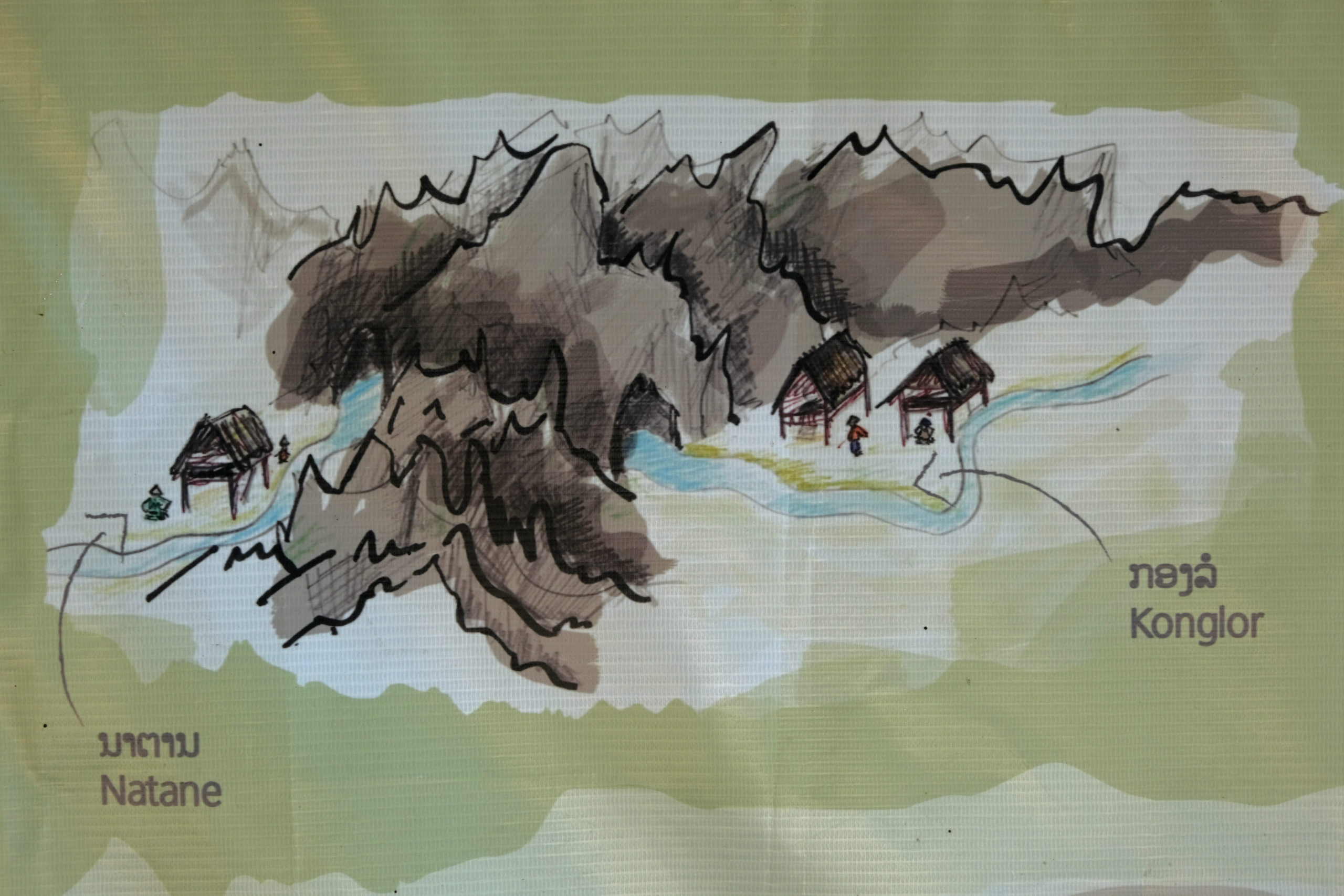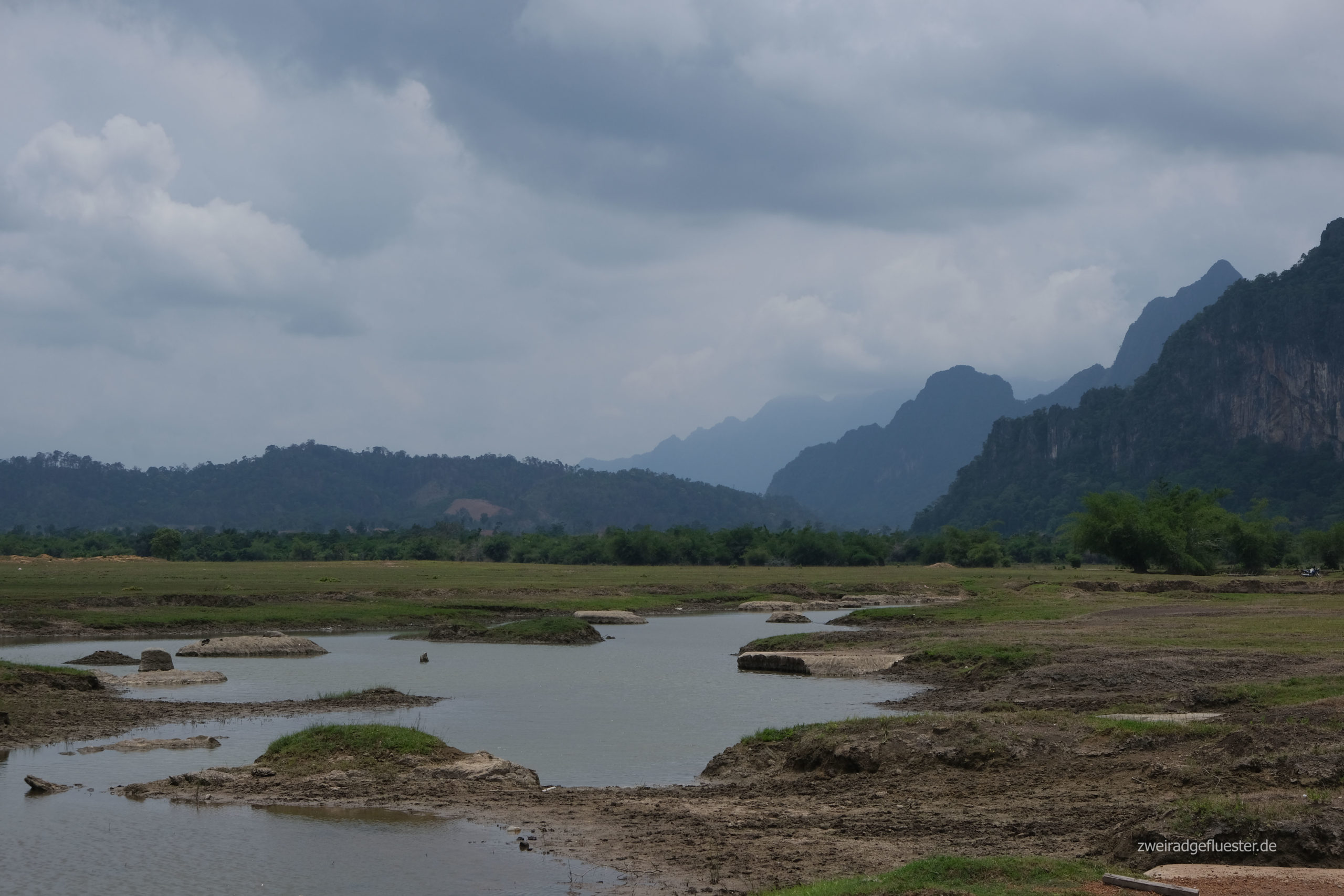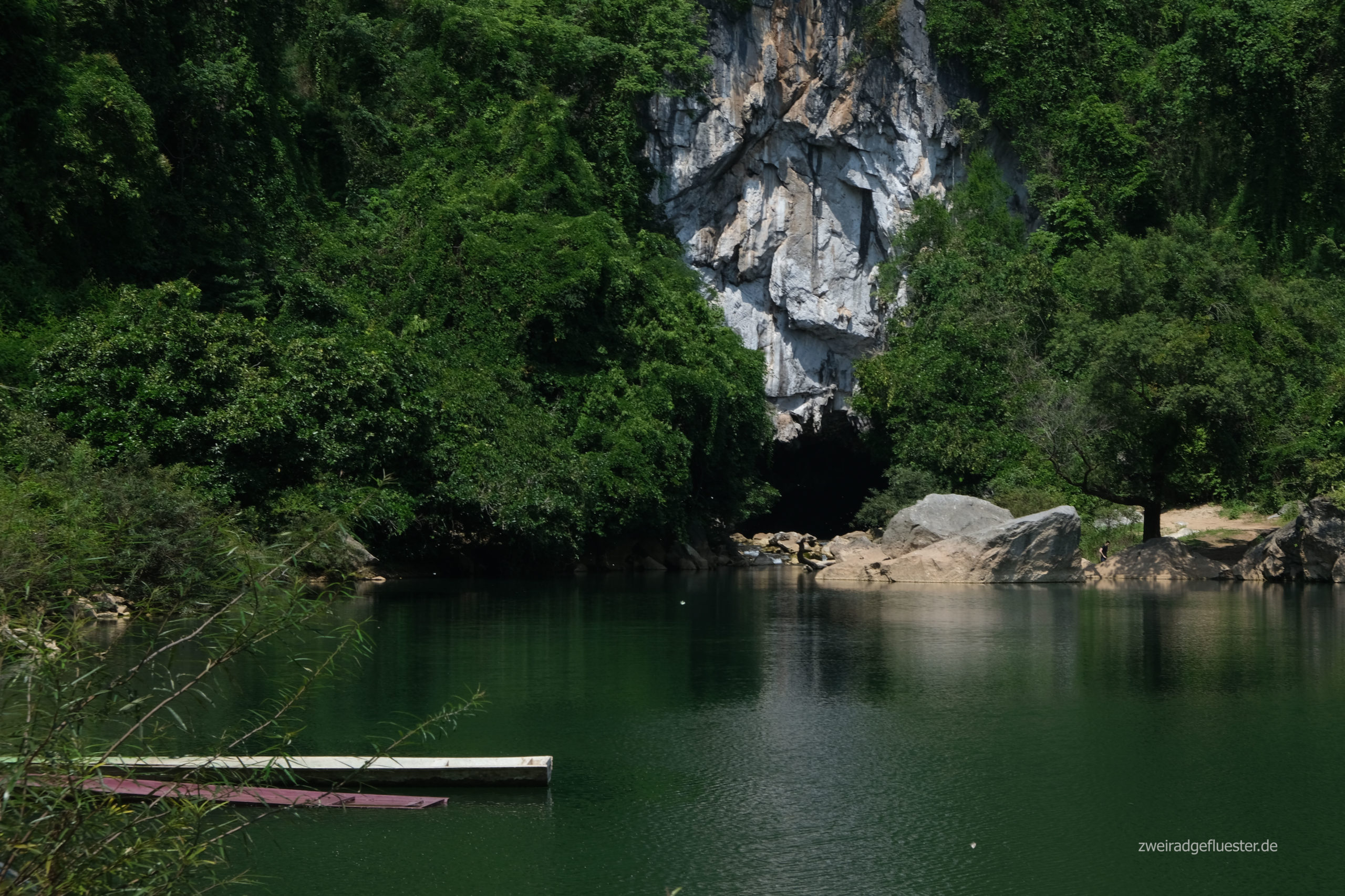 Von Nahin sind wir ca. 40 Kilometer bis nach Kong Lor geradelt. Eine Sackgasse, zumindest für uns, aber ein wunderschöner Umweg. Die Strecke verläuft durch ein flaches Tal, deren Flanken aus Karstfelsen bestehen. Das Tal wird immer enger und am Ende steht man tatsächlich in einer natürlichen Sackgasse. Nur der Fluss, der Nam Hinboun, kennt den weiteren Weg und verschwindet in einem kleinen Höhlenschlund.