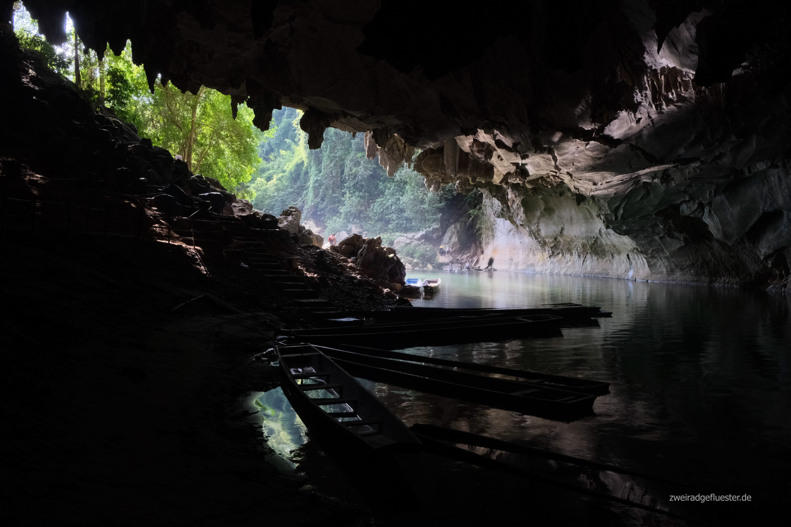 Die Fahrt durch die Höhle ist faszinierend.  Teilweise müssen wir aussteigen, denn das Boot muss aufgrund des Niedrigwassers der Trockenzeit über die flachen Stellen gezogen werden. Wir laufen über einen Sandstrand. Ohne unsere Stirnlampen wäre es hier stockdunkel. Von der Decke tropft das Wasser, neben dem plätschernden Fluss das einzige Geräusch.
