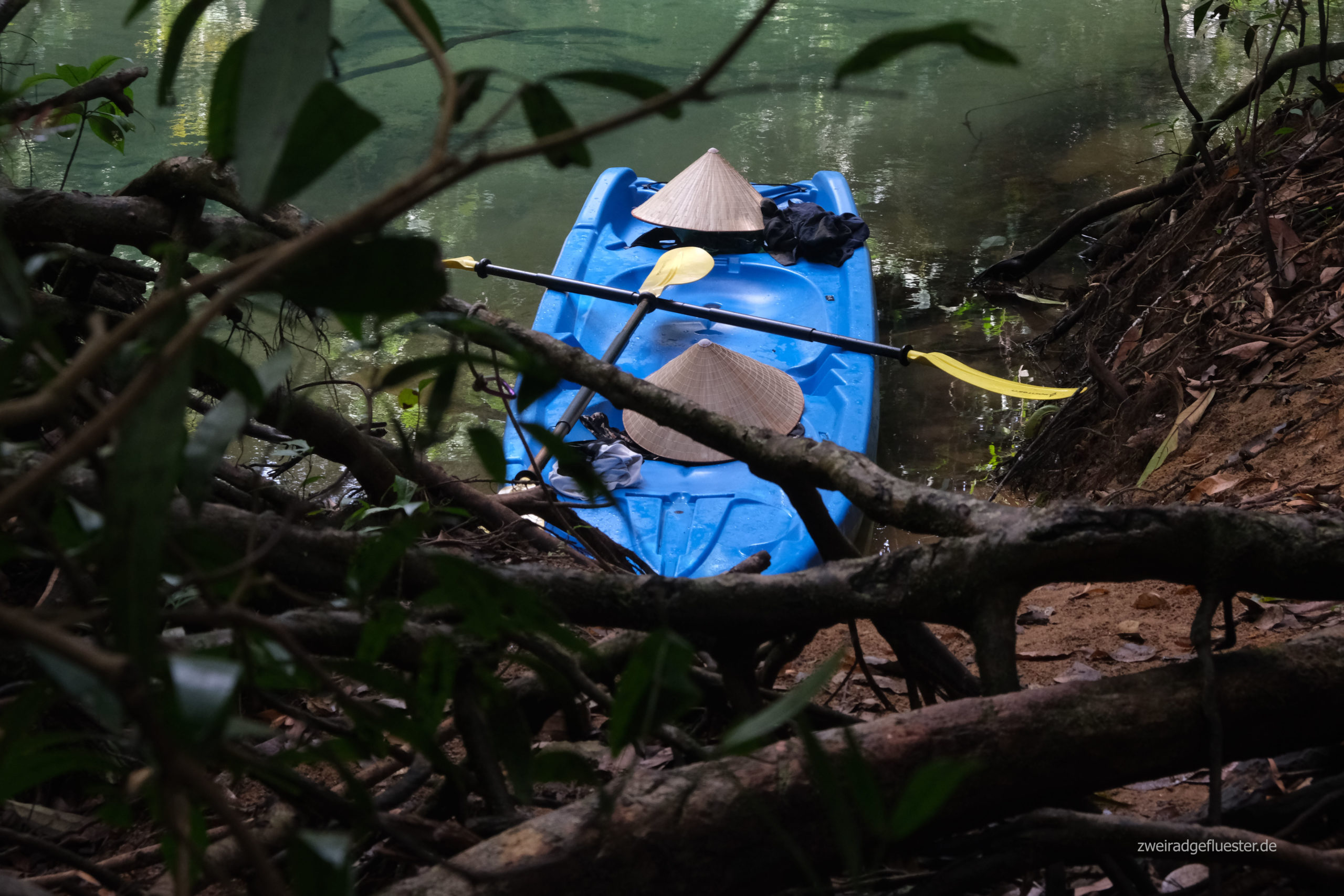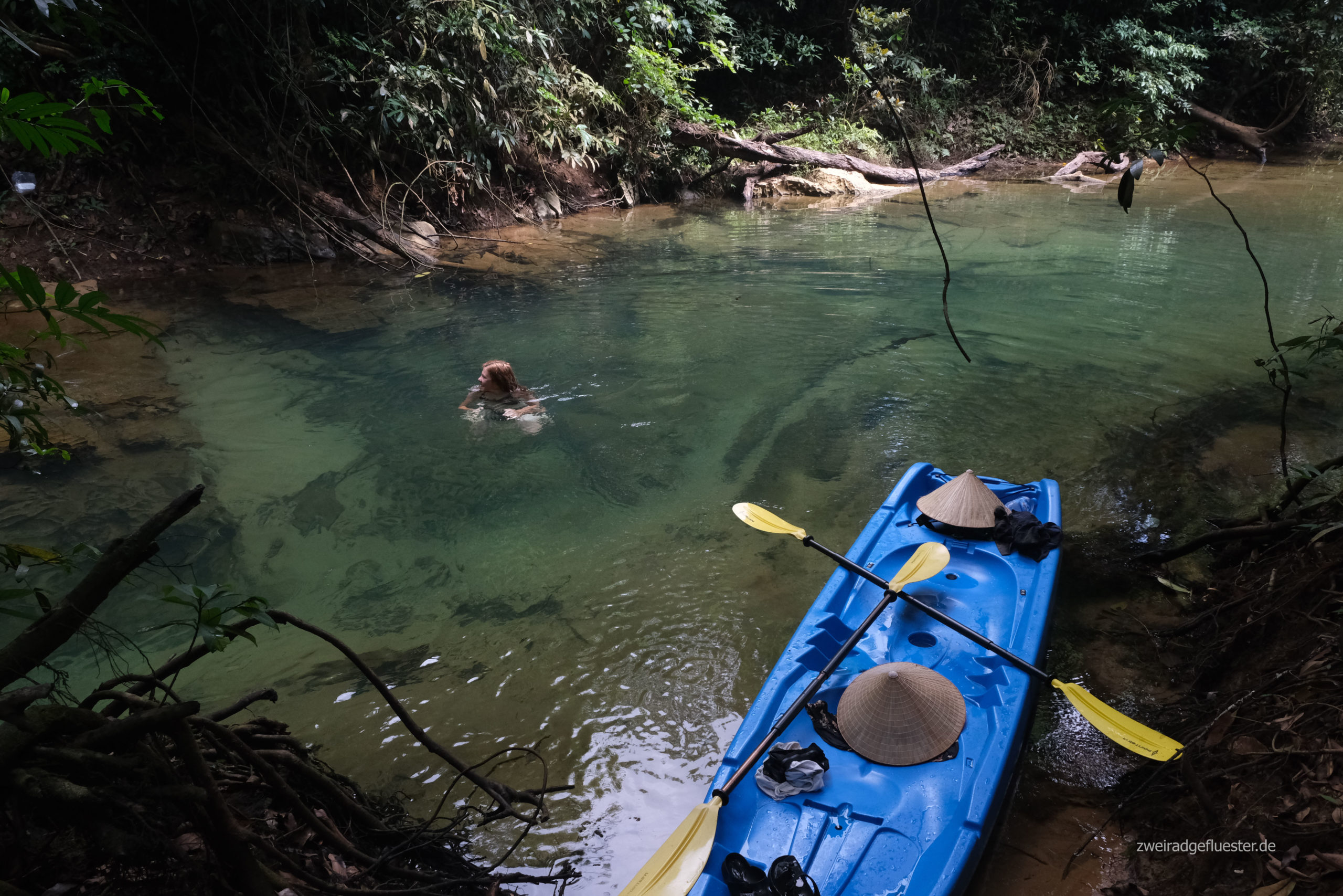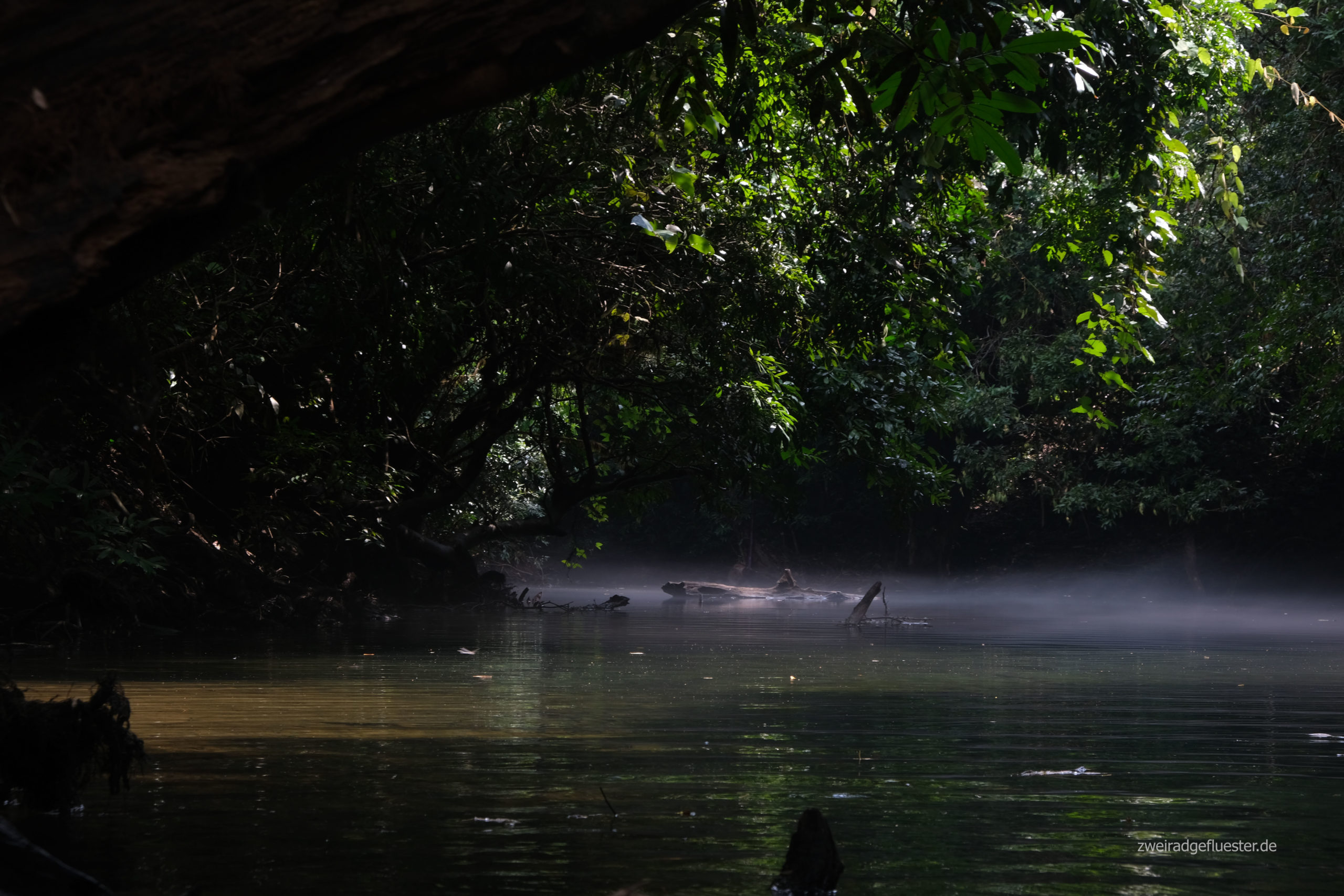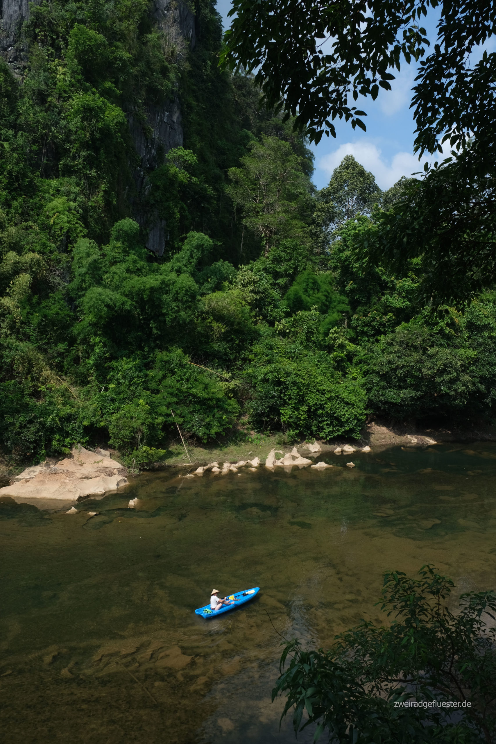 Mit einem Kajak erkunden wir am nächsten Morgen einen Seitenarm des Nam Hinboun. Wir gleiten über das ruhige und spiegelglatte Wasser, bedeckt mit einer leichten Nebelschicht. Ab und an flackern die Sonnenstrahlen durch die Blätter hindurch. Die Vegetation greift nach dem Fluss. Bäume ranken hinüber, bilden einen Tunnel aus Grün, Lianen hängen herunter und auch aus dem Wasser spießen alte Bäume heraus, Treibholz. Hebt man den Blick über die Baumkronen erspäht man die bewachsenen Karstfelsen. Es ist eine so wunderschöne Szenerie.