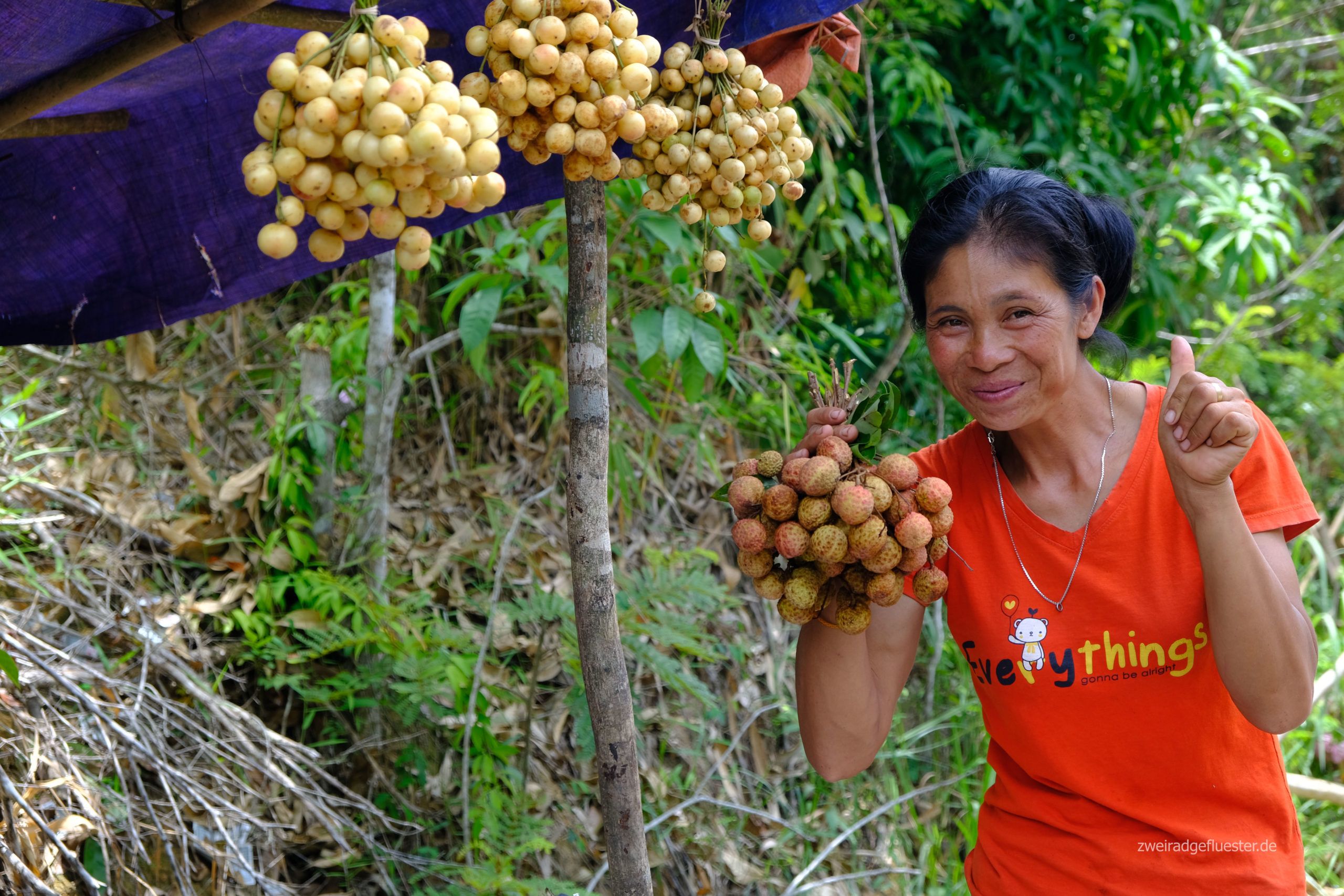 Für uns geht es weiter gen Osten. Schon bald legen wir einen kleinen Zwischenstopp an der Straße ein, um etwas abzuholen. Wir haben nämlich ein Kleid in der netten Unterkunft am Fluss liegenlassen. Leider würde die Rückfahrt bedeuten, dass wir wieder über den Berg müssen. Der nette Opi hatte dann am Telefon gestern Abend gleich die Idee, es uns mit einem Paket hinterherzusenden, aber nicht etwa mit der Post, wie wir es kennen. Er hat es in eine Plastiktüte gestopft und bei einem songthaeo abgegeben, welches in unsere Richtung fährt.