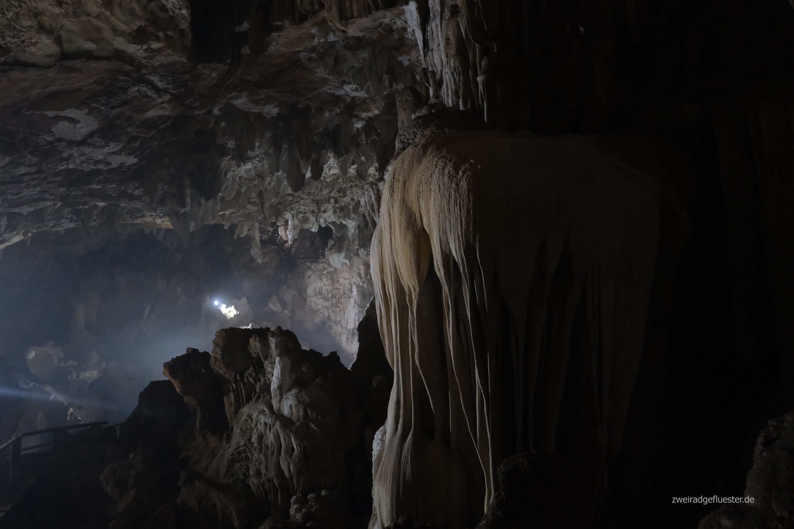 Zunächst sind ein paar Meter geduckt auf einem Holzsteg zu überwinden, bevor man in einer sehr eindrucksvollen Halle landet. Dort angekommen kann man die große Kammer voller Stalaktiten und Stalagmiten auf eigenen Wegen erkunden. Die Besichtigung wird für uns beide ein Highlight, da wir die Höhle jeweils ganz für uns allein haben. Nur ein paar Fledermäuse flattern herum. Ansonsten ist es komplett still und man hört einzig und allein das hallende Tropfen von den feuchten Wänden.