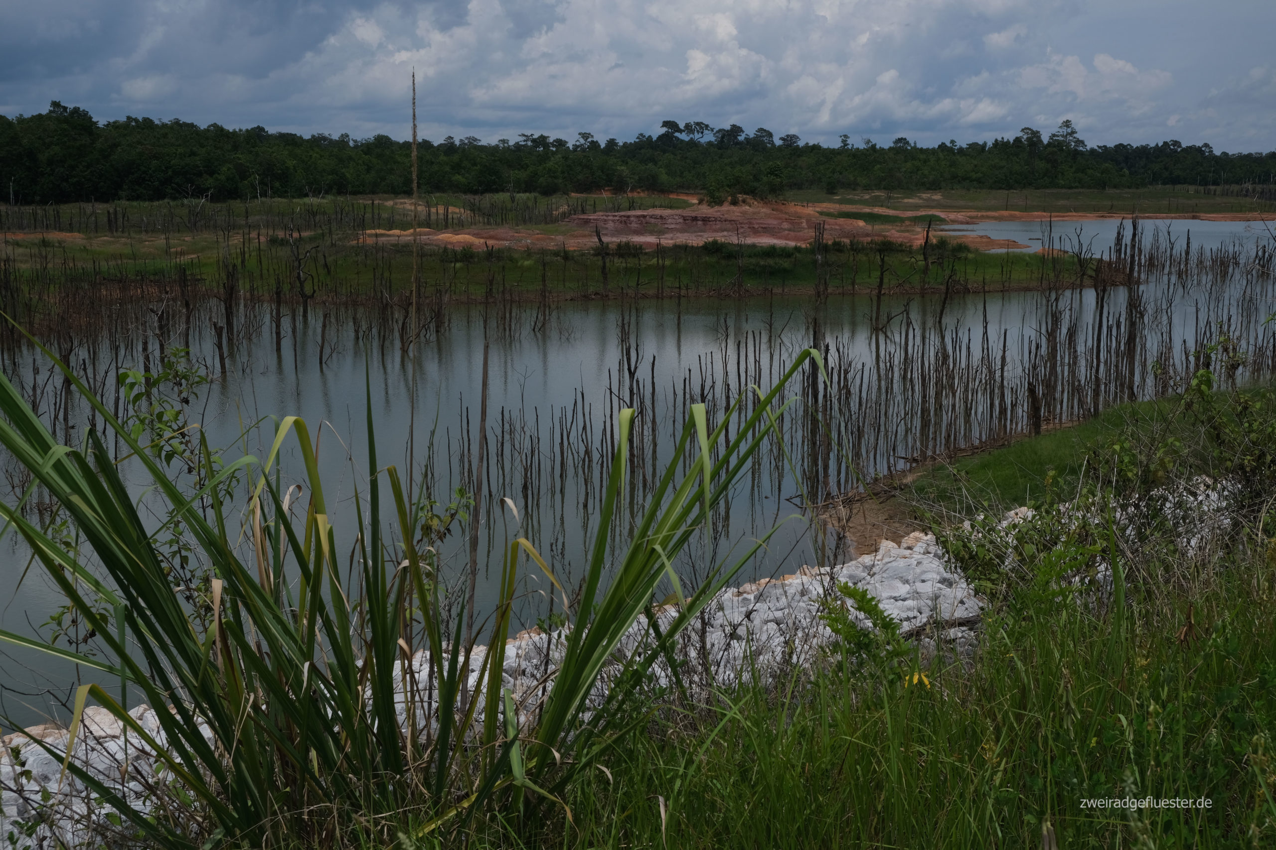 Durch die vielen, abgestorbenen Bäume erinnert uns der flache Stausee eher an ein Moor. Das Bild wirkt ein wenig trostlos und wir fragen uns, was dieses Projekt wohl für soziale und ökologische Folgen mit sich bringt.
